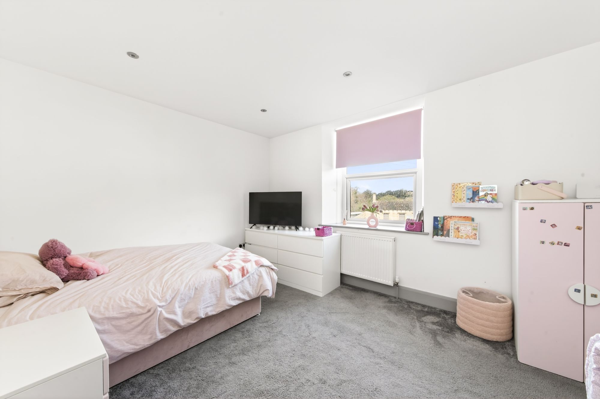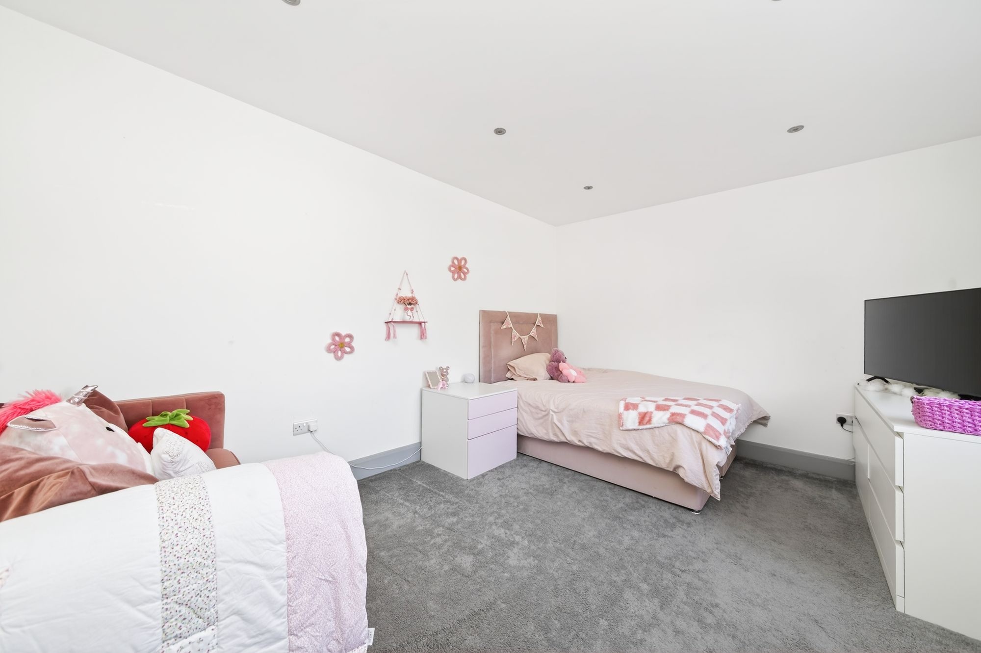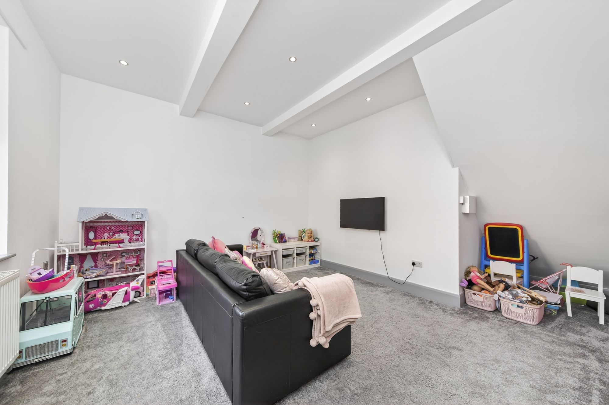 The lounge is currently utilised as a playroom but is, once again, a large room with a pleasant outlook to the front, a high ceiling height and inset spotlighting.