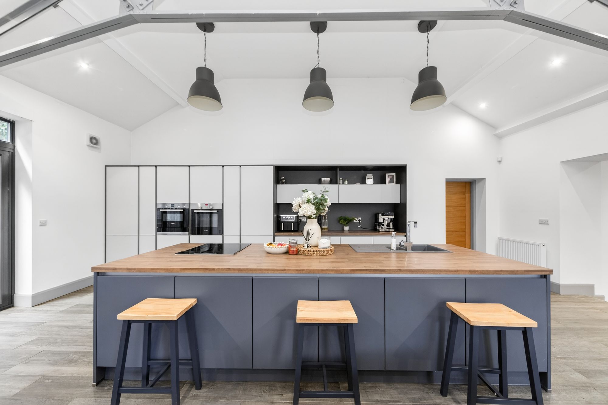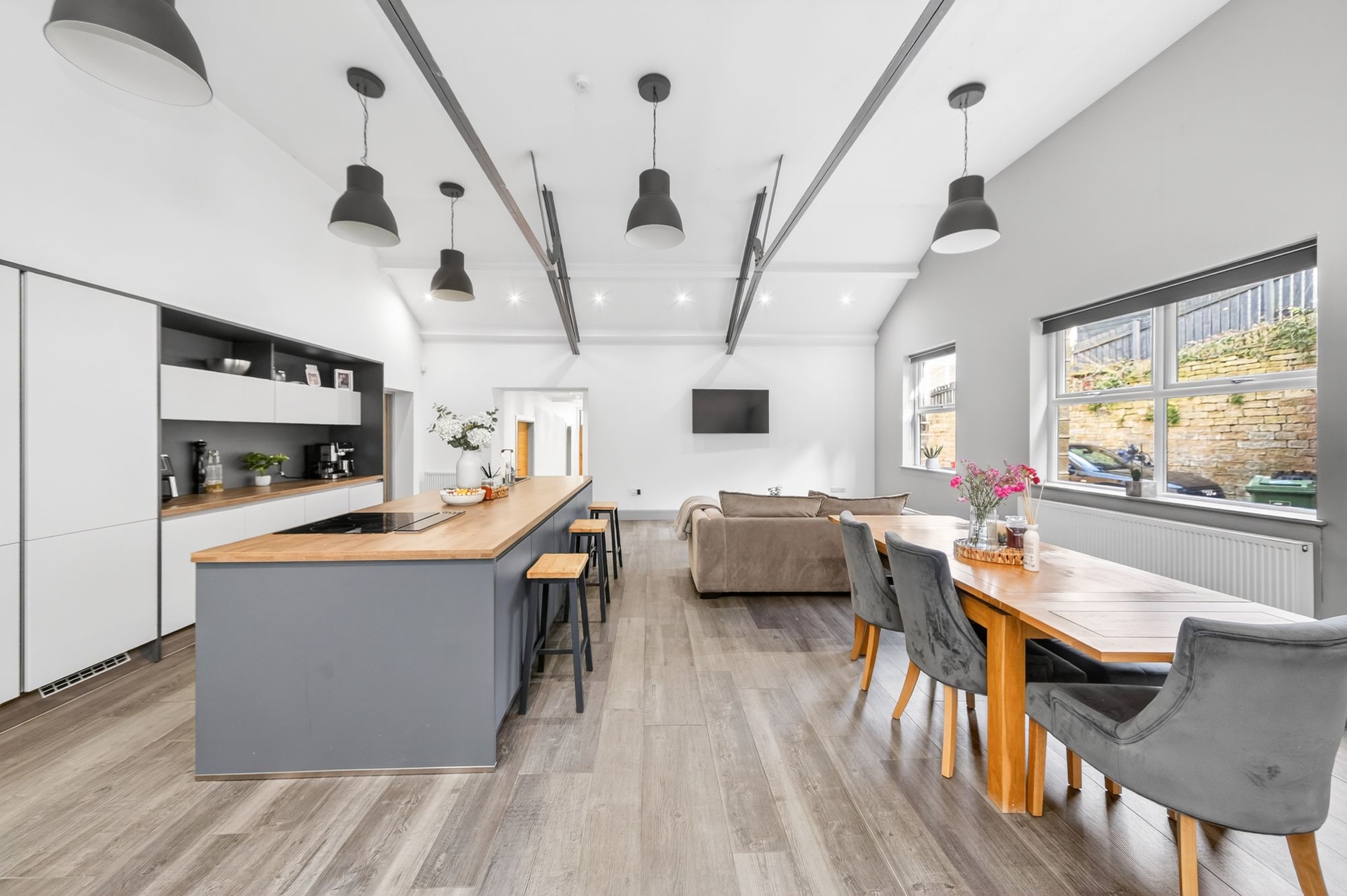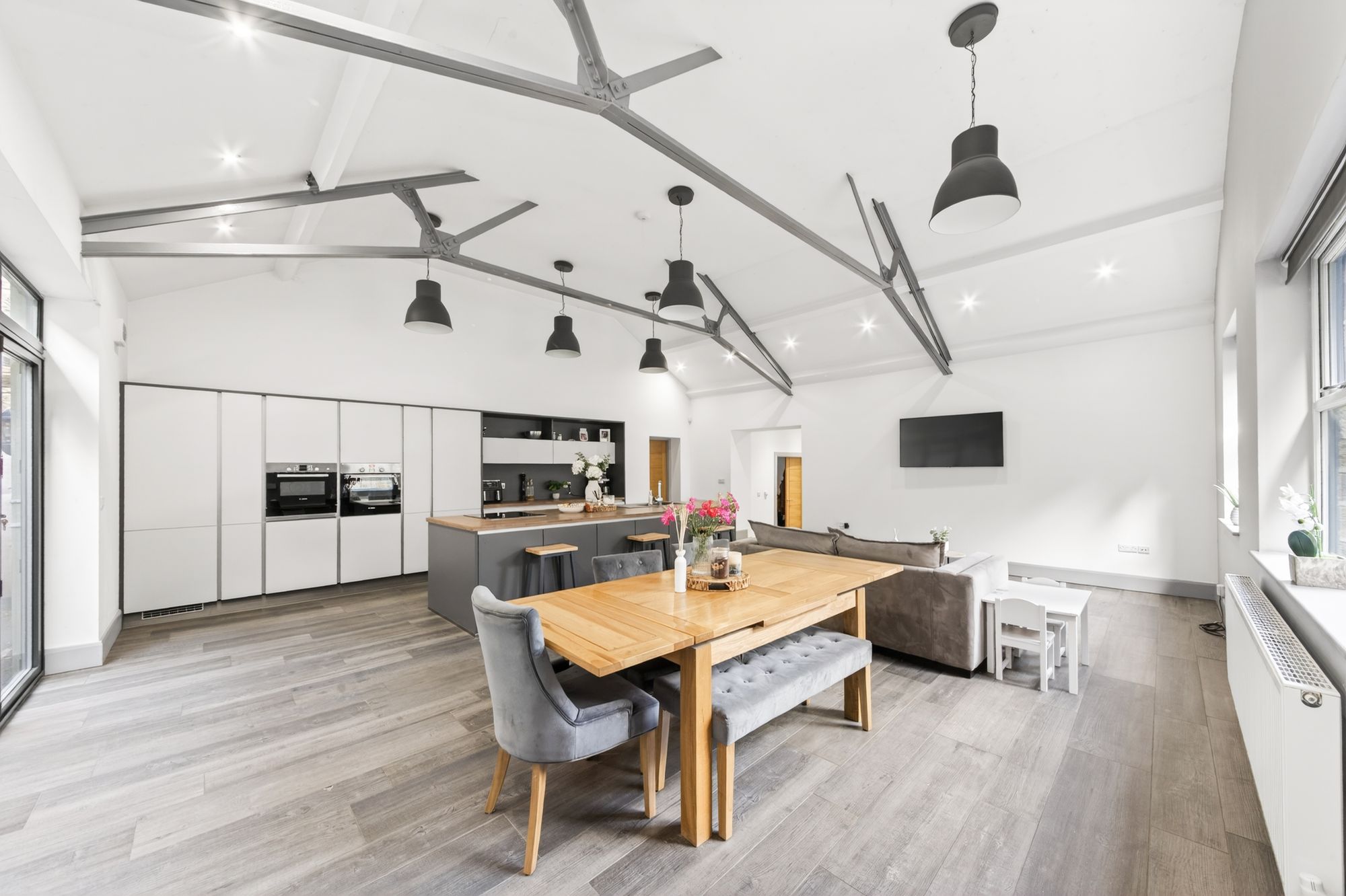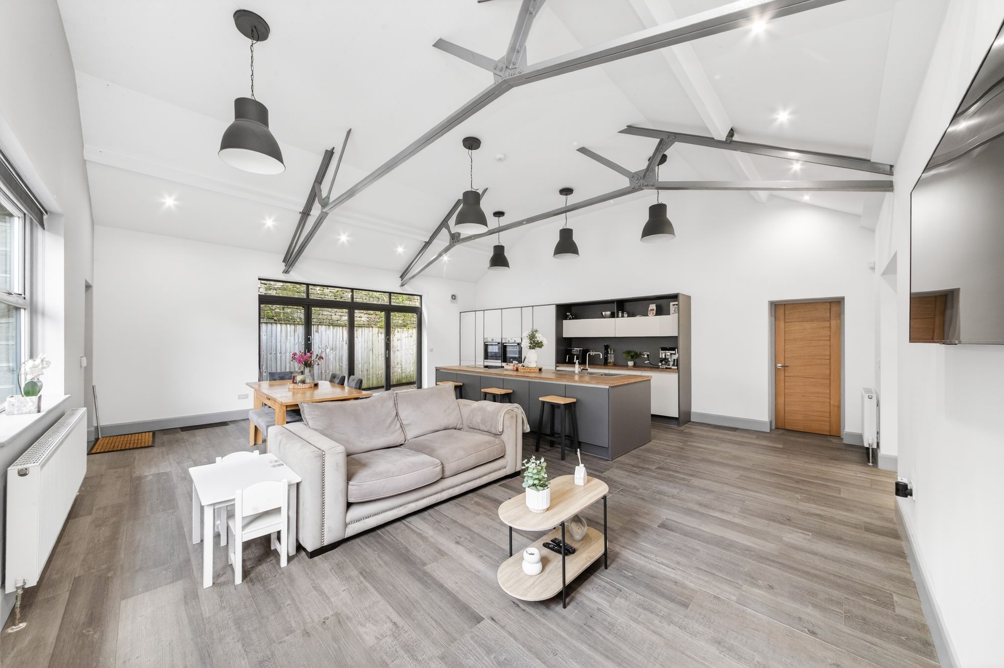 This fabulous room enjoys a huge amount of natural light courtesy of large windows and a broad bank of bi-fold doors to the rear with wonderful roof construction steel work on display. There is fabulous industrial style lighting and beautiful spotlighting and a continuation of the beautiful flooring from the hallway. The kitchen enjoys a full and comprehensive range of stylish units, complemented by a very impressive and large island unit, as well as integrated appliances including a full height fridge and full height freezer, a Bosch oven, a combination microwave/oven, a four ring induction hob with concealed touch elevated Baumatic extraction unit, and an integrated dishwasher. Within the island unit is a one-and-a-half-bowl sink unit with a particularly stylish mixer tap over, and the units have stylish, soft-close drawers.