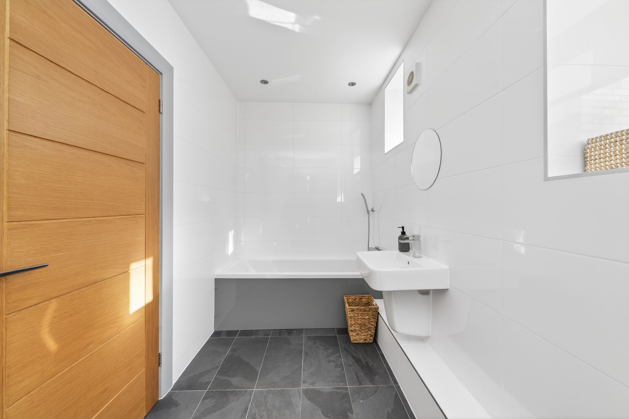 The property's bathroom is fitted with a four-piece suite in white, comprising a large shower with high quality chrome system, a low-level WC, a wall-mounted wash hand basin, and a bath with mixer tap/hand held shower unit over. The bathroom has two windows, ceramic tile flooring and tiling to the full ceiling height, inset spotlighting, a chrome central heating radiator and an extractor fan.