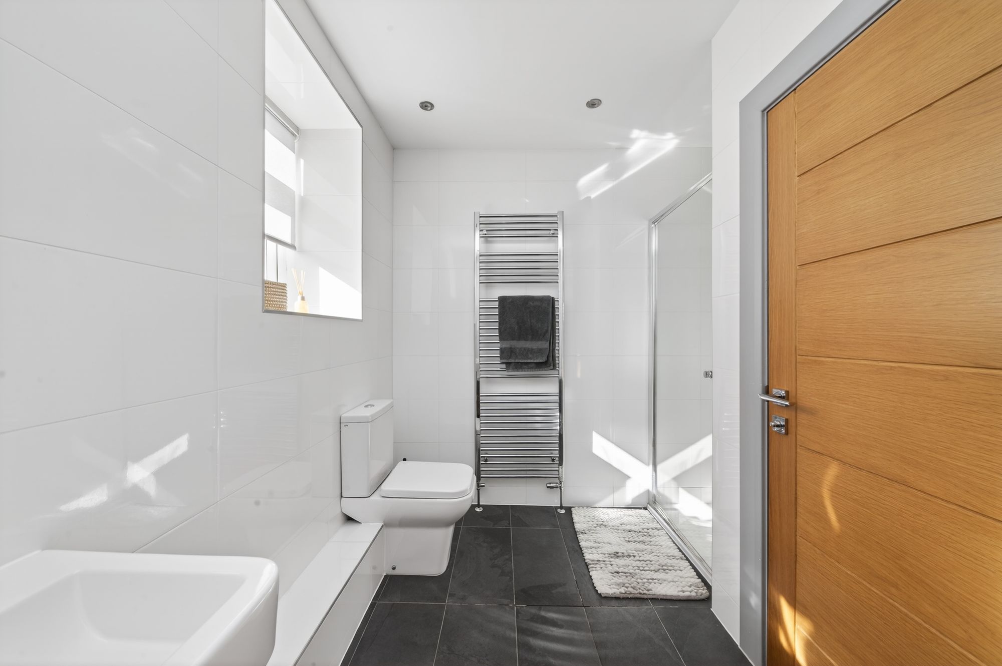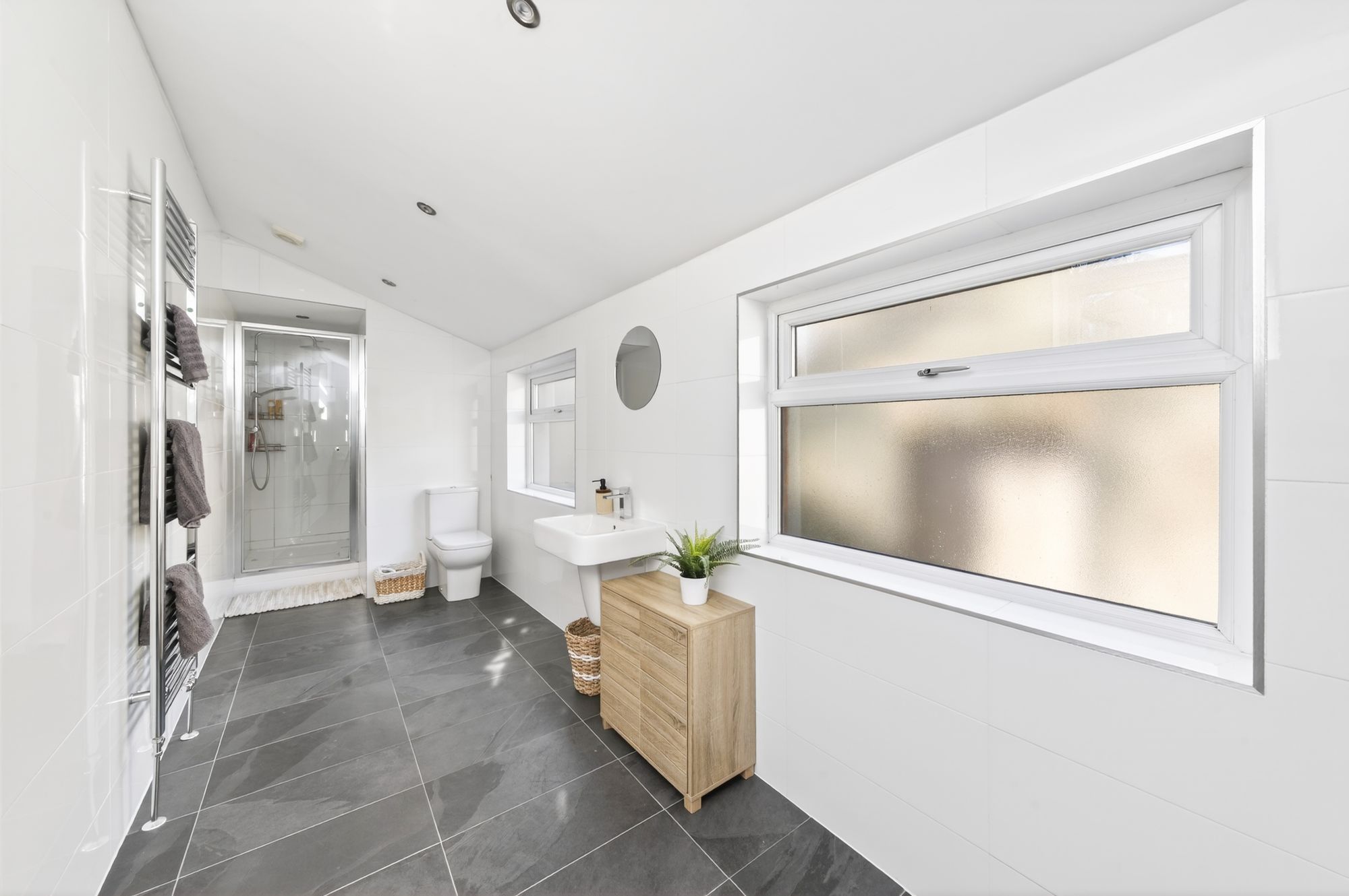 This en-suite has a beautiful ceramic floor, tiling to the full ceiling height which gently slopes with inset spotlighting, three windows in total, a combination central heating radiator / heated towel rail in chrome, a wall-mounted wash hand basin, low-level WC and a large shower cubicle fitted with chrome shower fittings.