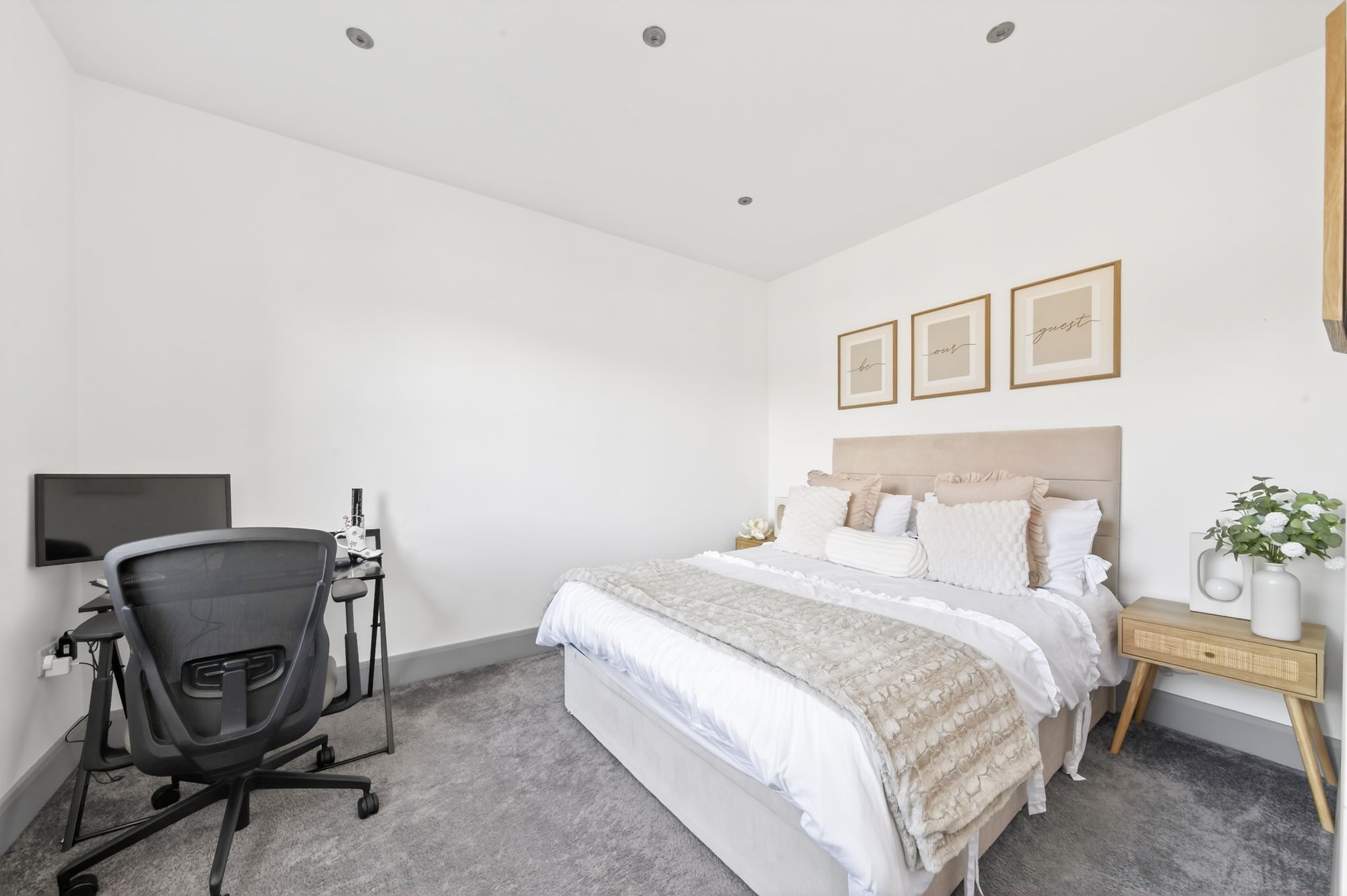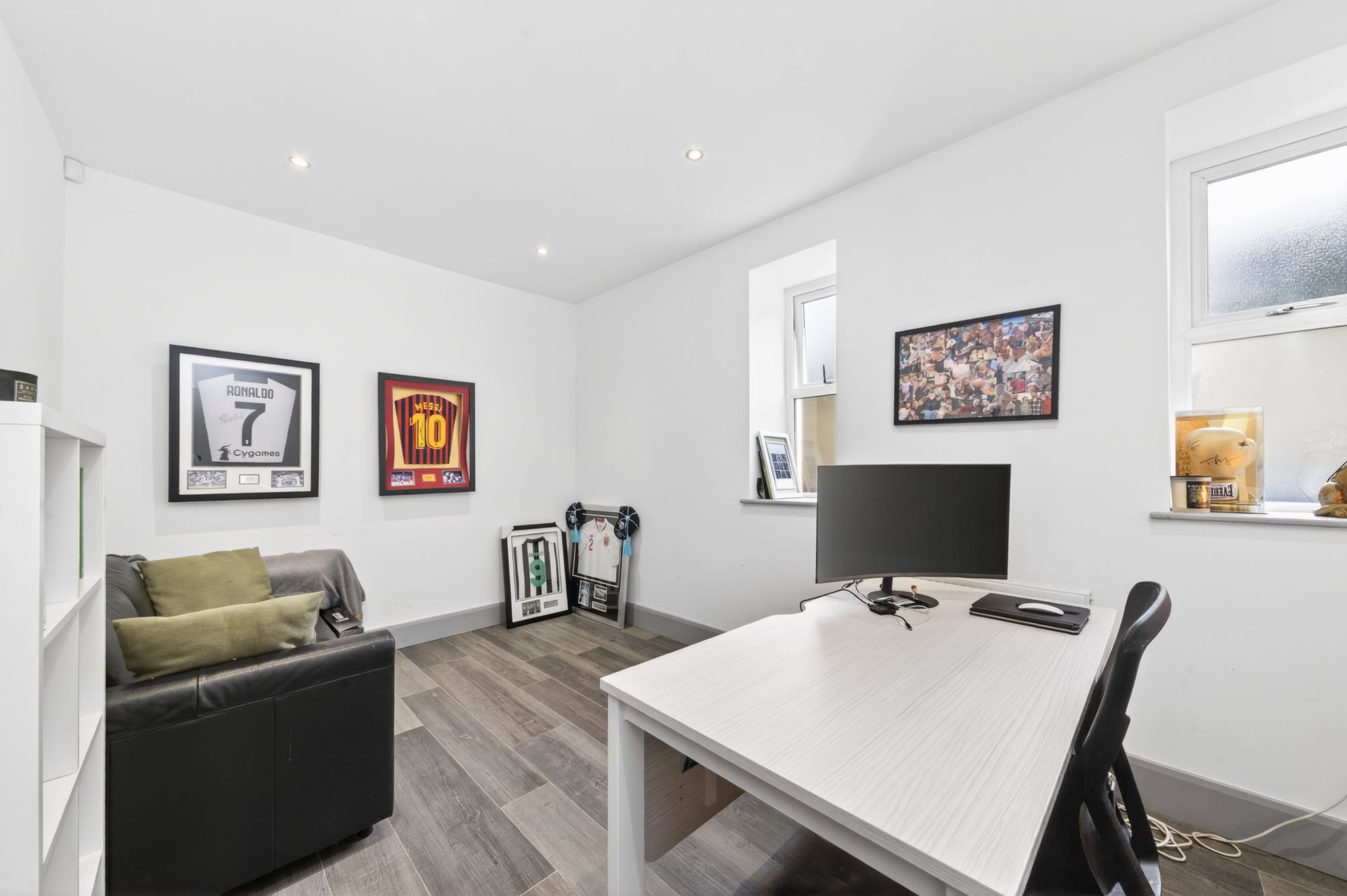 The home office boasts twin windows, inset spotlighting to the ceiling, and once again a continuation of the stylish flooring.