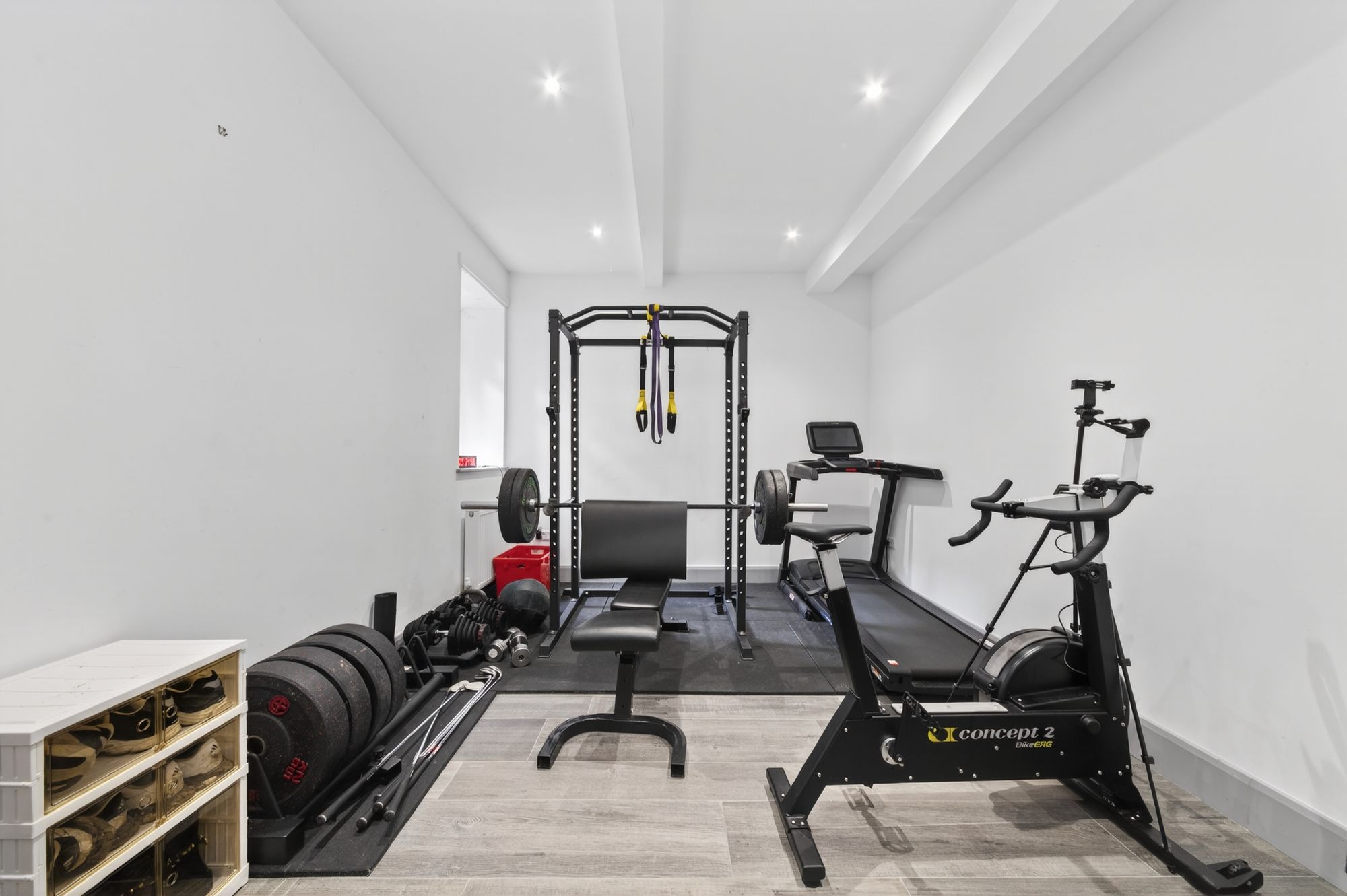 The family room / formal dining room is currently utilised as a home gym and features a window to the rear, a continuation of the impressive flooring, inset spotlighting to the ceiling and is accessed via stylish twin doors.