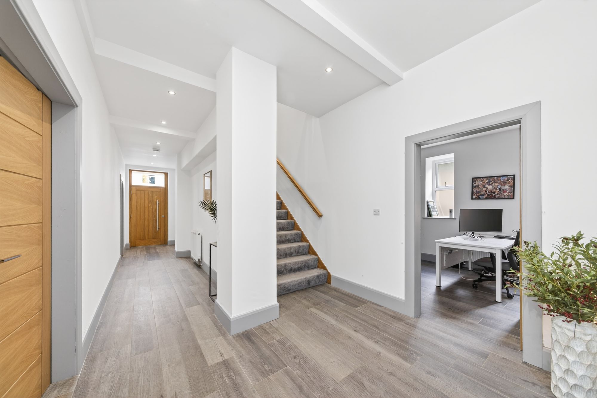 Enter into the property via a beautiful oak door with glazed panel and stylish door furniture. The fabulous entrance hallway is approx. 30 ft in length and boasts very stylish, timber-effect, ceramic style floor with inset spotlighting to the ceiling, a very high ceiling height and many stylish features, including fabulous doors with beautiful door furniture providing access to the sitting room, lounge/playroom, family room/home gym, and the home office. A broad opening leads through to the magnificent living/dining kitchen.