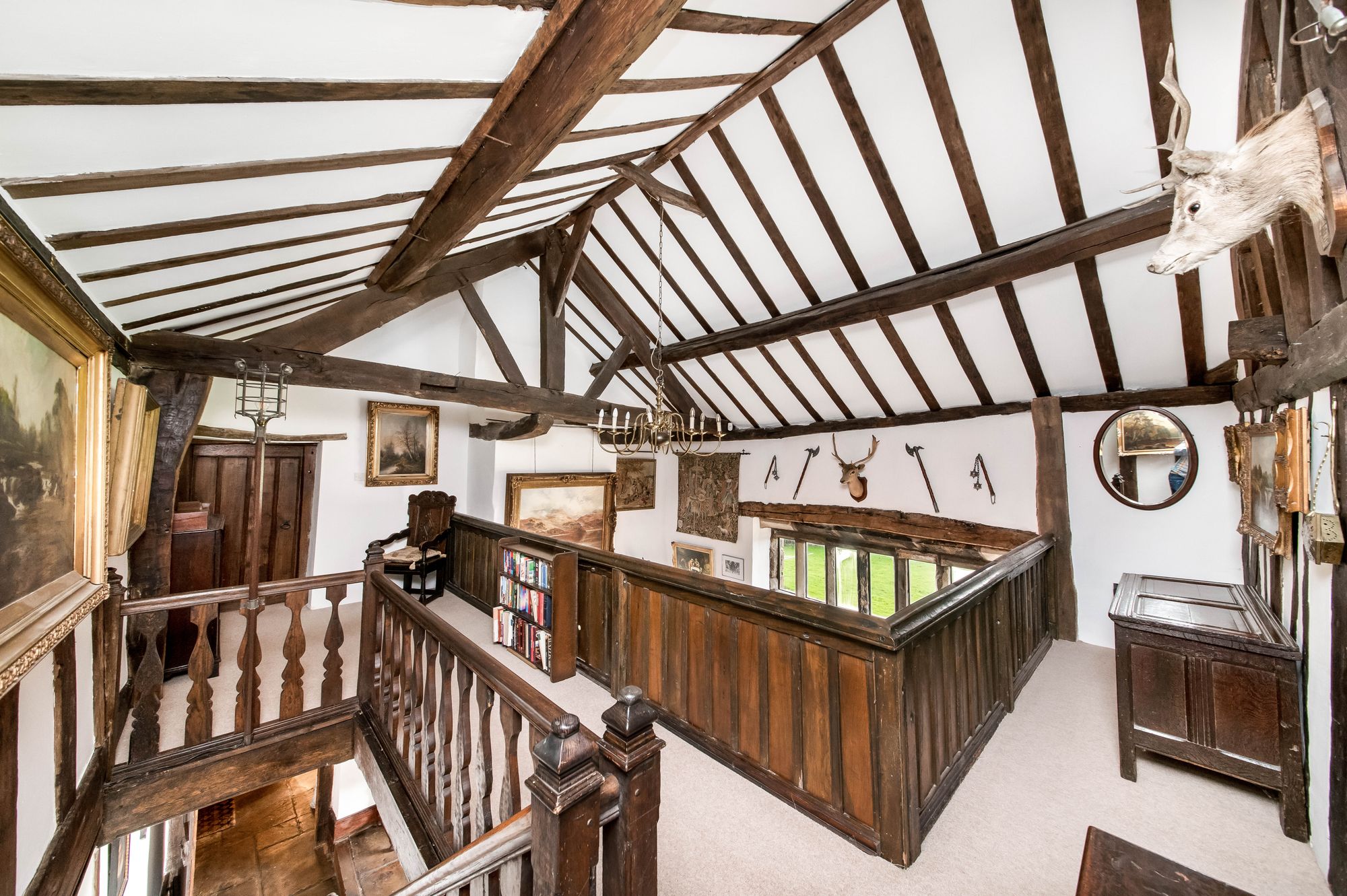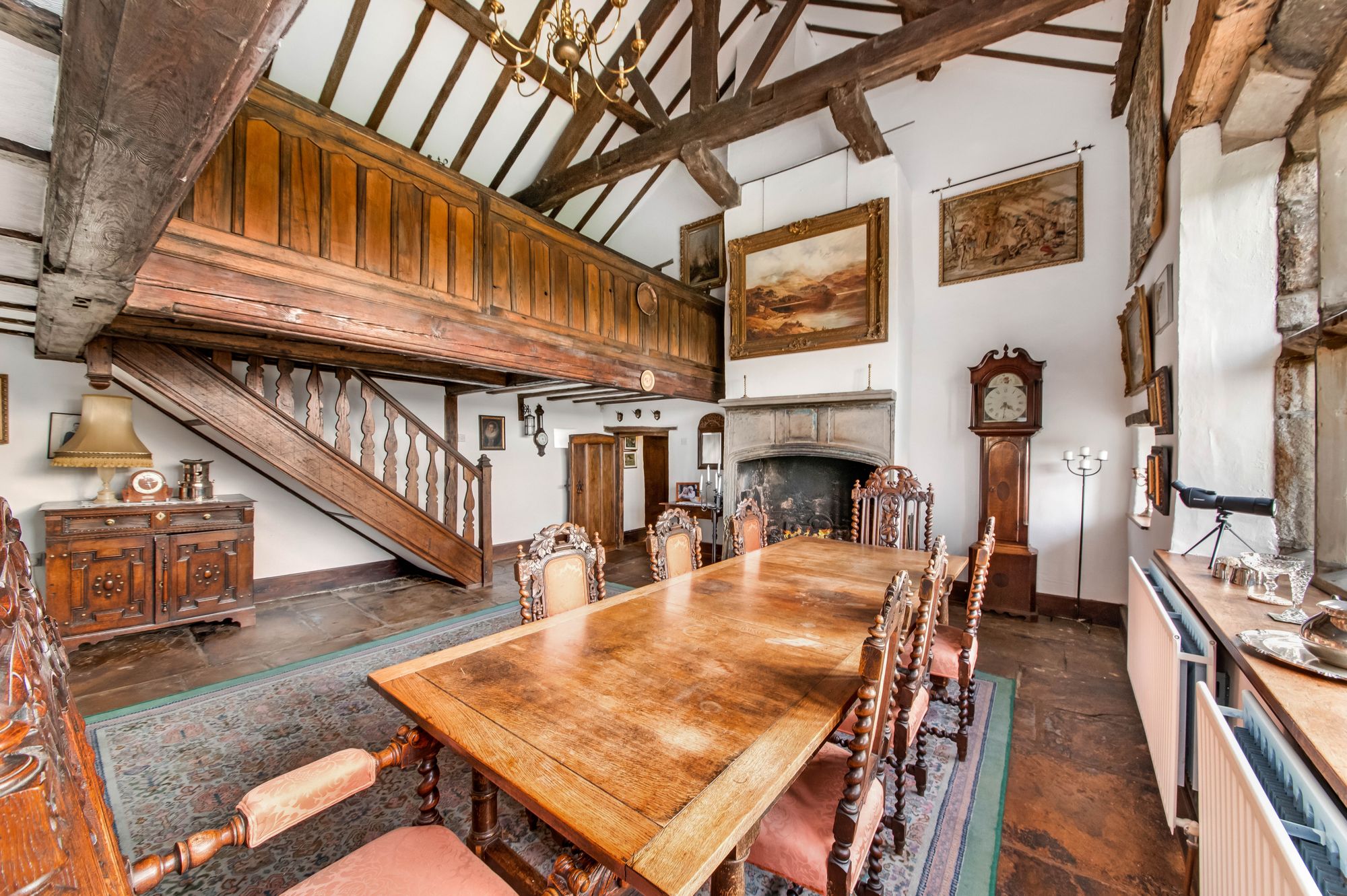 A stunning double height room with exposed timbers, stone flagged floor, staircase to one side rises to a minstrel’s gallery, there are fourteen light mullioned windows looking out over the garden and with lovely far reaching open views beyond. As the main focal point of the room there is a stone fireplace with open fire and raised stone hearth. To the far end of the great hall there are doors giving access to the sitting room and drawing room.