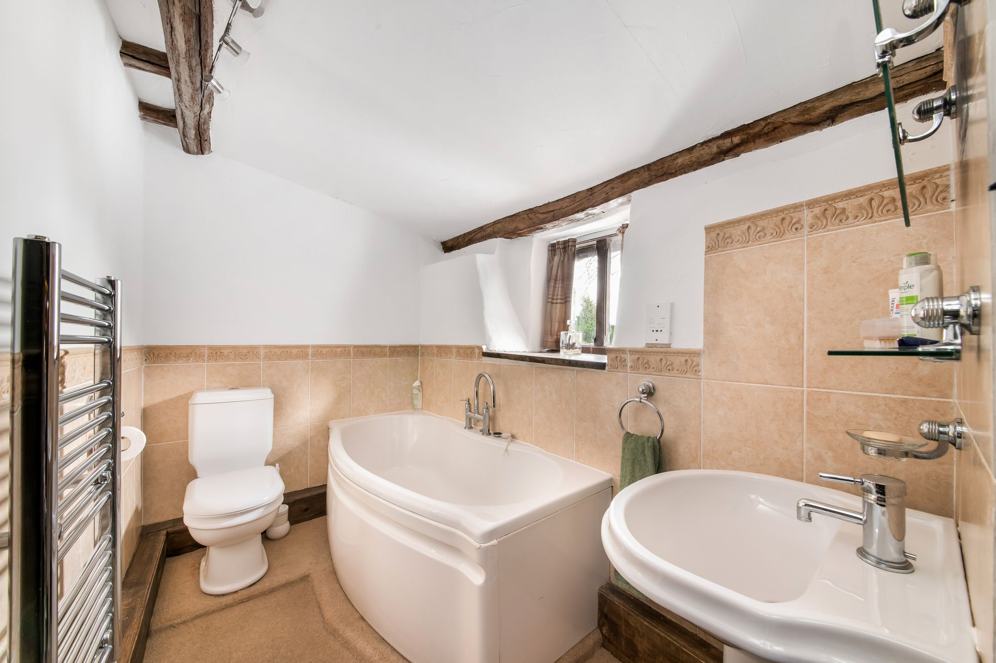 With window looking out over the garden, tiled walls to two elevations, shaver socket and fitted with a suite comprising pedestal wash basin, low flush WC and shower cubicle.