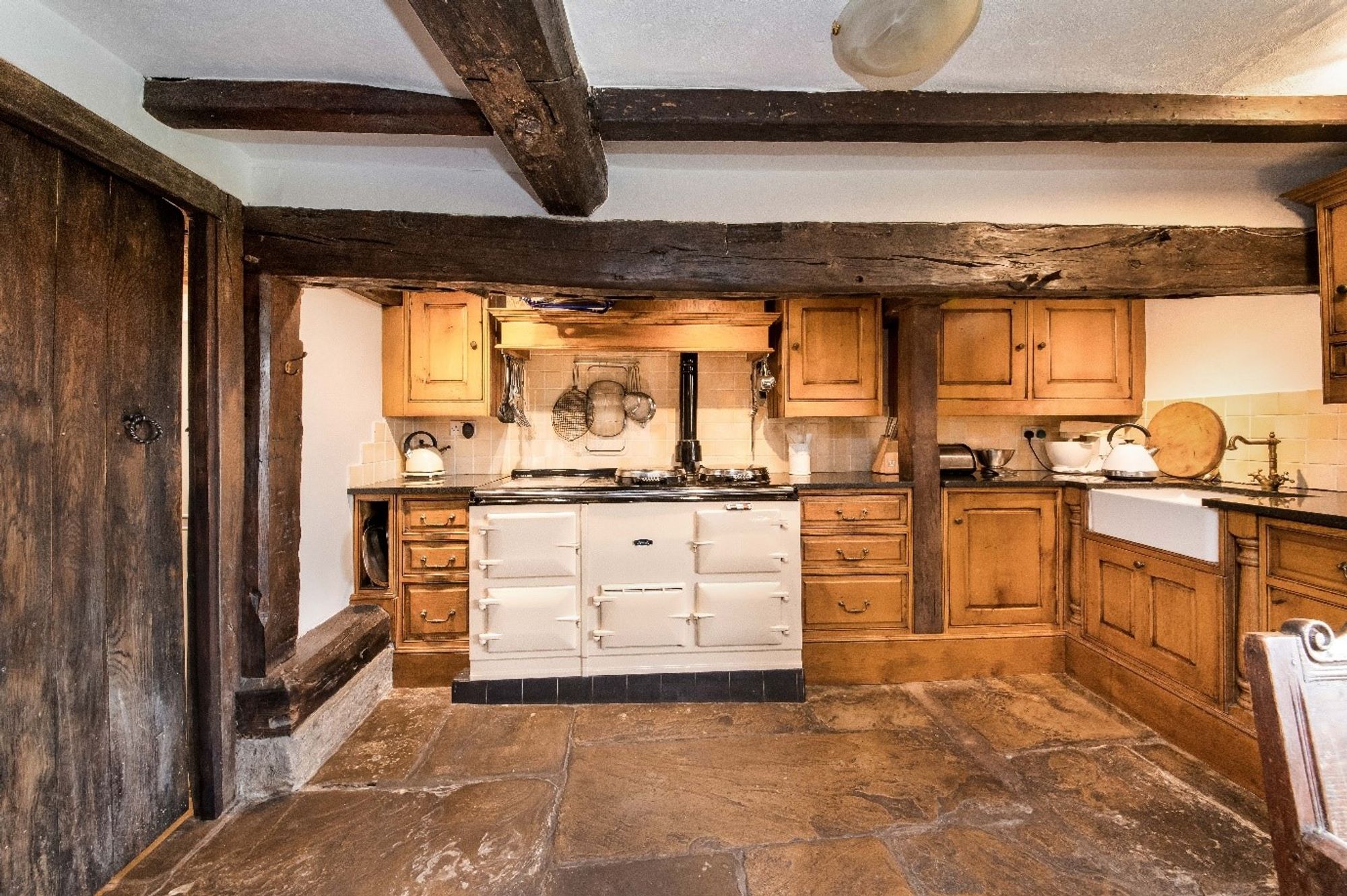 This has beamed ceiling, stone flagged floor, four light mullioned window, braced door giving access to the garden and fitted with a range of medium oak faced base and wall cupboards, drawers, contrasting overlying granite worktops, glazed display cupboard, display shelving, Belfast sink with antique style mixer tap, classic cream four oven gas aga, integrated fridge, integrated dishwasher and integrated microwave. From the kitchen a door gives access to a utility room.