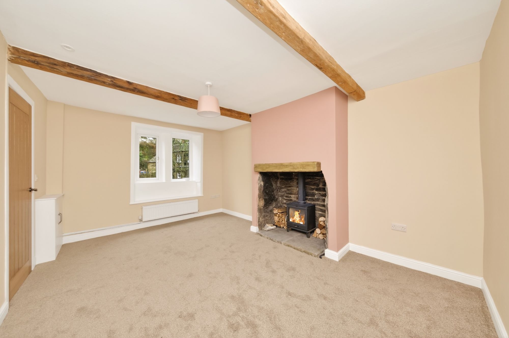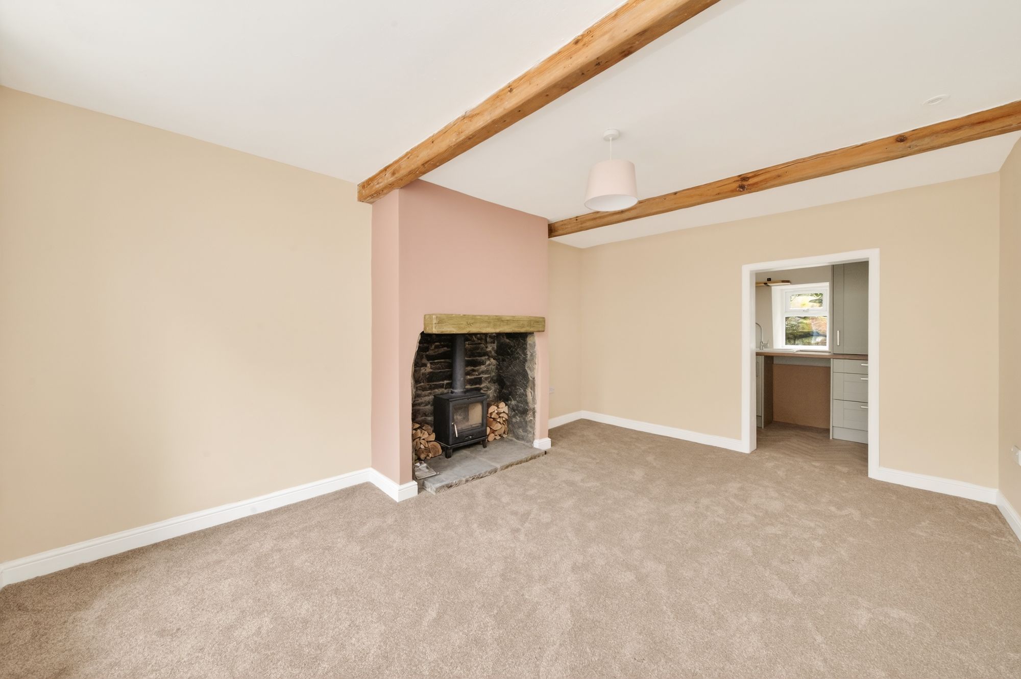 This is the photograph from floor layout plan suggests is a good-sized room. It has a delightful view out to the front, courtesy of a pair of mullioned windows with window seat beneath. The view is out over towards the river and with the wooded scene and other characterful cottages in the distance. There are two beams to the ceiling, inset spotlighting, central chandelier point, broad chimney breast with raised stone flagged hearth and timber mantle. There is exposed stonework and all is home for a log burning stove with glazed door and with lighting over. Broad opening leads through to the kitchen.