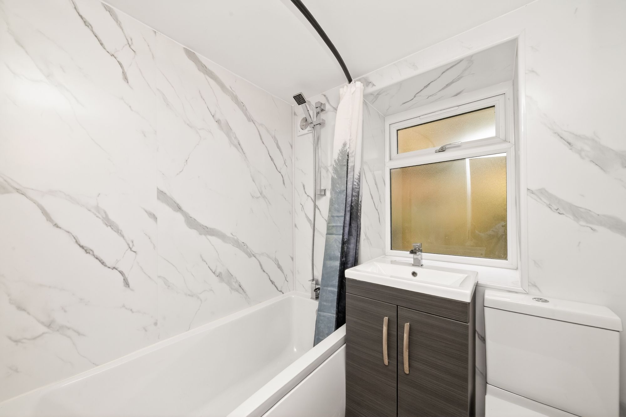 The property's bathroom is beautifully presented. It has attractive walls, inset spotlighting to the ceiling, obscure glazed window, stylish three-piece suite in white comprising a low-level w.c, vanity unit with wash hand basin, mixer tap over and a storage cabinet beneath. There is a bath with chrome mixer tap and shower over, an extractor fan and chrome central heating radiator/heated towel rail.