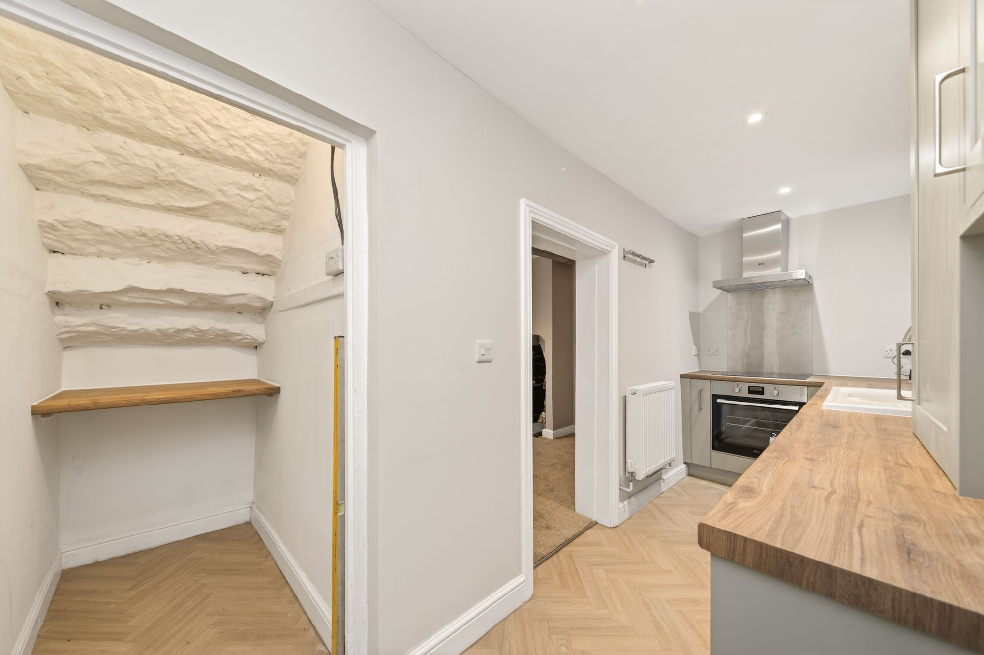 This which has an outlet to the rear courtesy of two windows and the upper portion of the high-quality glazed door. The kitchen is beautifully fitted and takes full advantage of the space. There is inset spotlighting the ceiling, large amount of working surfaces, inset ceramic sink unit with mixer tap over, integrated stainless steel and glazed fronted oven, induction hob and stainless-steel extractor fan, all of AEG manufacture. There is space for a washing machine and the understairs store provides ideal space for the fridge/freezer. With attractive flooring as previously mentioned, the kitchen has a stylish door, the upper section of which is glazed, which gives access out to the rear garden areas.