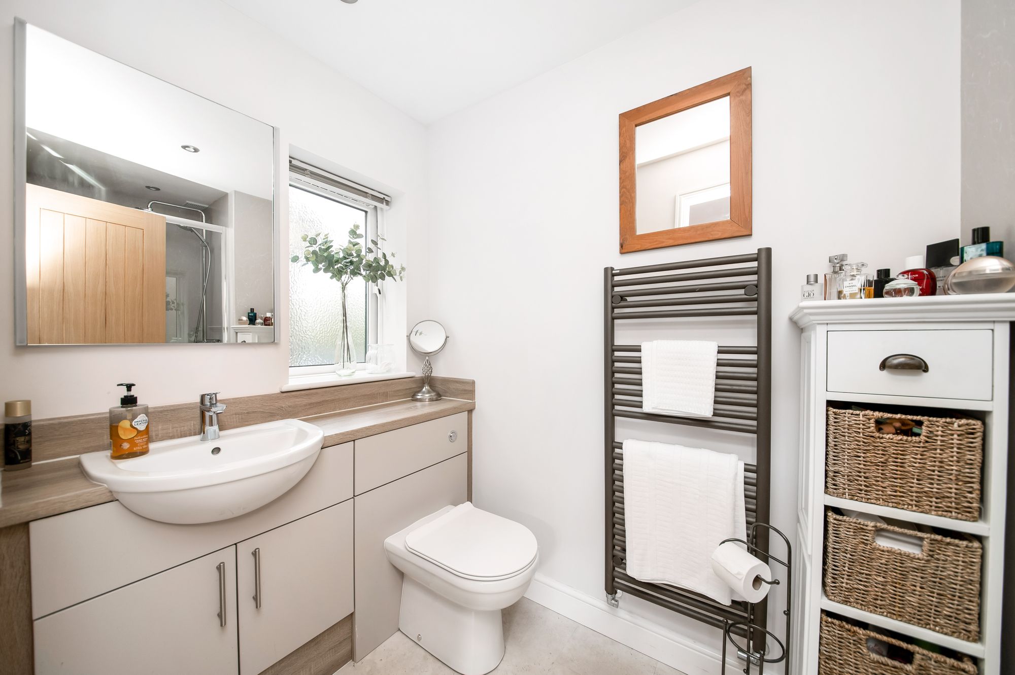 DOWNSTAIRS W.C.The downstairs w.c. features a modern two-piece suite which comprises a low-level w.c. with push-button flush and a broad wash hand basin with vanity cupboard beneath. There is luxury vinyl tile flooring, a Tissino ladder-style radiator, a central ceiling light point, and a double-glazed window with obscure glass to the front elevation.