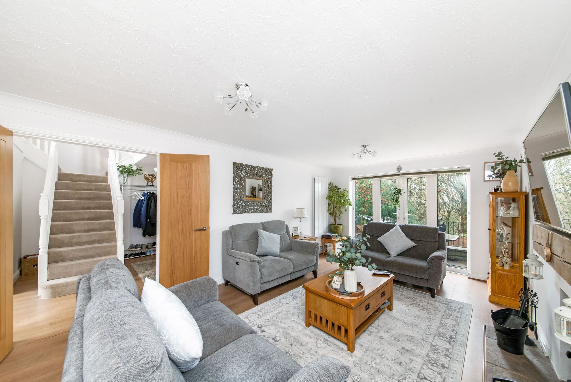The open-plan dining kitchen provides a wealth of space, enjoying a great deal of natural light cascading through the double-glazed bay window to the rear elevation and the additional double-glazed bank of windows, both of which provide fantastic views across the property's well proportioned gardens and of the woodland backdrop beyond. There is high-quality Karndean flooring, two ceiling light points, two vertical column radiators, an oak internal door providing access to the double garage, French doors providing access to the rear terrace, and a double-glazed composite stable-style door to the side elevation.