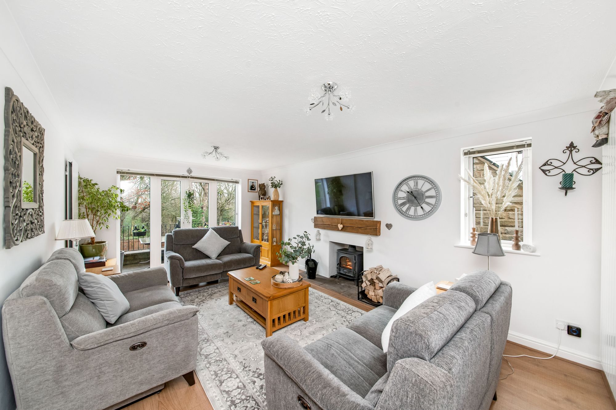 The lounge is a light and airy, generously proportioned reception room which enjoys a great deal of natural light courtesy of the dual aspect windows. The room is decorated to a high standard and features high-quality flooring, decorative coving to the ceilings, two ceiling light points, and two vertical column radiators. The lounge provides a pleasant outlook across the property's gardens and has direct access to the rear terrace via double-glazed French doors. The focal point of the room is the inglenook fireplace with cast-iron, Clearview, multi-fuel stove set upon a raised stone hearth.