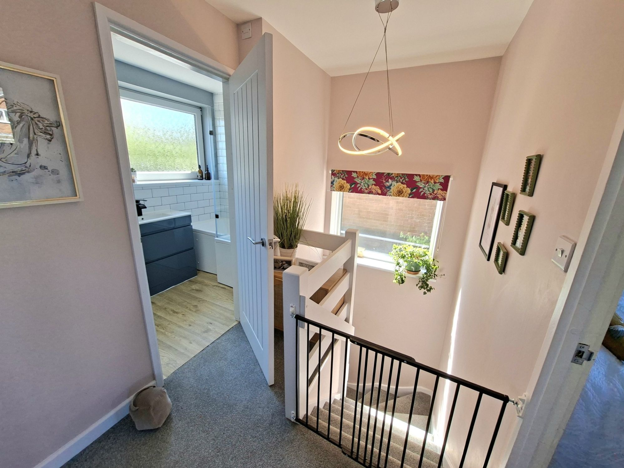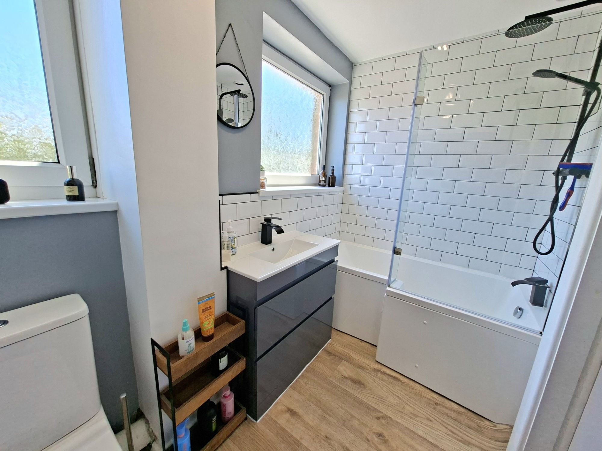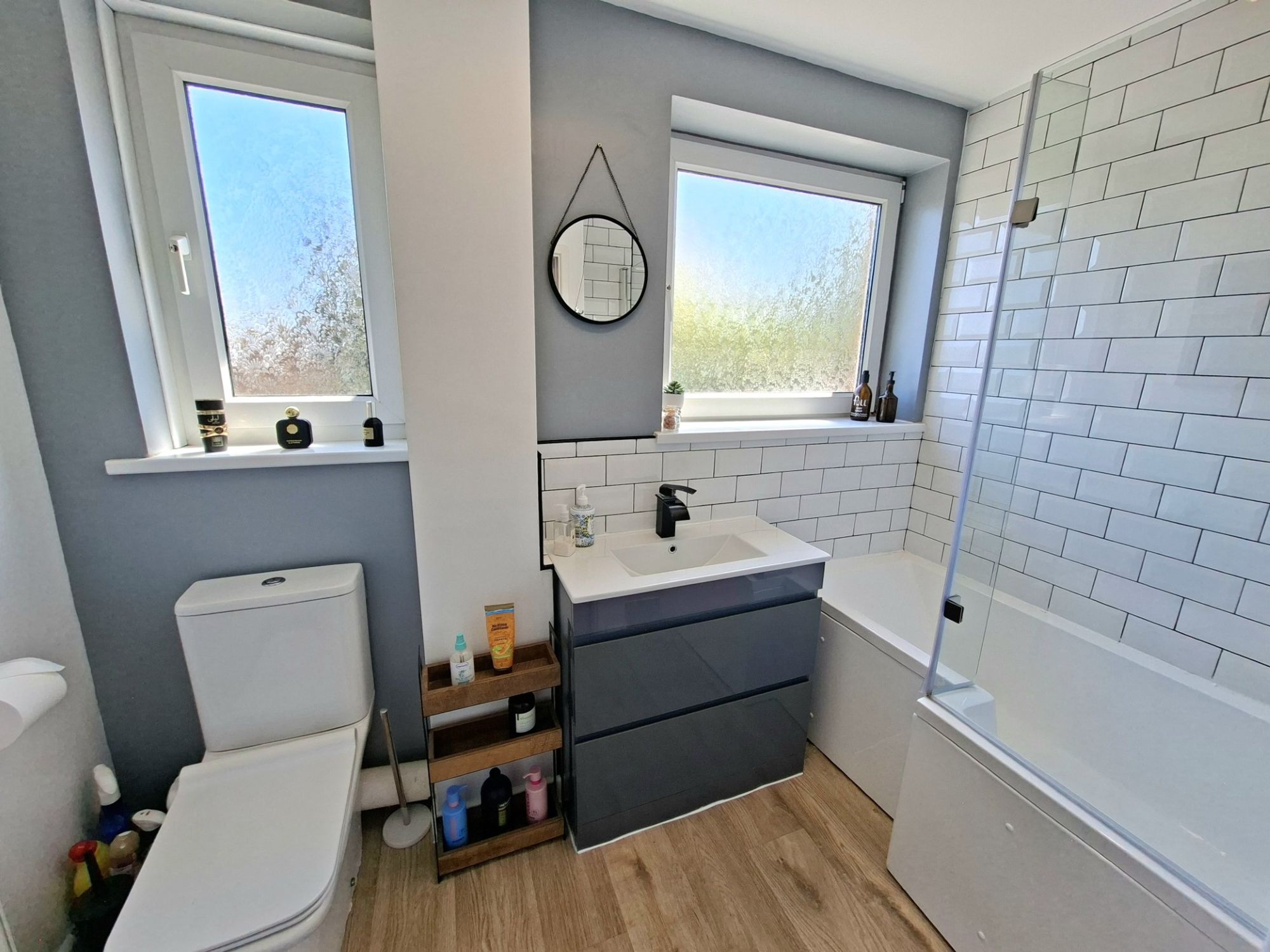 FAMILY BATHROOMThe family bathroom is spacious and presented to a very high standard with a fully tiled wall around the bath/shower area and has very modern sanitary fittings along with great natural light via two windows.