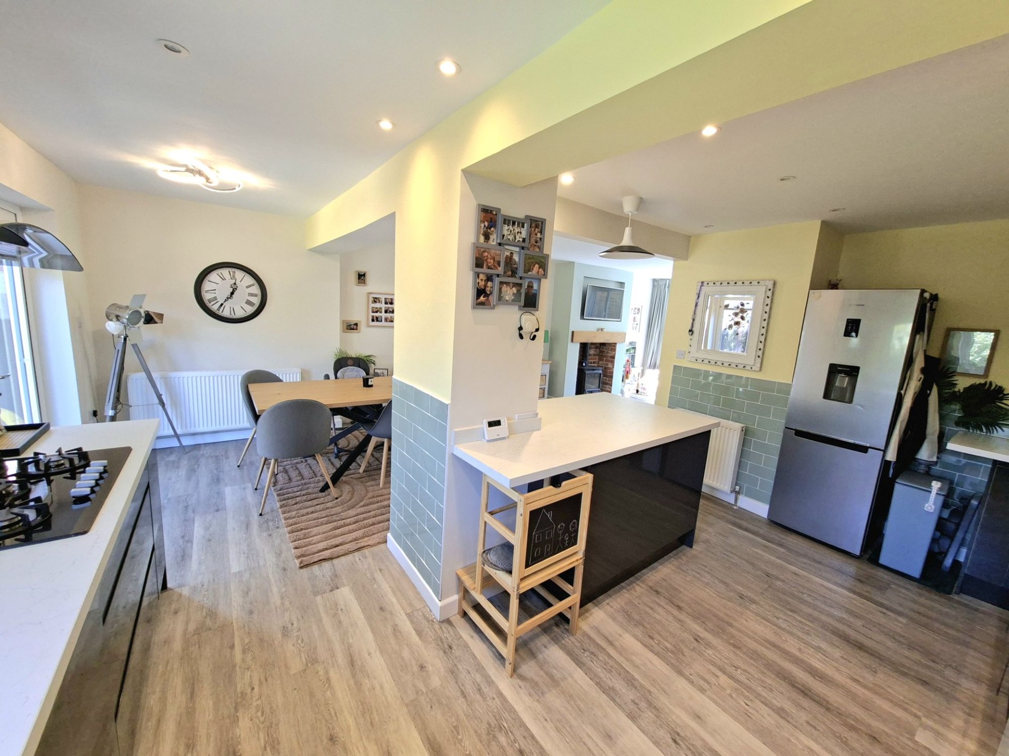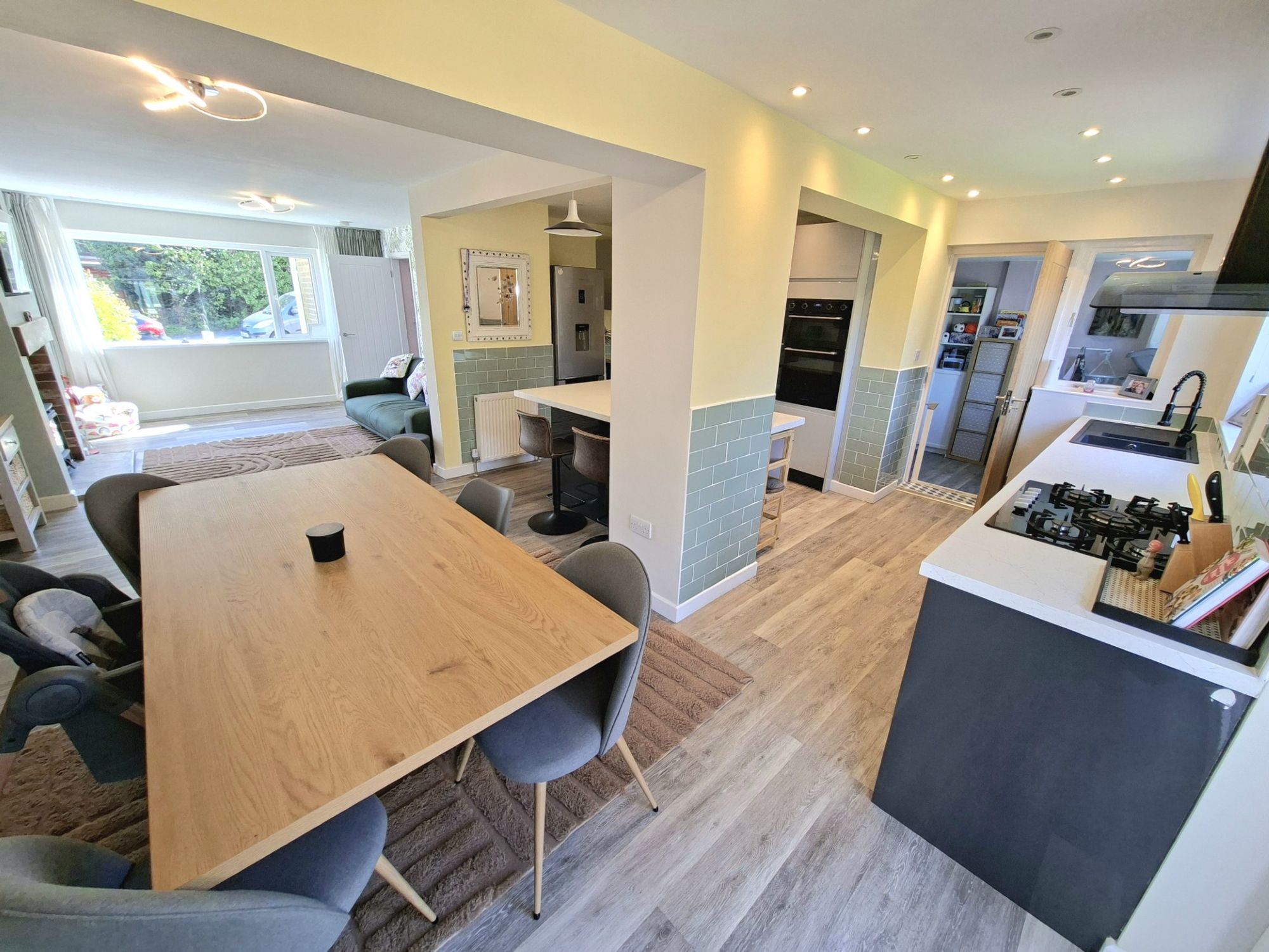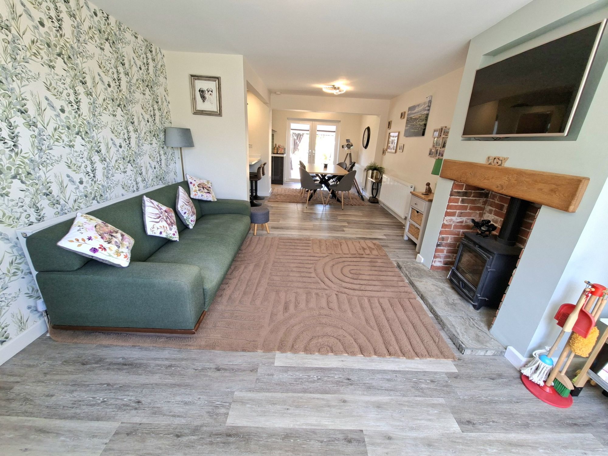 The large living room is open plan with a log burner and wood effect good quality laminate flooring and good natural light.