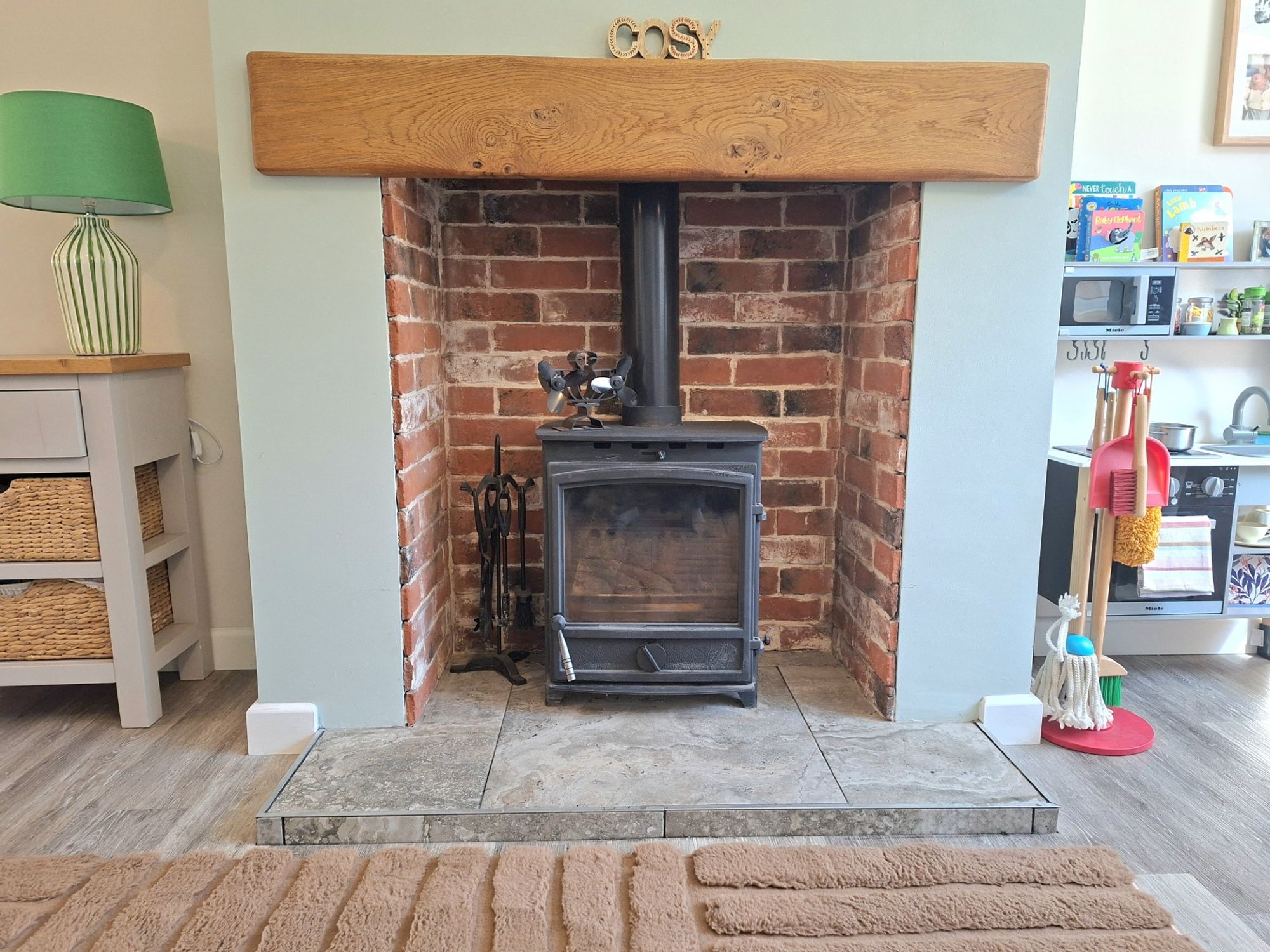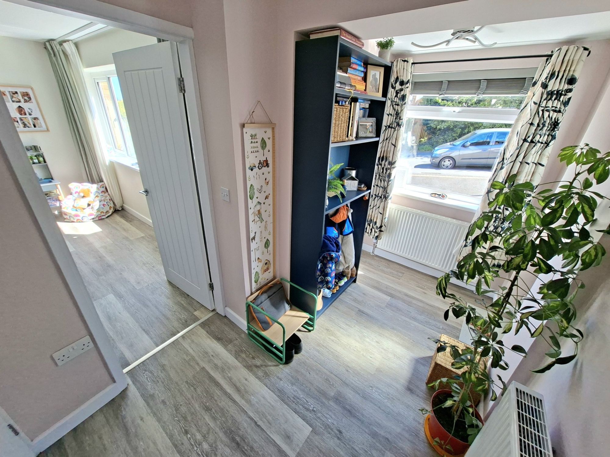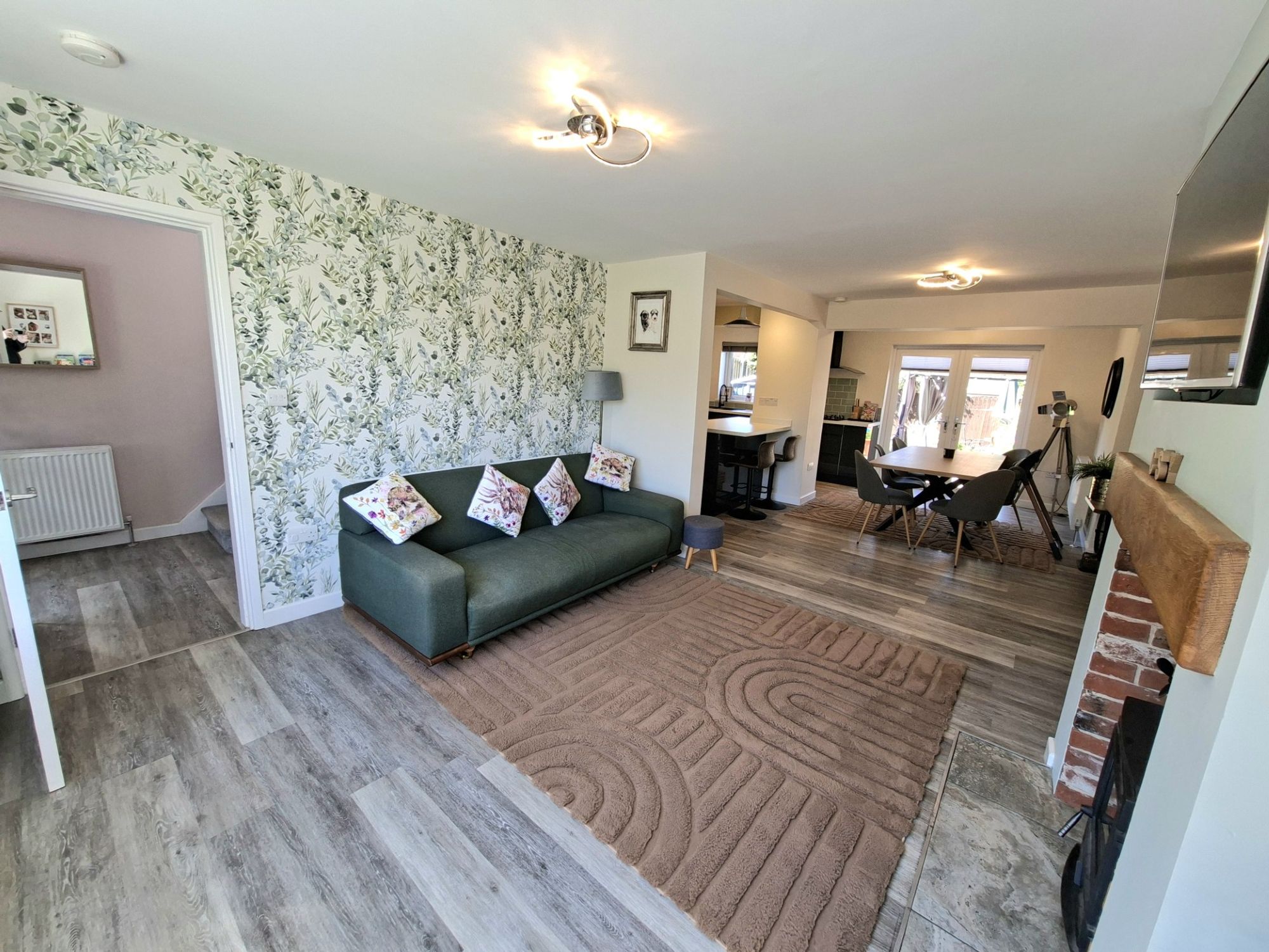 The large living room is open plan with a log burner and wood effect good quality laminate flooring and good natural light.