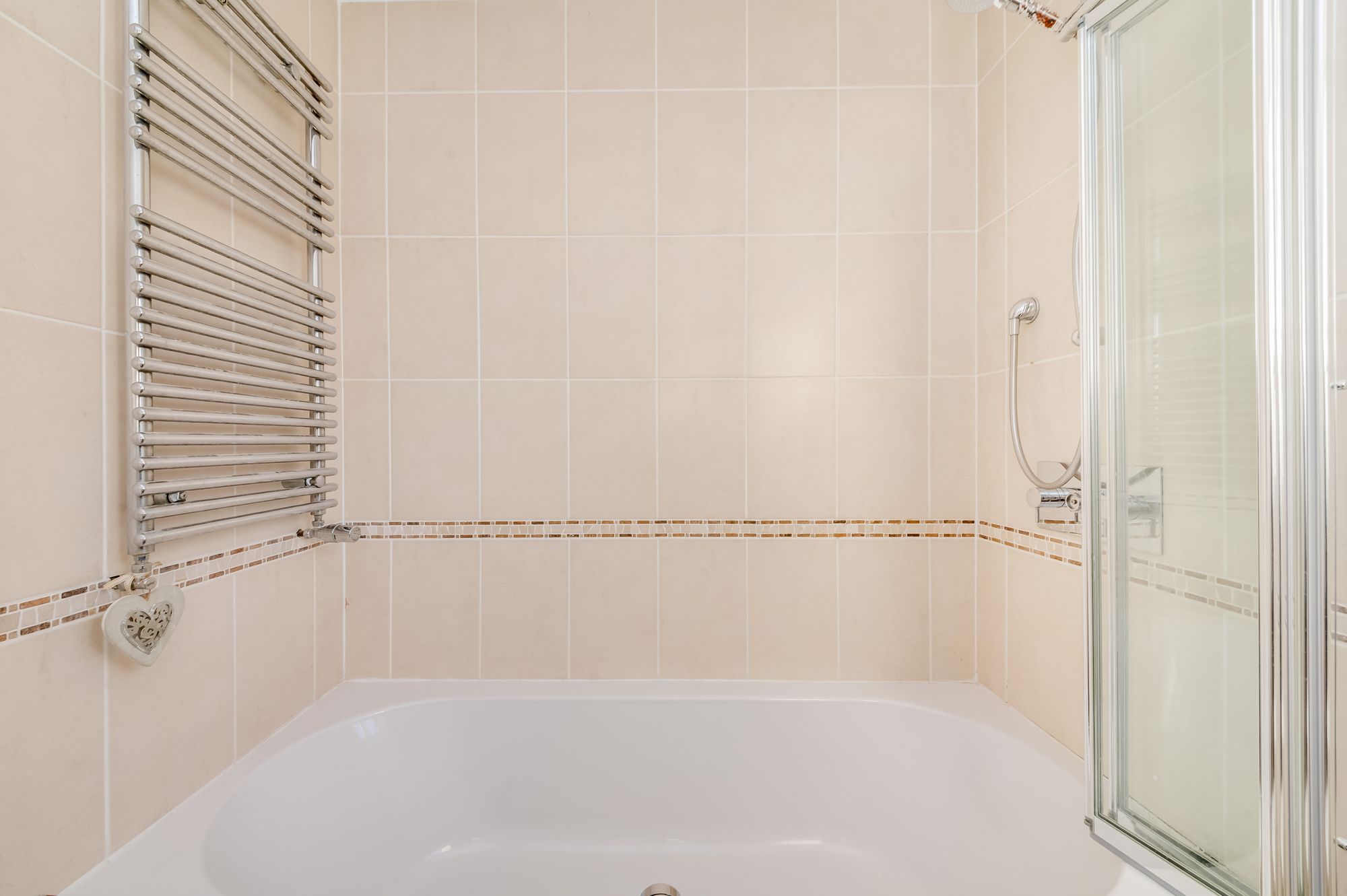 The en-suite features a white, three-piece suite comprising a step-in shower cubicle with thermostatic shower, a pedestal wash hand basin, and a low-level WC. There is high-quality flooring, tiling to the splash areas, a chrome ladder-style radiator, a ceiling light point, an extractor fan, and a double-glazed window with obscure glass and tiled sill to the side elevation.