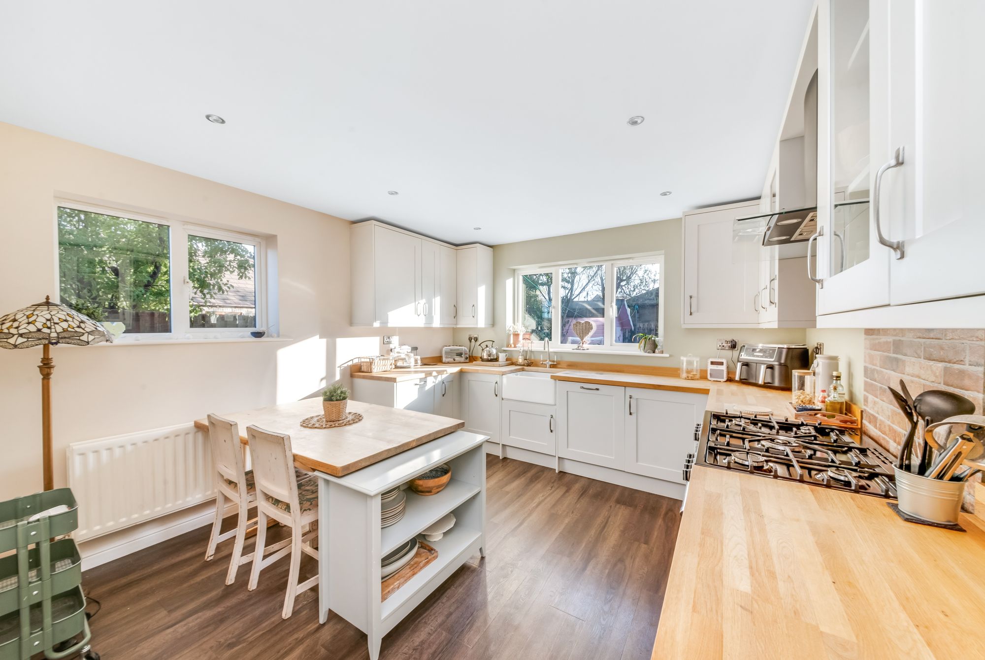 The dining kitchen features a wide range of fitted wall and base units with shaker-style cupboard fronts and complementary oak work surfaces over, which incorporate a ceramic Belfast sink unit with brushed chrome mixer tap. There are built-in appliances, including a dishwasher and space and provisions for a five-ring range cooker (available via separate negotiation). There is brick-effect tiling to the splash areas, a canopy-style cooker hood, a matching oak upstand, and under-unit LED lighting. Additionally, the kitchen features LVT flooring, inset spotlighting to the ceiling, a radiator, soft-closing doors and drawers, glazed display cabinets, a slide-and-hide bin store, and dual-aspect, double-glazed banks of windows to both the rear and side elevations. A door provides access to the utility room.