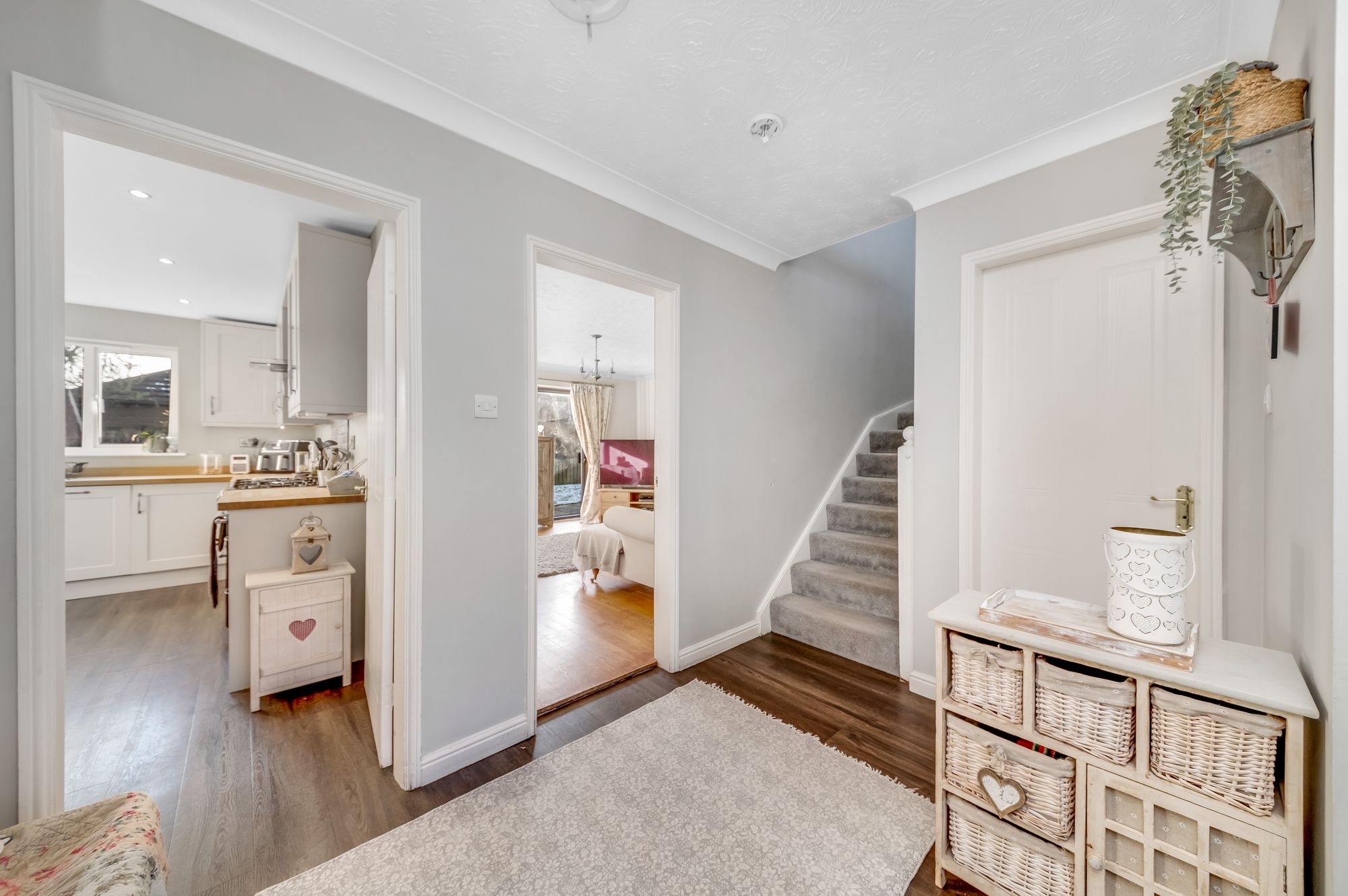 Enter into the property through a double-glazed, composite front door with obscure glazed inserts and adjoining double-glazed window with obscure glass. The entrance hall features decorative coving to the ceiling, two ceiling light points, a radiator, and LVT flooring. Doors provide access to the lounge, open-plan dining kitchen, second reception room, downstairs WC, and a cloaks cupboard. A carpeted, kite winding staircase with wooden banister and spindle balustrade proceed to the first floor.