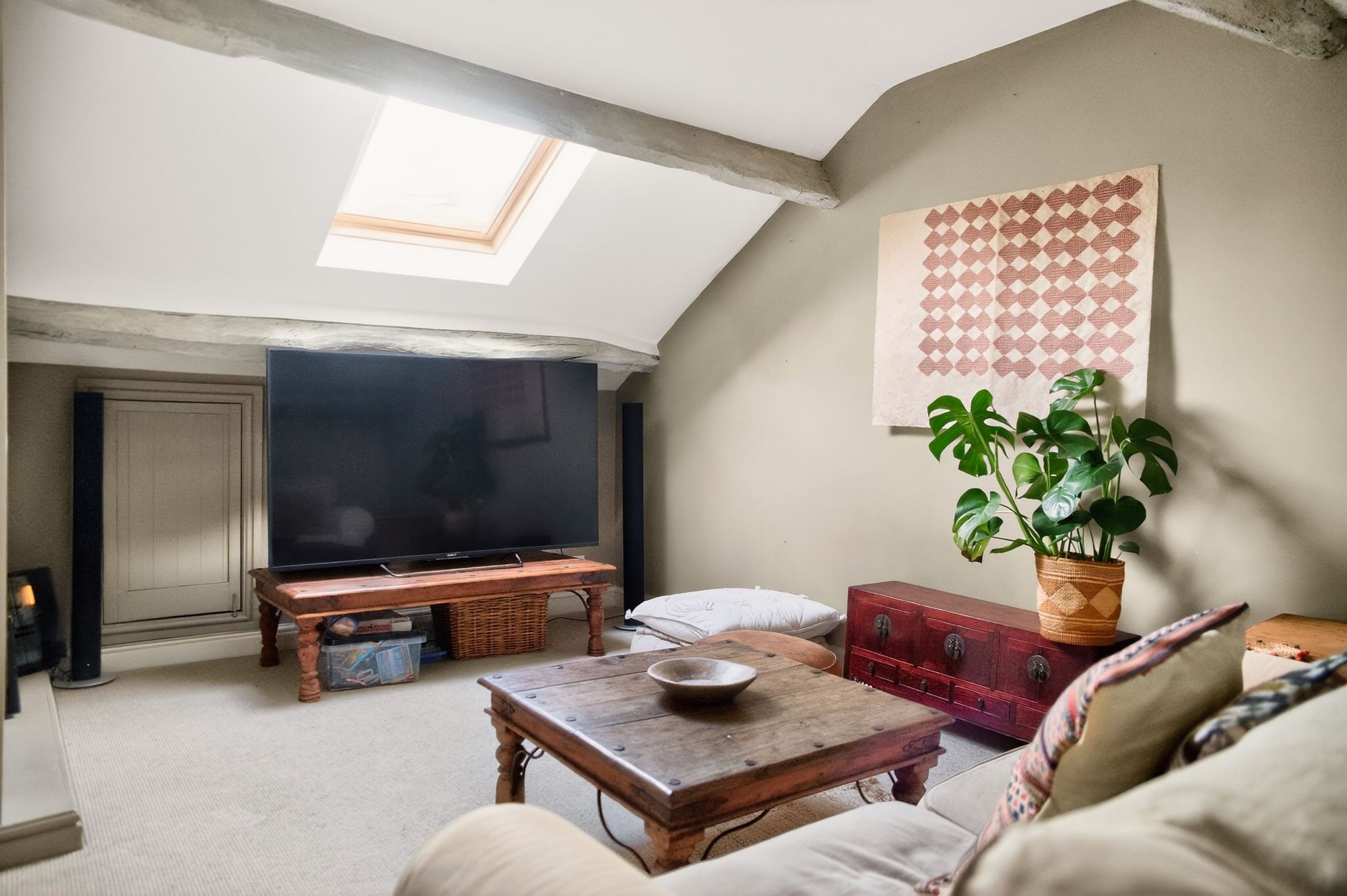 Once again, a characterful room with four beams on display, integrated display shelving, under eaves storage cupboards and Velux window. This room is currently used as a snug/cinema room.