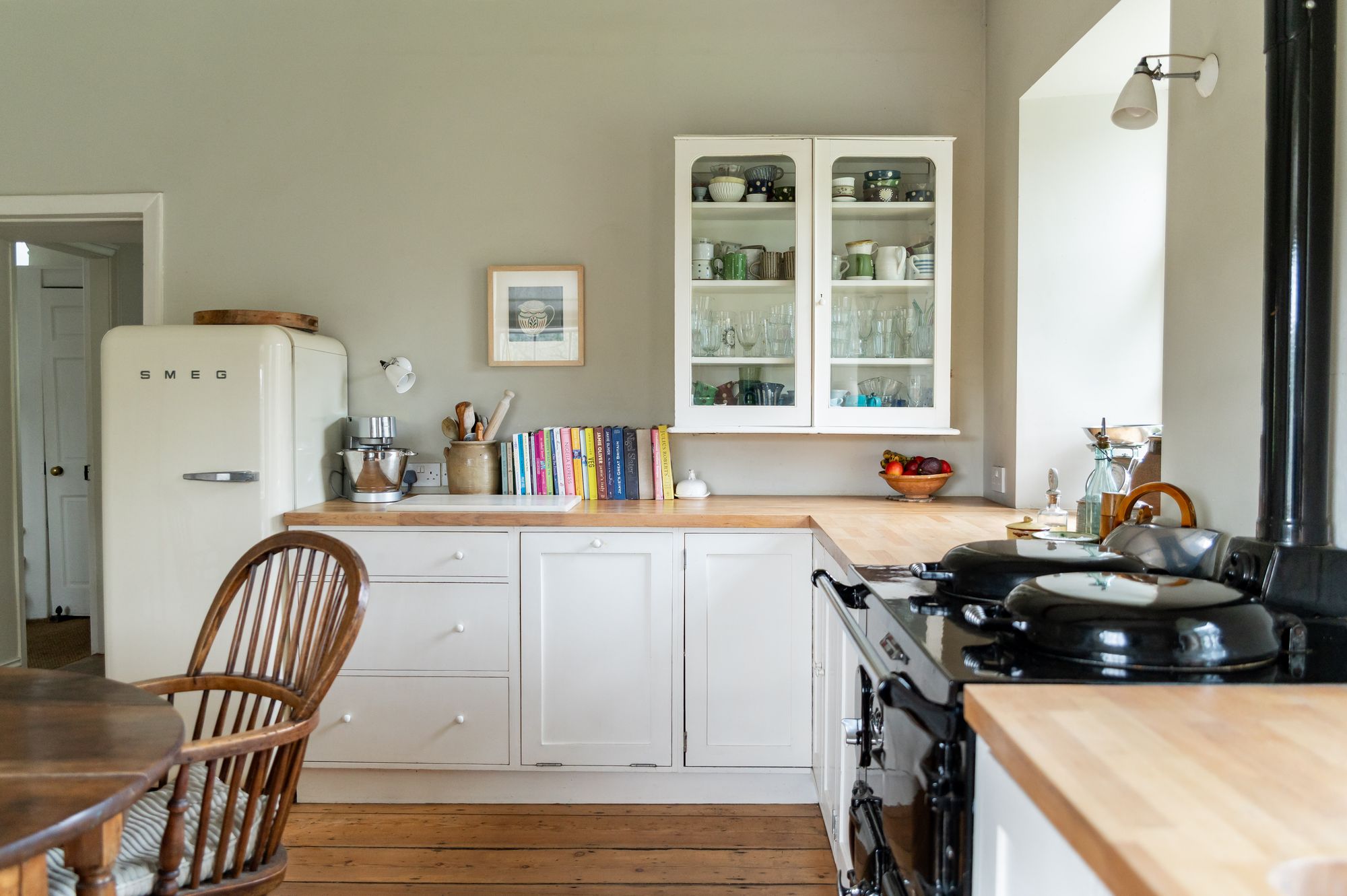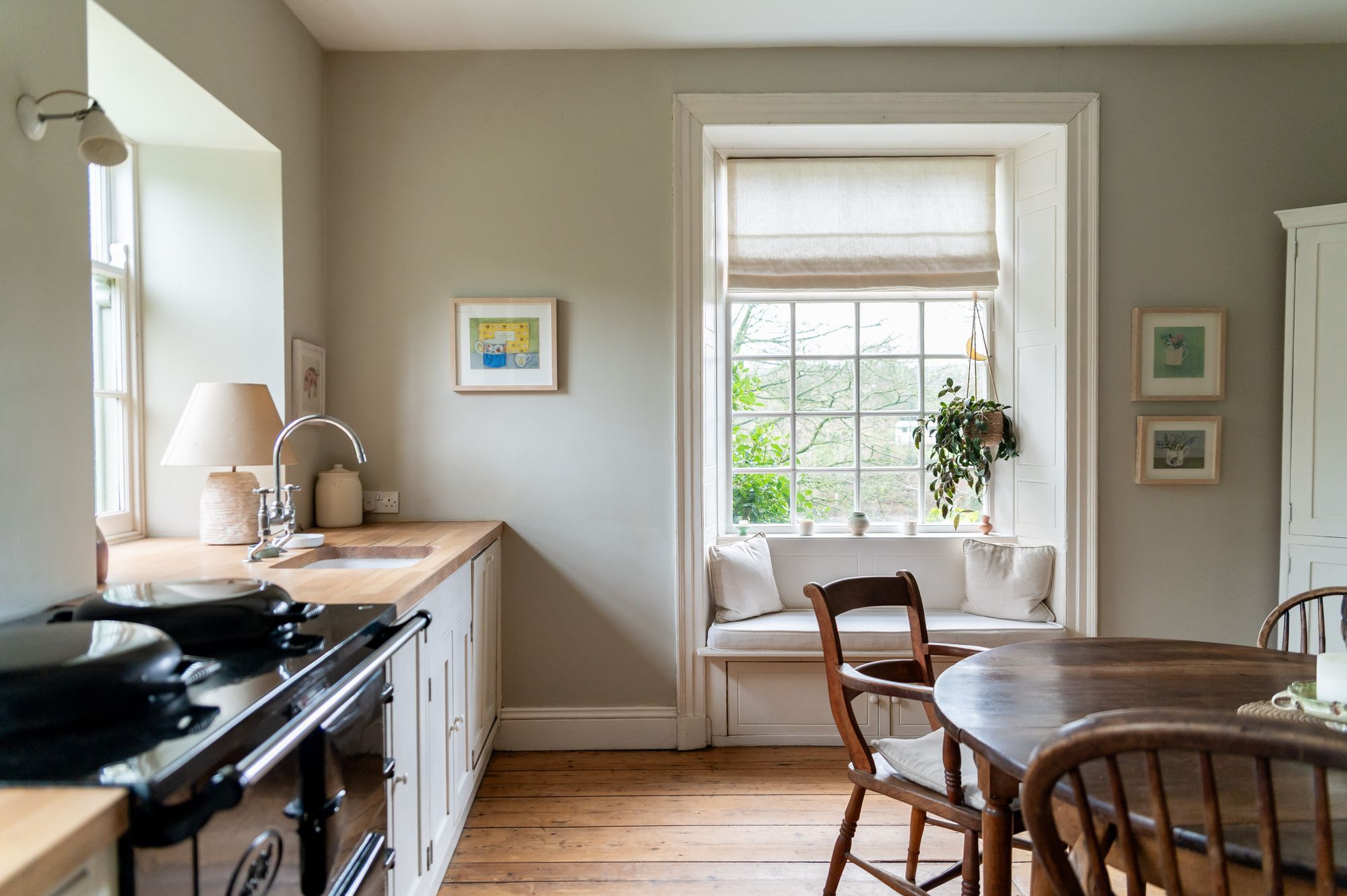 The dining kitchen, occupies a lovely position within the home. It has three windows, giving a view out over the property’s formal gardens and towards the village. The other two, period-style, sash windows, overlook the delightful, private side gardens. The room has a high ceiling height, fabulous floor boarding to the floors, a range of units with a large amount of working surfaces, inset, stylish sink unit of Villeroy and Bosch manufacture with stylish mixer taps above. There is an integrated dishwasher and integrated waste bin and the room is home for the Aga. This has the usual warming ovens and two hotplates, creating a fabulous feature in the room. The room also has inset spot lighting to the ceiling and an opening through to the everyday entrance hall/boot room, beautifully presented. A door between the kitchen and boot room leads down to a large cellar. The cellar head is home to stone inset shelving and is used as a cool pantry with extra storage for food and drinks.