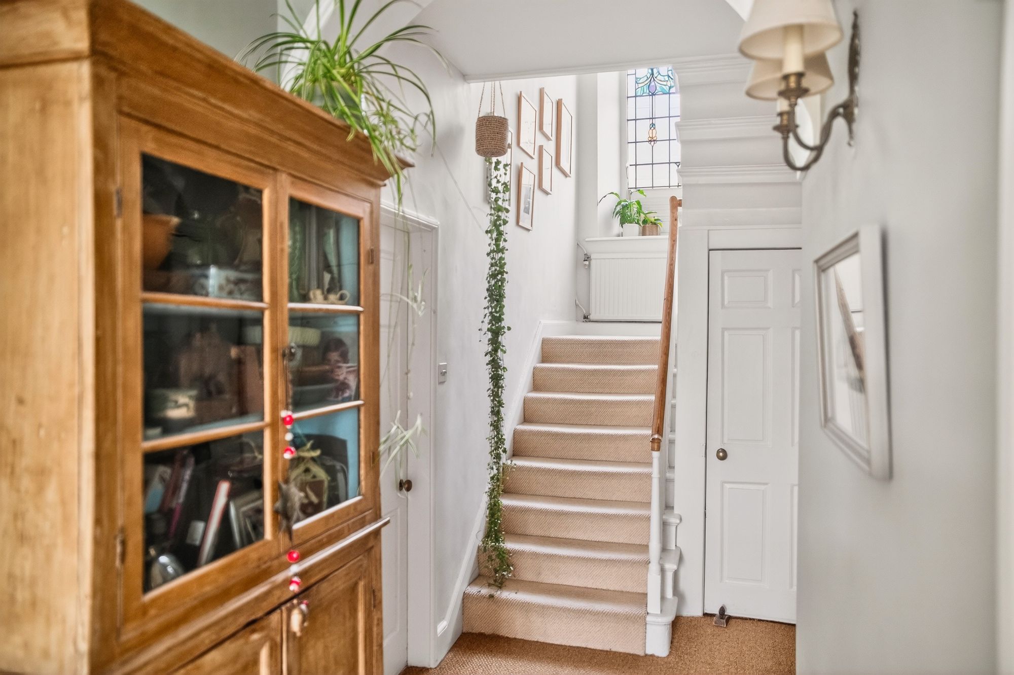 A beautiful, period-style door with fabulous coloured and leaded glazing both in the doorway and the glazed panel above. This broad doorway leads into the impressive entrance hallway with a high ceiling height with characterful archway.