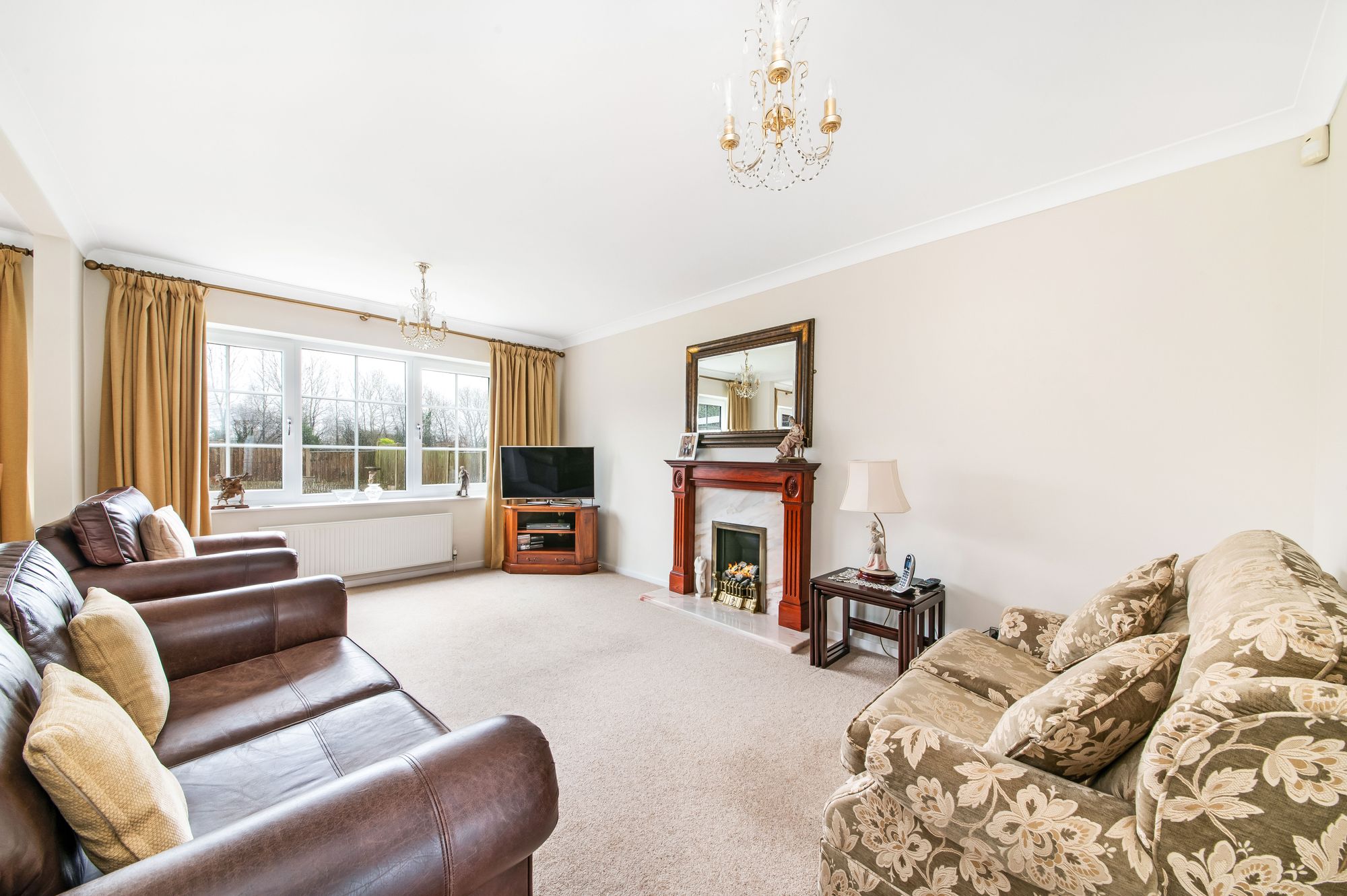 As the photography suggests, the lounge is a generously proportioned, light and airy reception room. It features a bank of double-glazed windows to the rear elevation, offering pleasant views over the gardens and with far-reaching views across neighbouring fields and the tree-lined backdrop. There is decorative coving to the ceiling, two ceiling light points and two radiators. The focal point of the room is a living flame-effect gas fireplace with a marble inset and hearth, complemented by an ornate timber mantel surround. The lounge then seamlessly flows into the formal dining area.