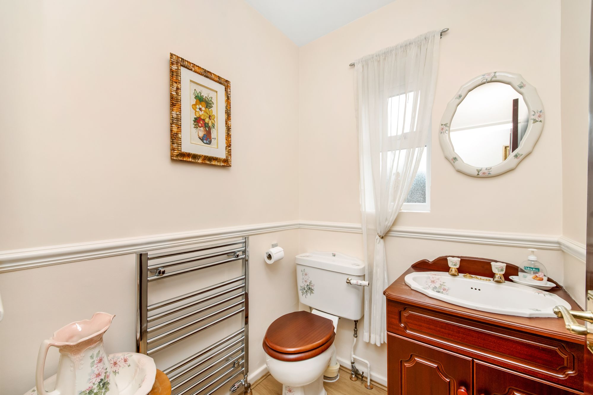 DOWNSTAIRS WCThe high-quality flooring continues from the entrance hall into the downstairs WC, which features a traditional patterned two-piece suite comprising a low-level WC and a broad wash-hand basin set within a vanity unit. There is a a decorative dado rail, a chrome ladder-style radiator, inset ceiling spotlights, and a double-glazed window with obscure glass and a tiled sill to the front elevation.