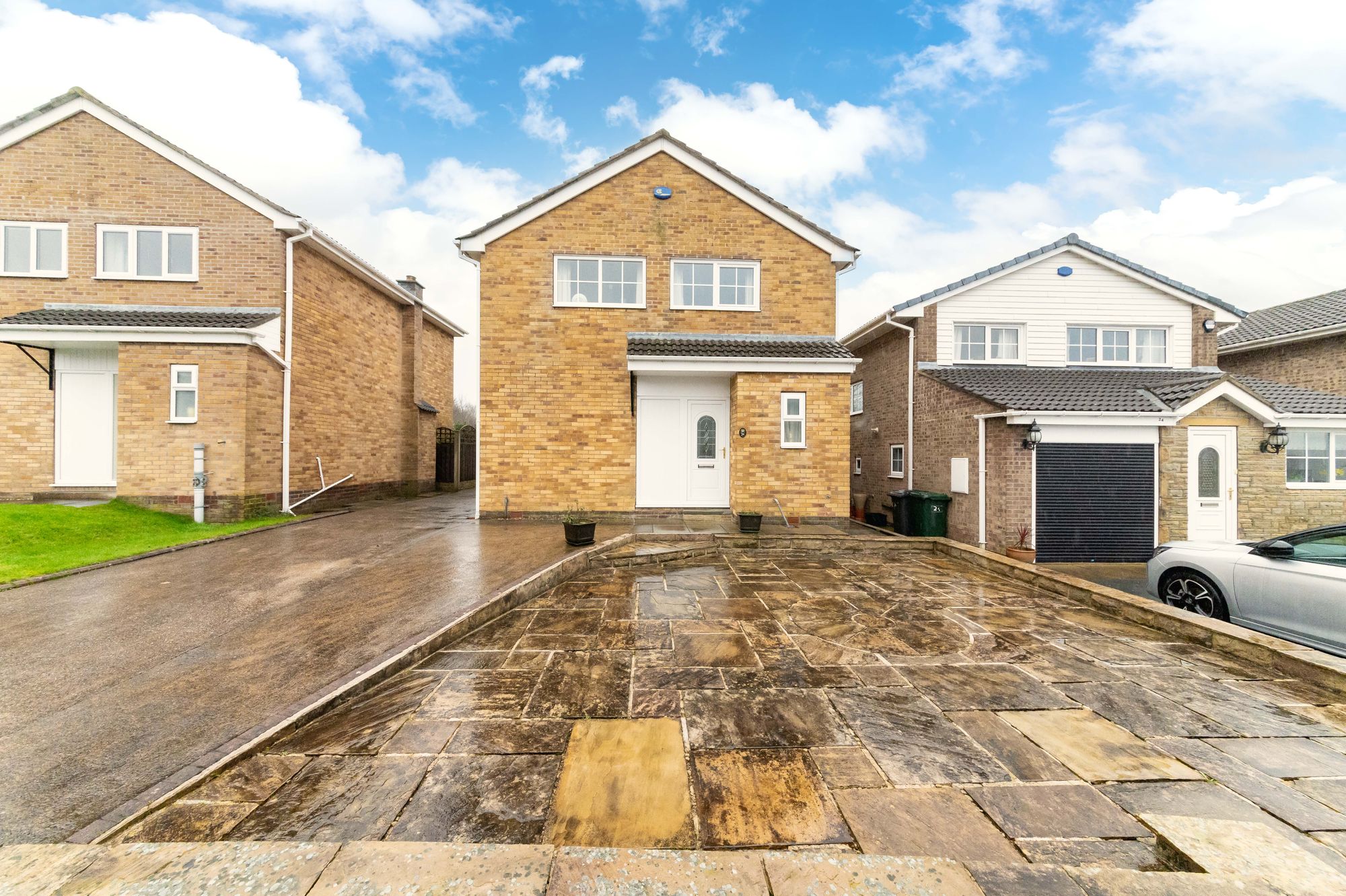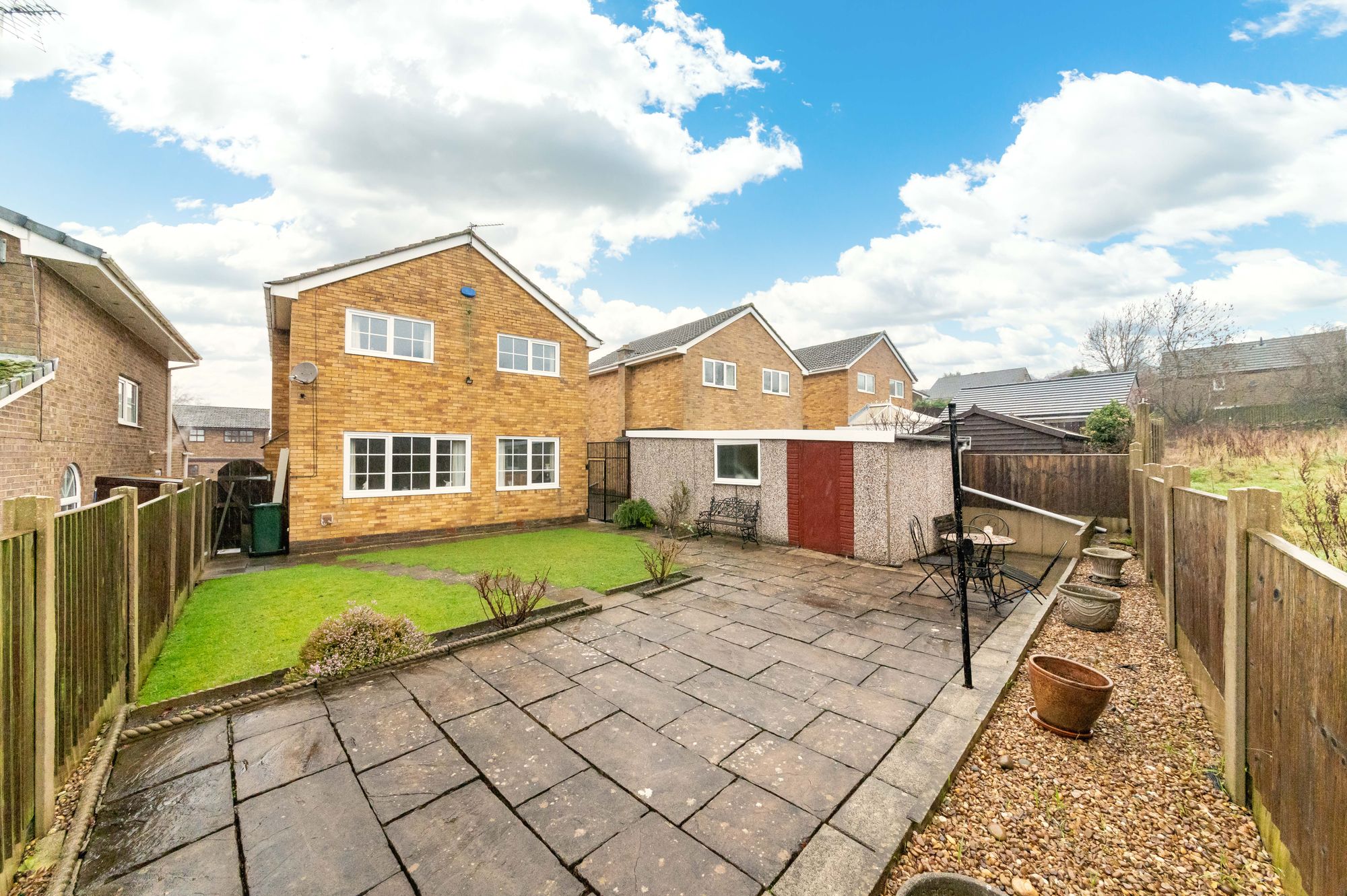 The property accommodation briefly comprises of entrance hall, downstairs WC, open-plan living-room/dining room, kitchen and pantry to the ground floor. To the first floor there are three generous proportioned bedrooms and the house bathroom. Externally there is a tandem driveway leading to an extended detached garage. To the front is a substantial patio ideal for sitting out, to the rear is an enclosed garden with lawn areas and a patio at the top of the garden.