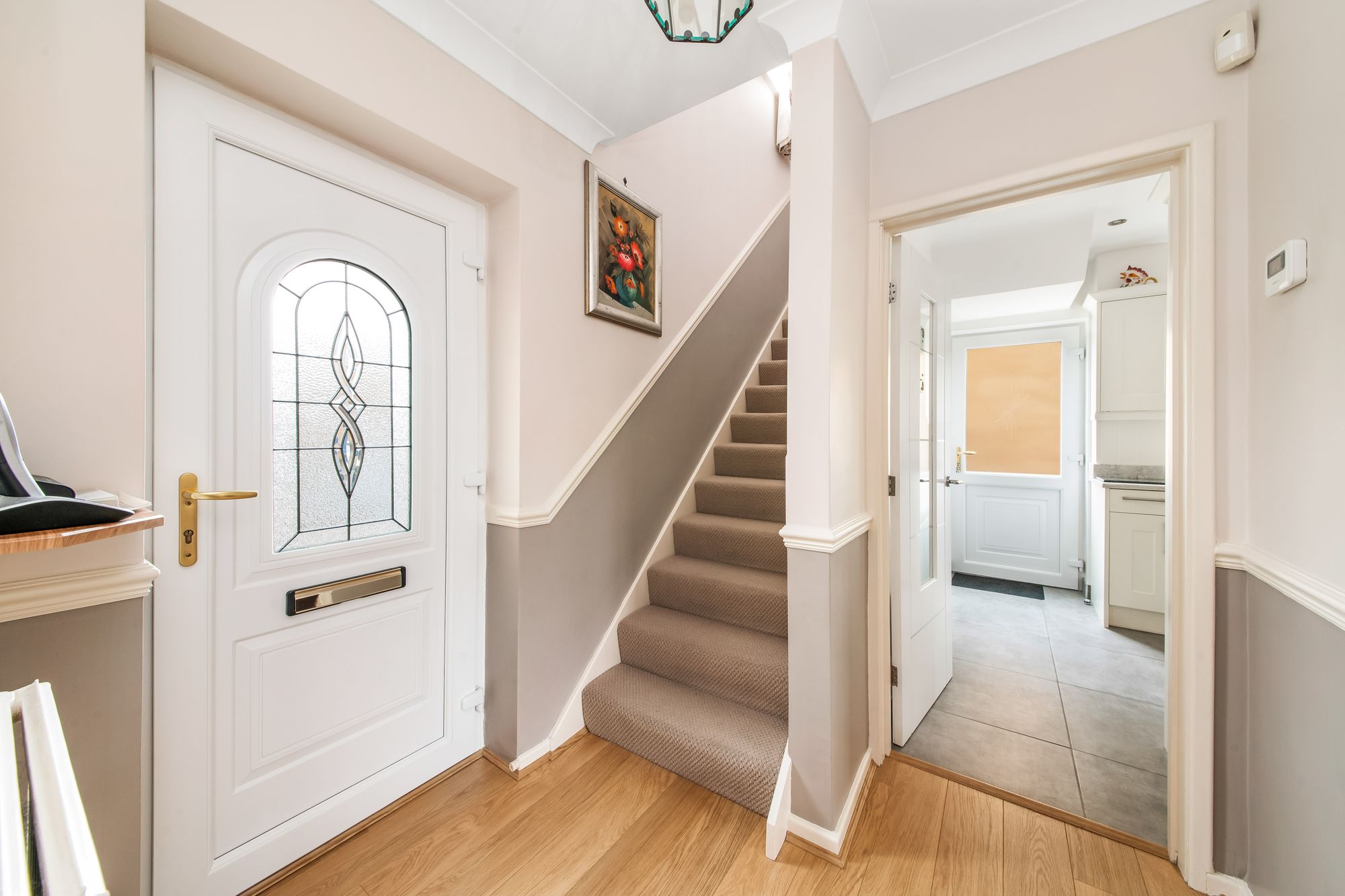 Enter into the property through a PVC front door with obscure glazed inserts and leaded detailing into the entrance hall. The hall features high-quality flooring, decorative ceiling coving, a dado rail, and a ceiling light point. There is a staircase rising to the first floor, complemented by a decorative dado rail and radiator. Multi-panelled timber doors provide access to the downstairs WC and enclose the cloaks cupboard, while stylish multi-panelled timber and glazed doors lead through to the lounge and kitchen.