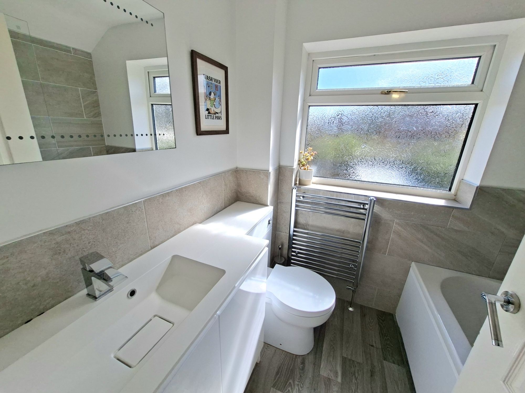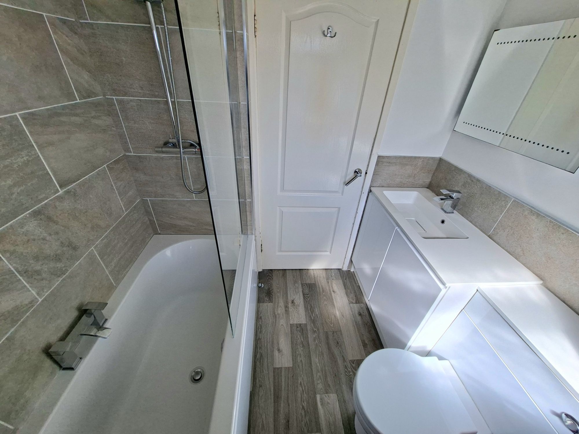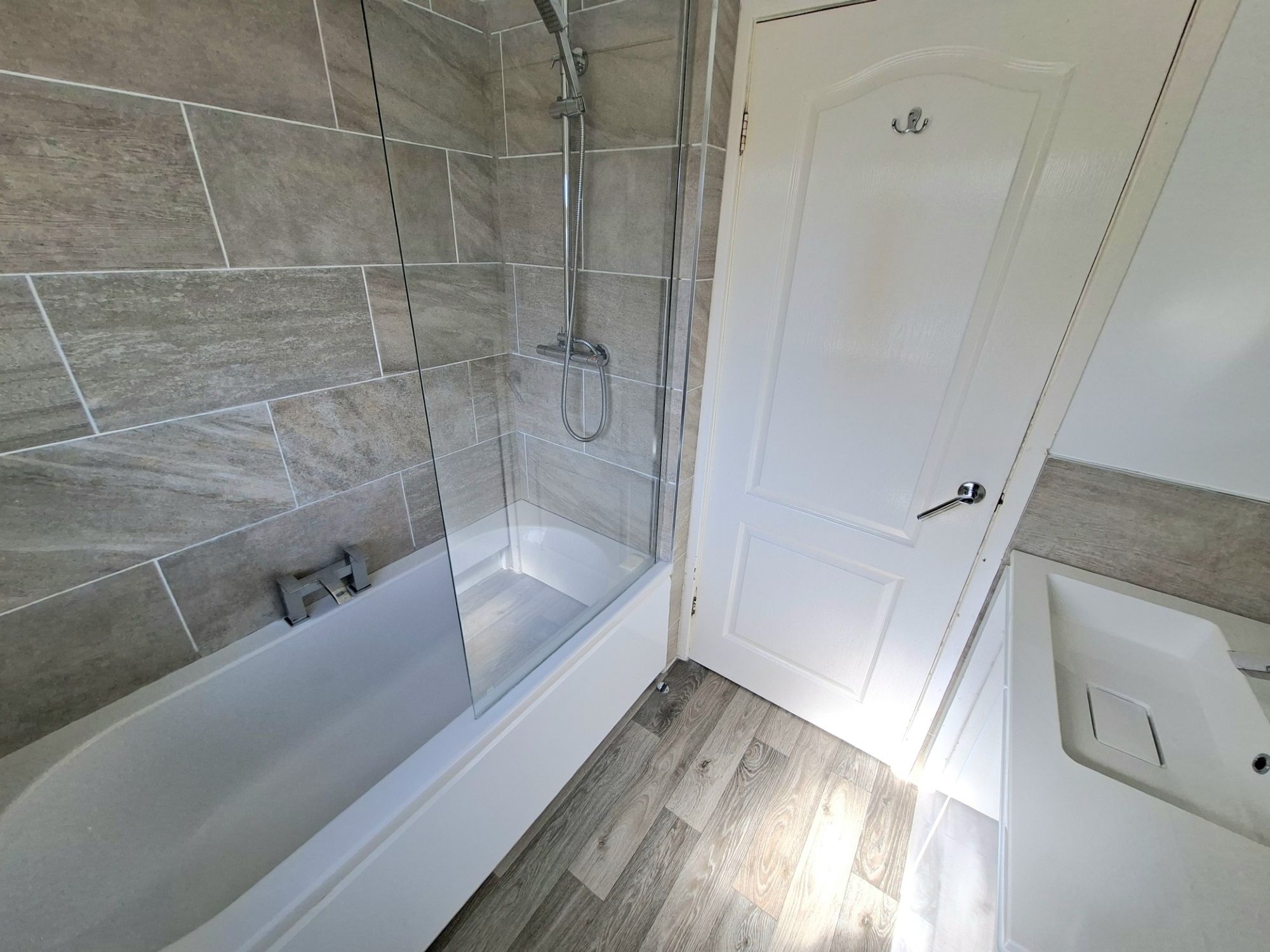FAMILY BATHROOMThe family bathroom is modern and very well presented with floor to ceiling tiled walls, a three-piece bathroom suite and shower over the bath.