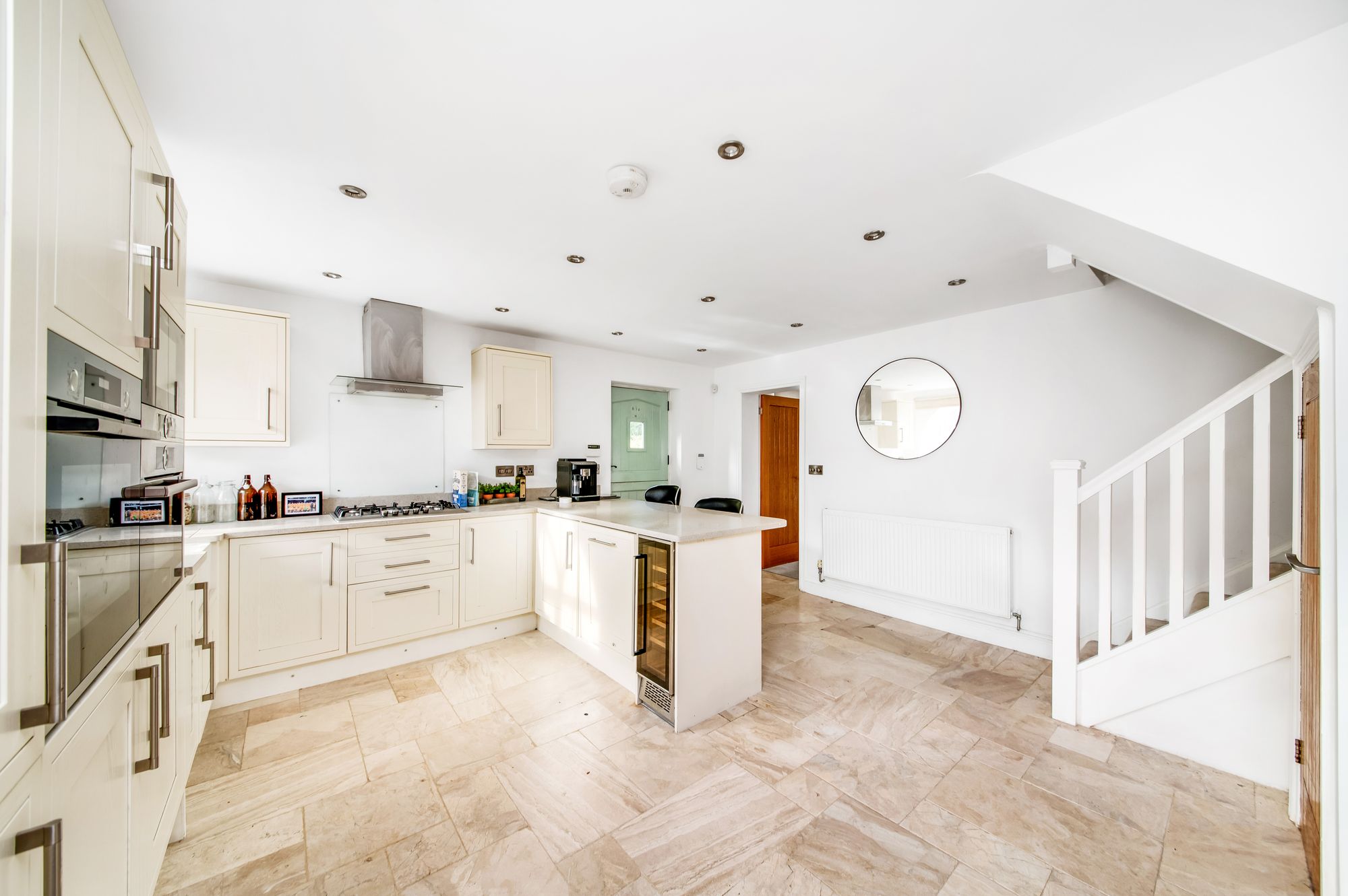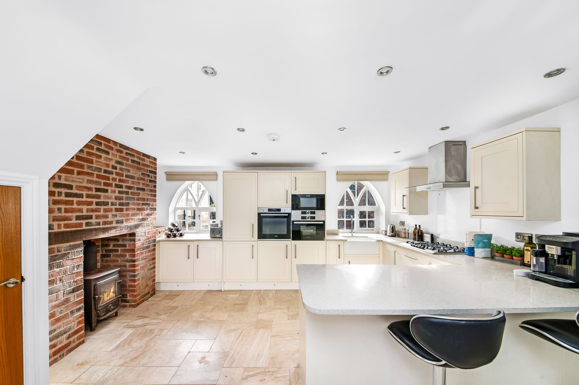 As the photograph suggests, there is a full array of appliances, a breakfast bar area and a feature brick chimney breast fireplace with cast iron glaze fronted wood burning stove. There is high quality flooring, inset spotlighting to the ceiling,and beautiful period windows to the front.