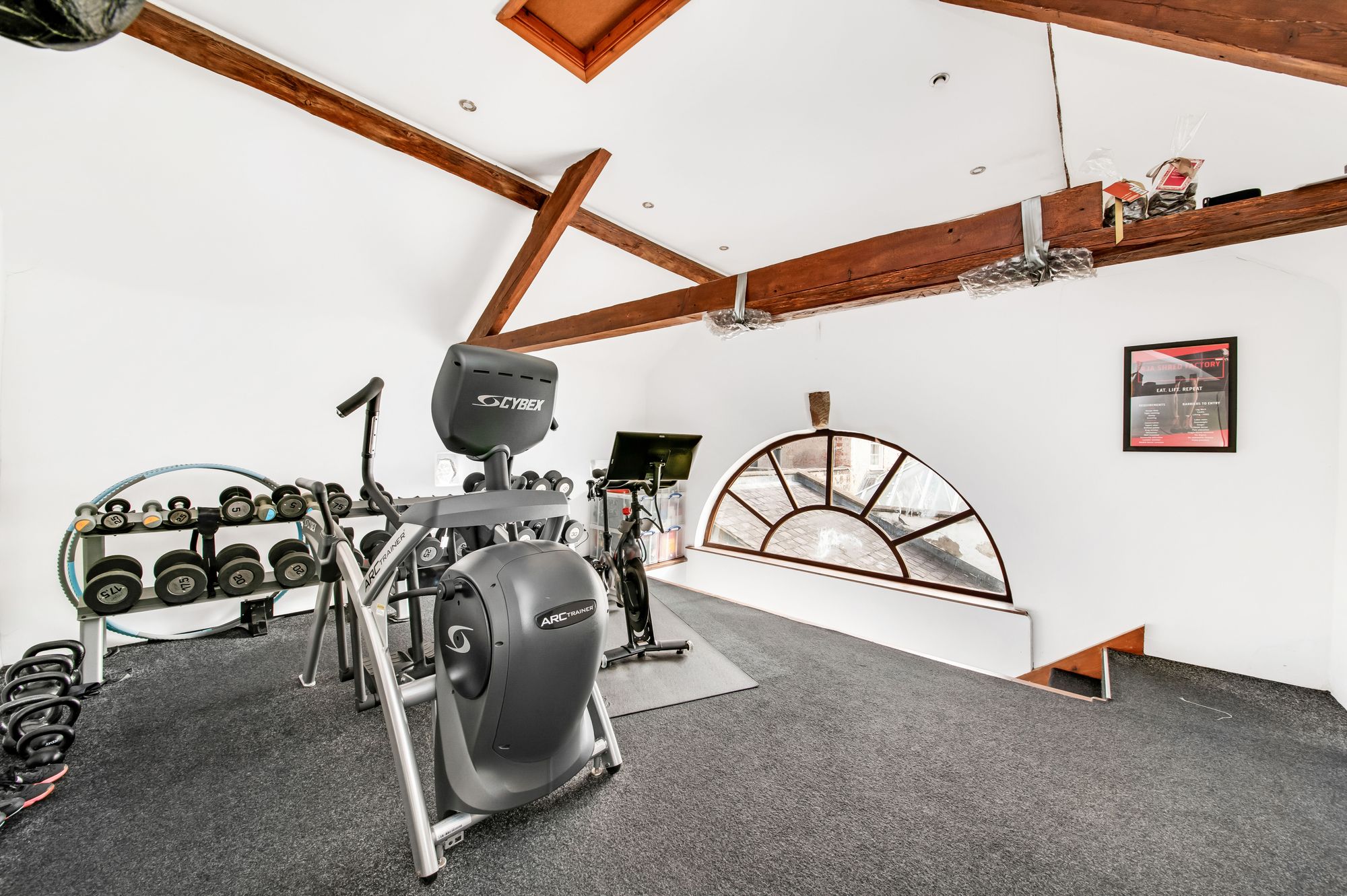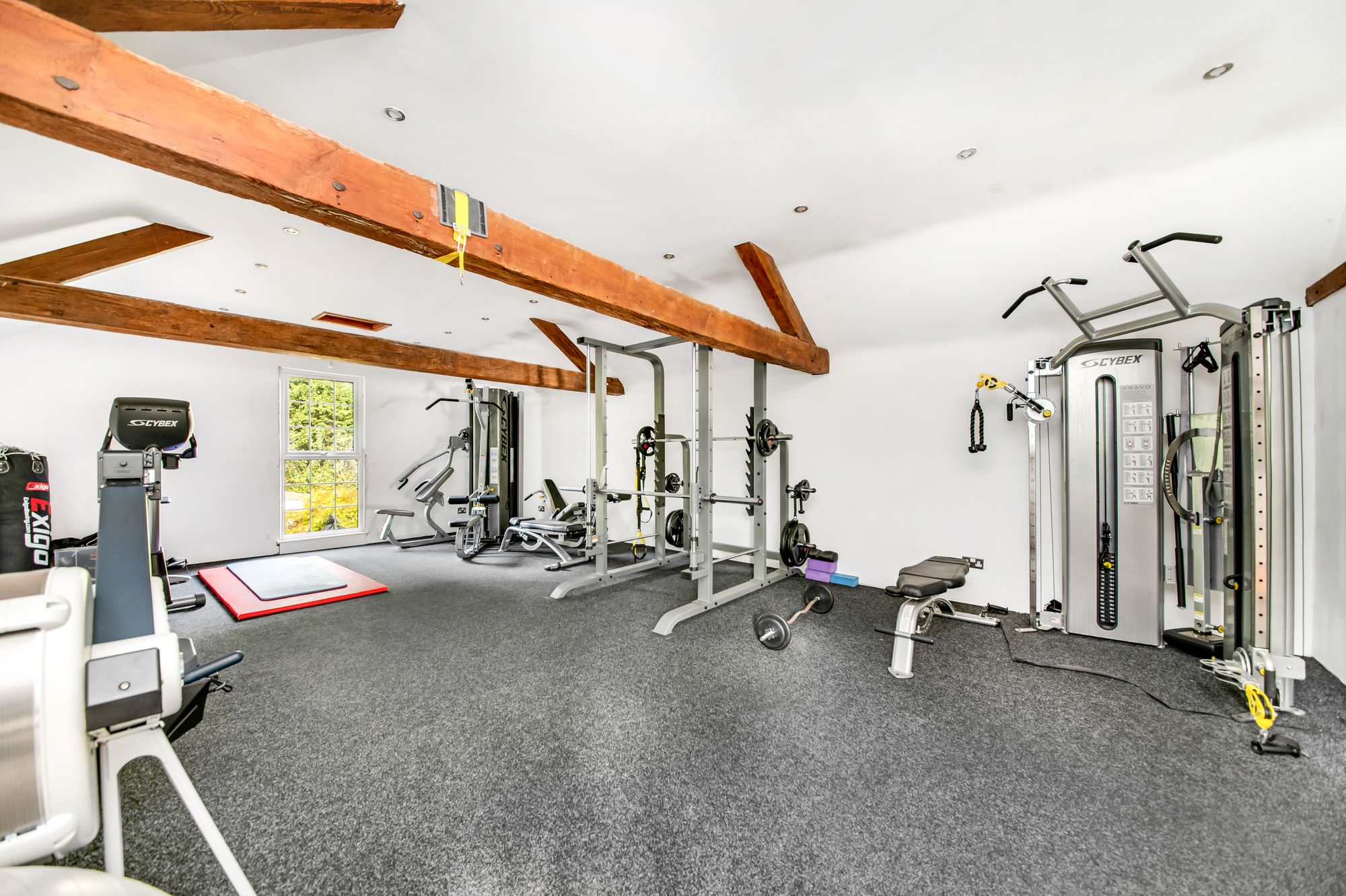 Further lobby gives access to a secondary staircase, which rises up to an entertainment room stroke gym. This, as the photograph suggests, is superbly presented and has a variety of windows, beams on display, inset spotlighting to the ceiling. It is presented with two areas, both with a good amount of space.
