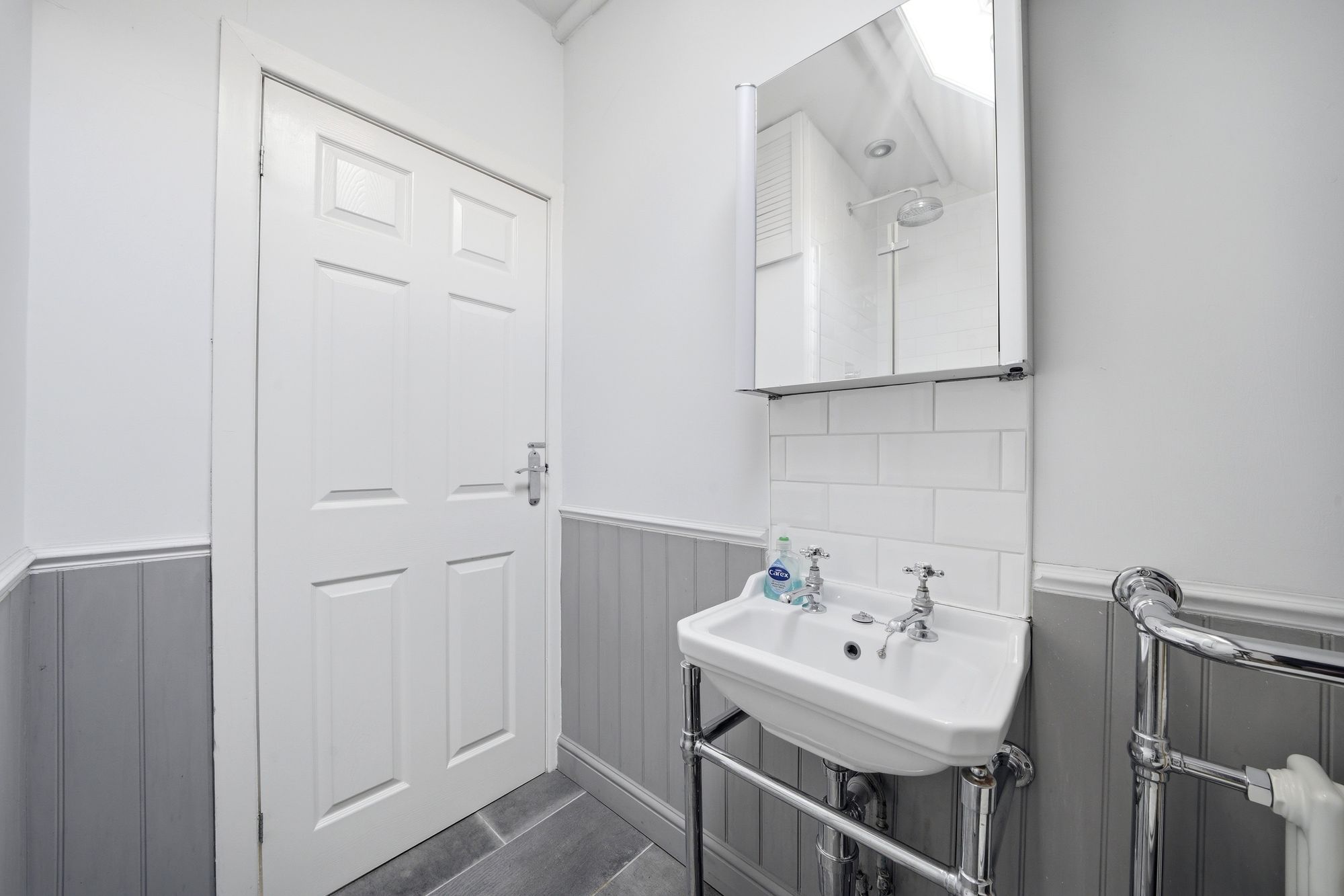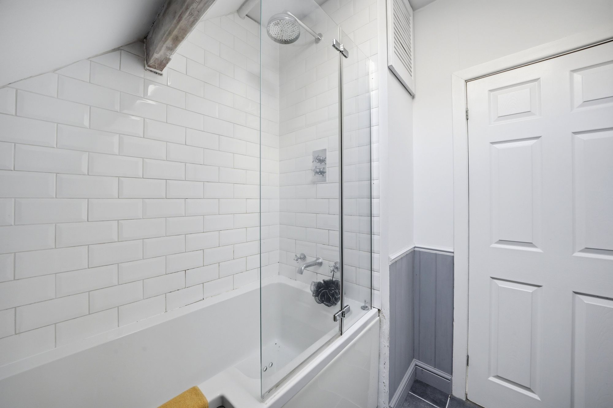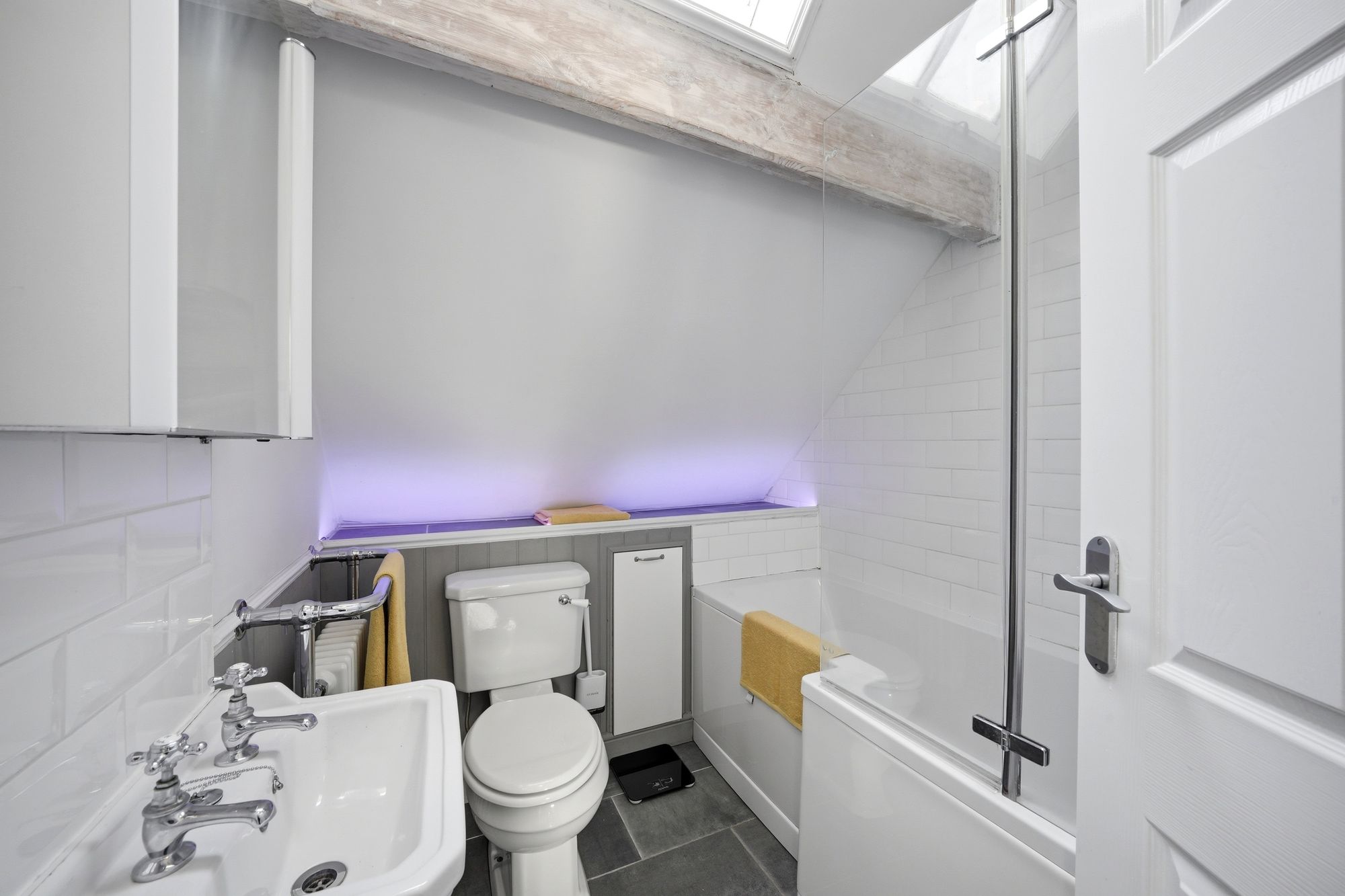 With a timber and glazed skylight, ceiling light point, inset ceiling downlighter, part tiled walls together with part tongue and groove bordering to dado height, tiled effect flooring, chrome heated towel rail incorporating column radiator and fitted with a suite comprising panelled bath with glazed shower screen and chrome shower fitting over with fixed shower rose, handwash basin with chrome hanging rail beneath and low flush w.c.