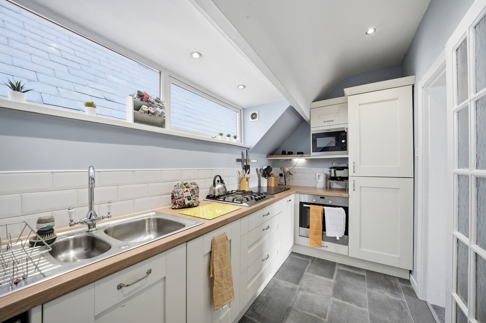 With two uPVC double glazed window, inset ceiling downlighters, column style radiator and fitted with a range of shaker style cream cupboards and drawers, these are complimented by contrasting overlying worktops with tiled splashbacks, there is a Bosch four ring stainless steel gas hob, Bosch stainless steel electric fan assisted oven, AEG stainless steel microwave, integrated fridge, integrated freezer, plumbing for dishwasher, carousel unit and an inset one and a half bowl single drainer stainless steel sink with chrome mixer tap. To one side a door gives access to a store.