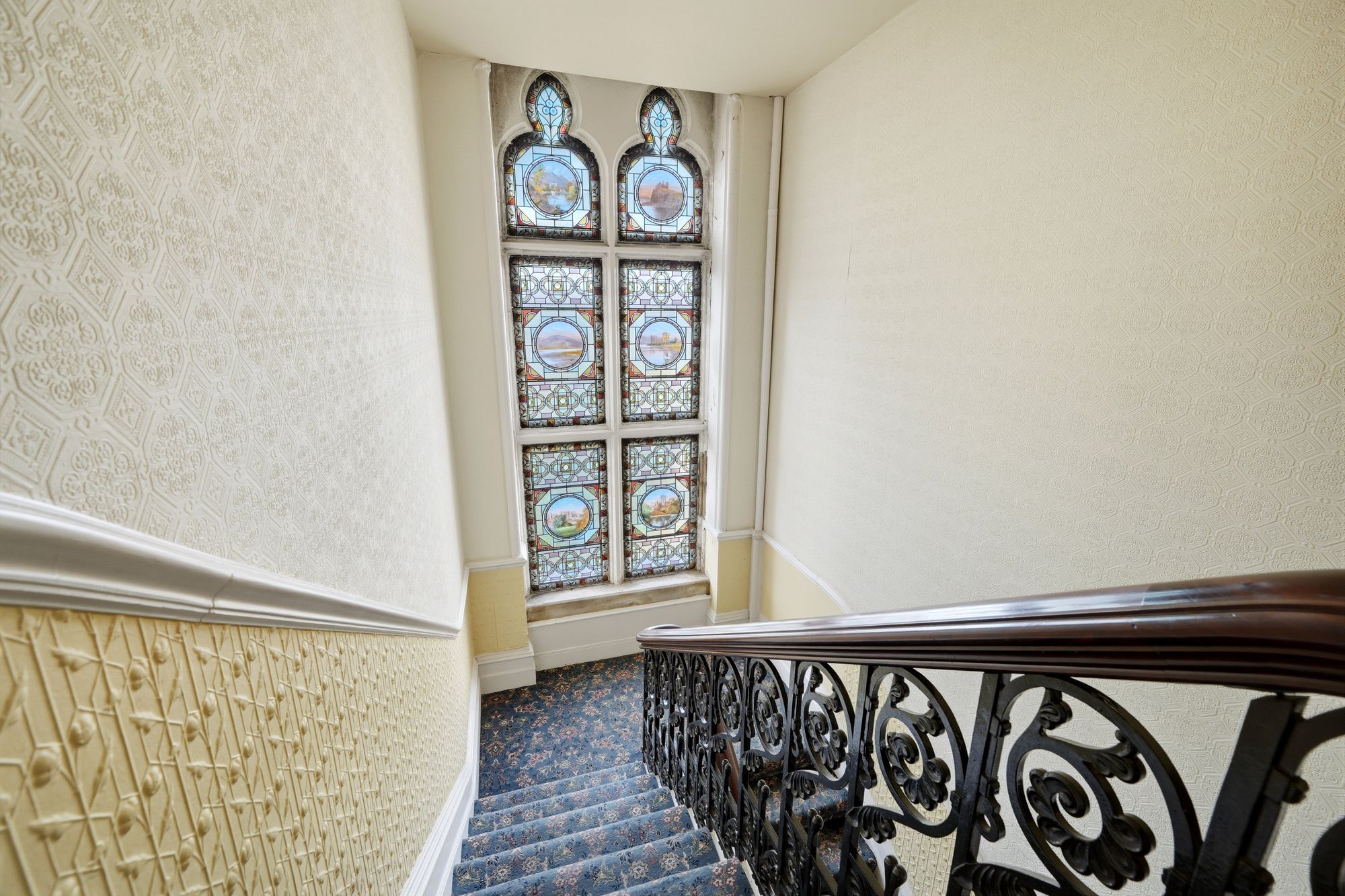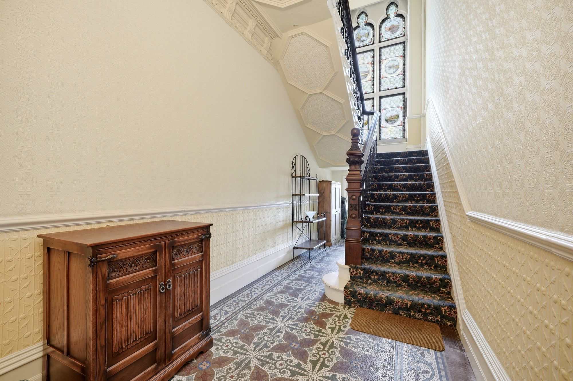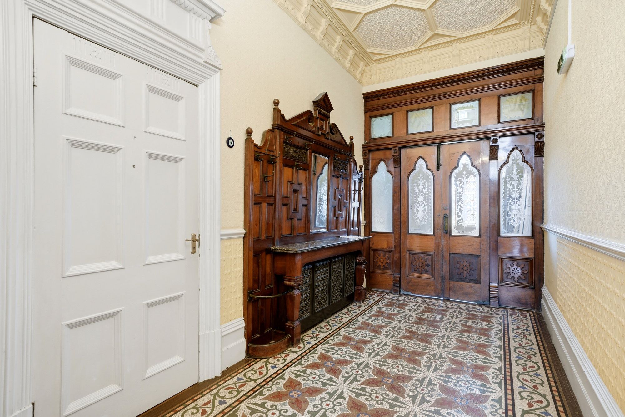 A stone built and pillared entrance portico leads to a communal entrance vestibule. This has ornate plaster work to the ceiling, mosaic tiled floor and a lovely timber panelled and leaded stained-glass door. From the vestibule twin carved oak and etched glass doors open into a communal entrance hall this has a continuation of the mosaic tiled floor, there is ornate plaster work to the ceiling, carved oak cloaks rack with an inset bevelled mirror and at the far end of the hallway a part canter levered staircase with polished Newell post together with wrought iron balustrade and timber hand rail rises to the first floor. To the half landing there is a magnificent mullioned leaded and stained-glass window which fills this area with natural light. From the first floor a further staircase rises to the second floor giving access to the apartment.