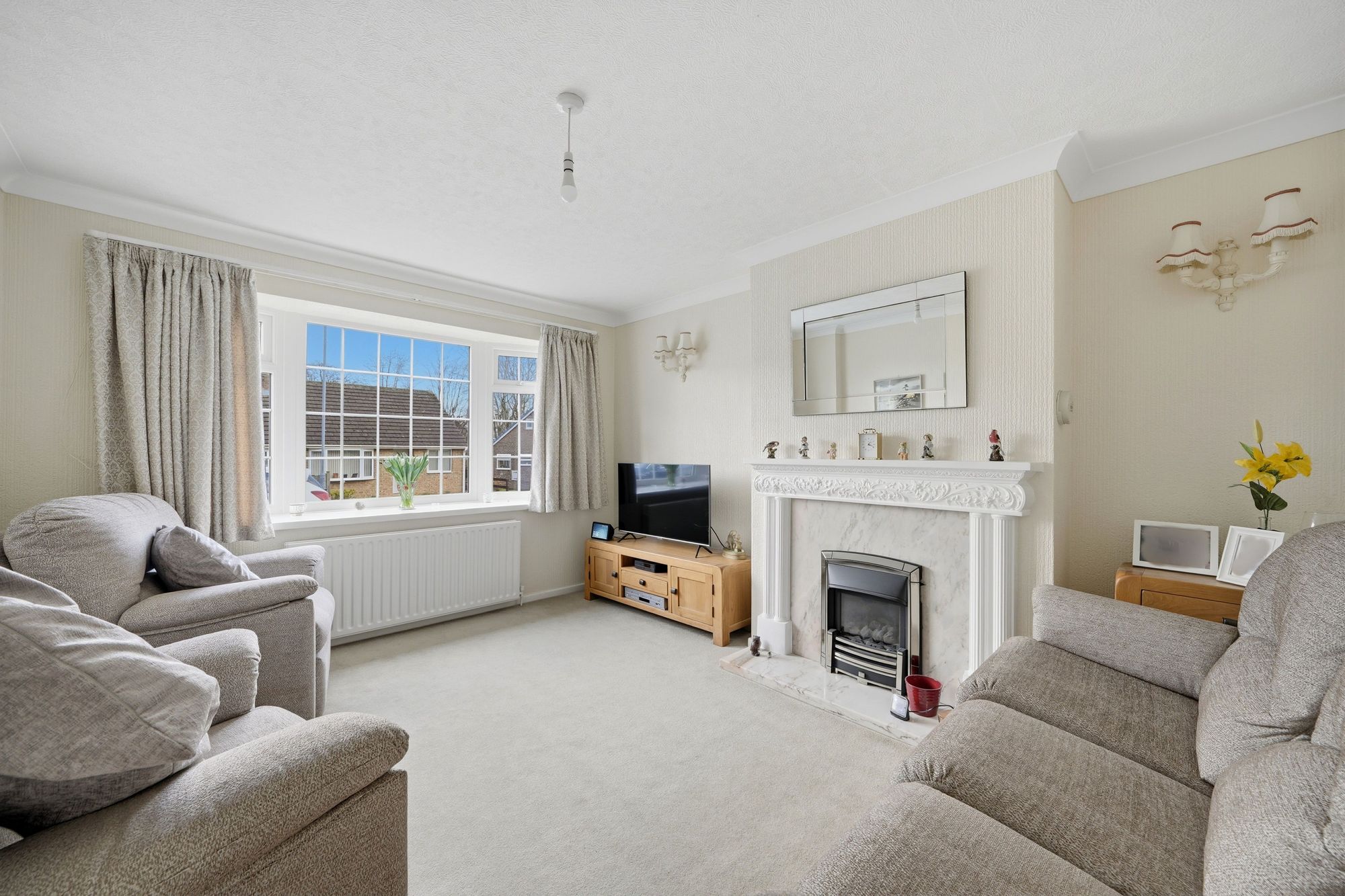 A comfortable and well proportioned reception room situated to the front of the bungalow and having a uPVC double glazed splay bay window looking out across the garden, there is a ceiling light point, ceiling coving, central heating radiator, two wall light points and as the main focal point of the room there is feature fireplace with surround, conglomerate marble inset and home to coal effect gas fire which rests on a conglomerate marble hearth.