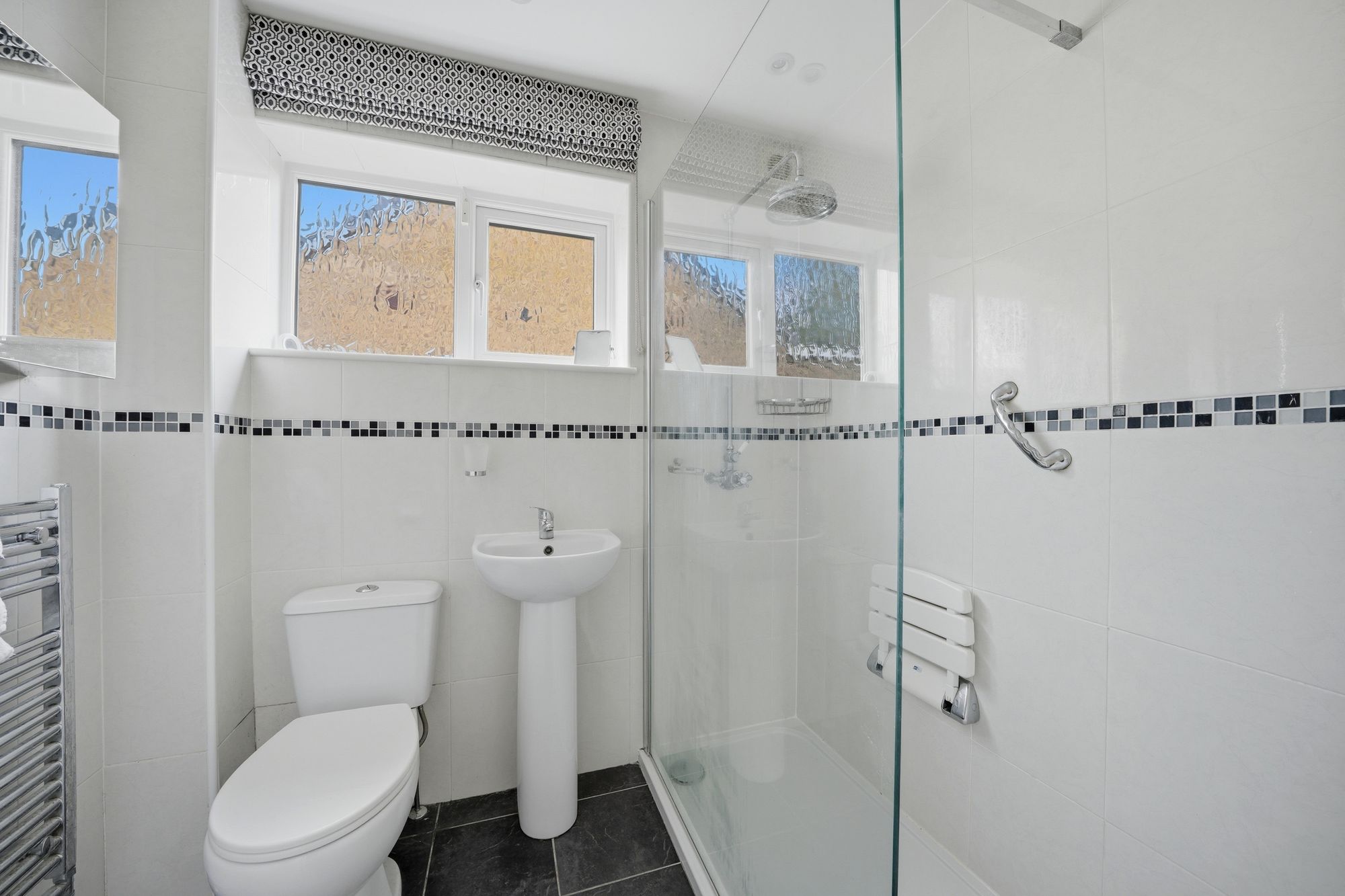 With a frosted uPVC double glazed window, inset ceiling downlighters, extractor fan, floor to ceiling tiled walls, tiled floor, linen cupboard, chrome ladder style heated towel rail and fitted with a suite comprising pedestal wash basin with chrome monobloc tap, low flush w.c and large walk-in shower with glazed side panel and chrome shower fitting.