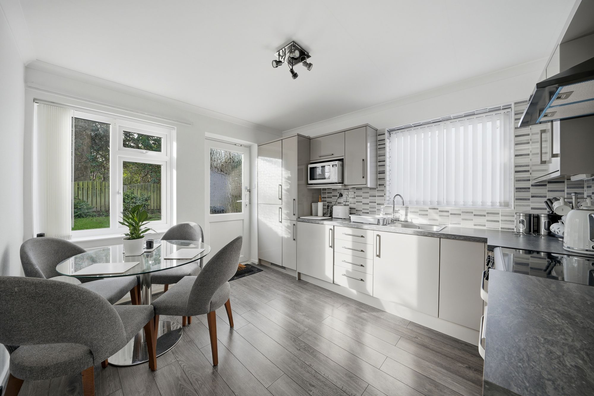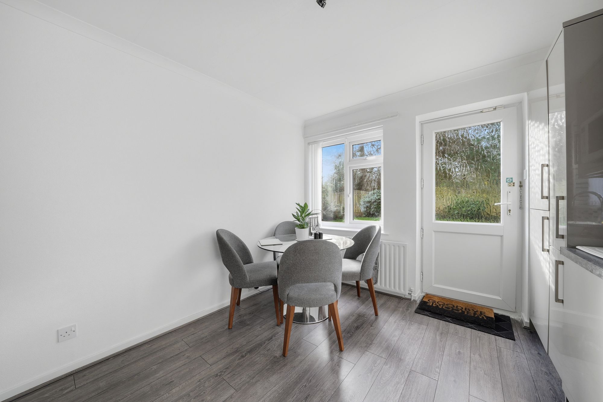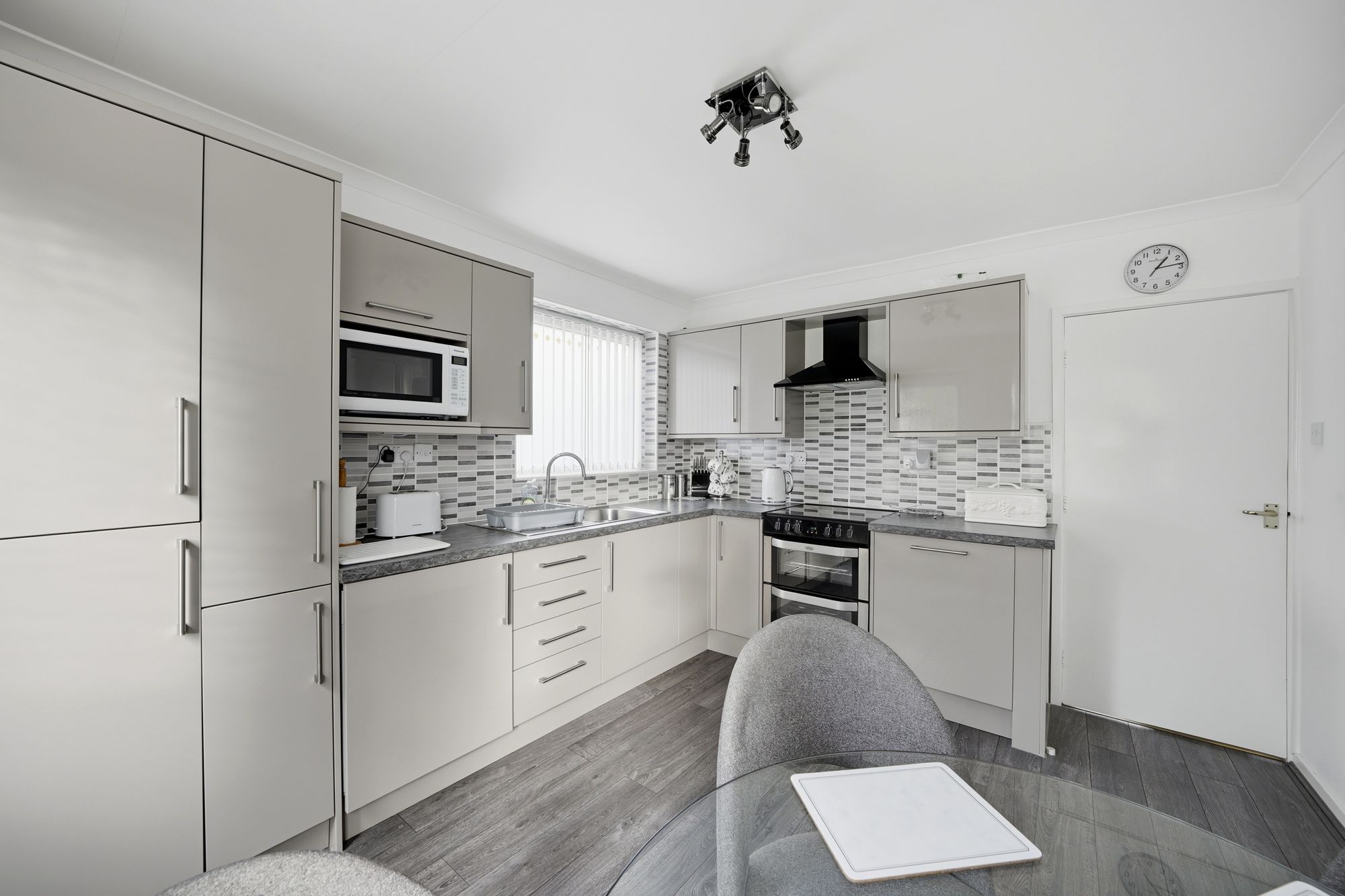 This has uPVC double glazed windows to the rear and side elevations together with a uPVC and frosted double glazed door giving access to the rear garden. There is a ceiling light point, ceiling coving, central heating radiator, grey plank effect laminate flooring, fitted with a range of modern grey gloss base and wall cupboards, drawers, overlying worktops with tiled splashbacks, inset single drainer stainless steel sink with chrome mixer tap, integrated fridge, integrated freezer, integrated washing machine, integrated dishwasher with a free standing Belling cooker with four ring halogen hob and electric double oven.