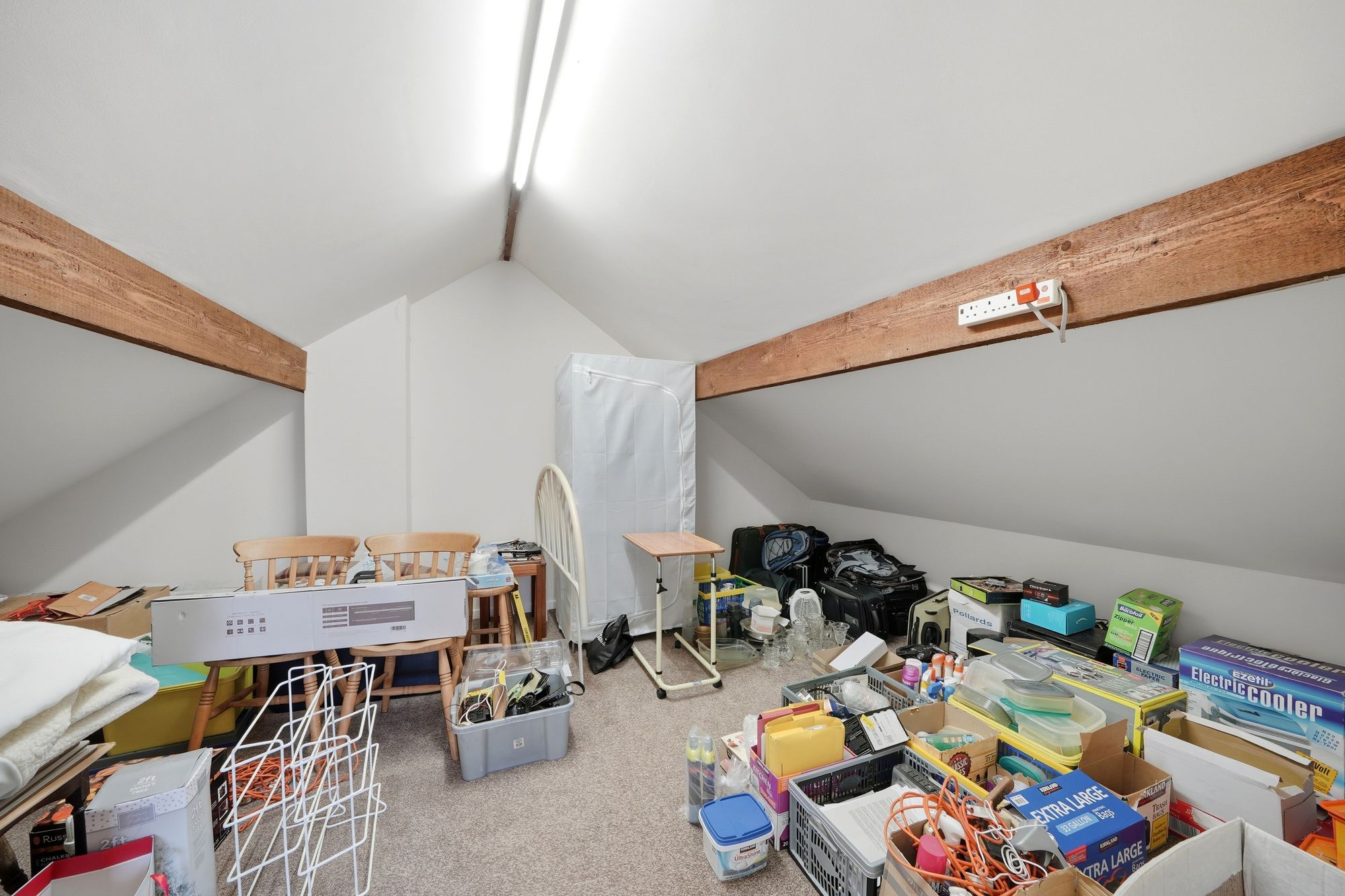 This has a pitched beamed ceiling with ceiling light point and no windows.