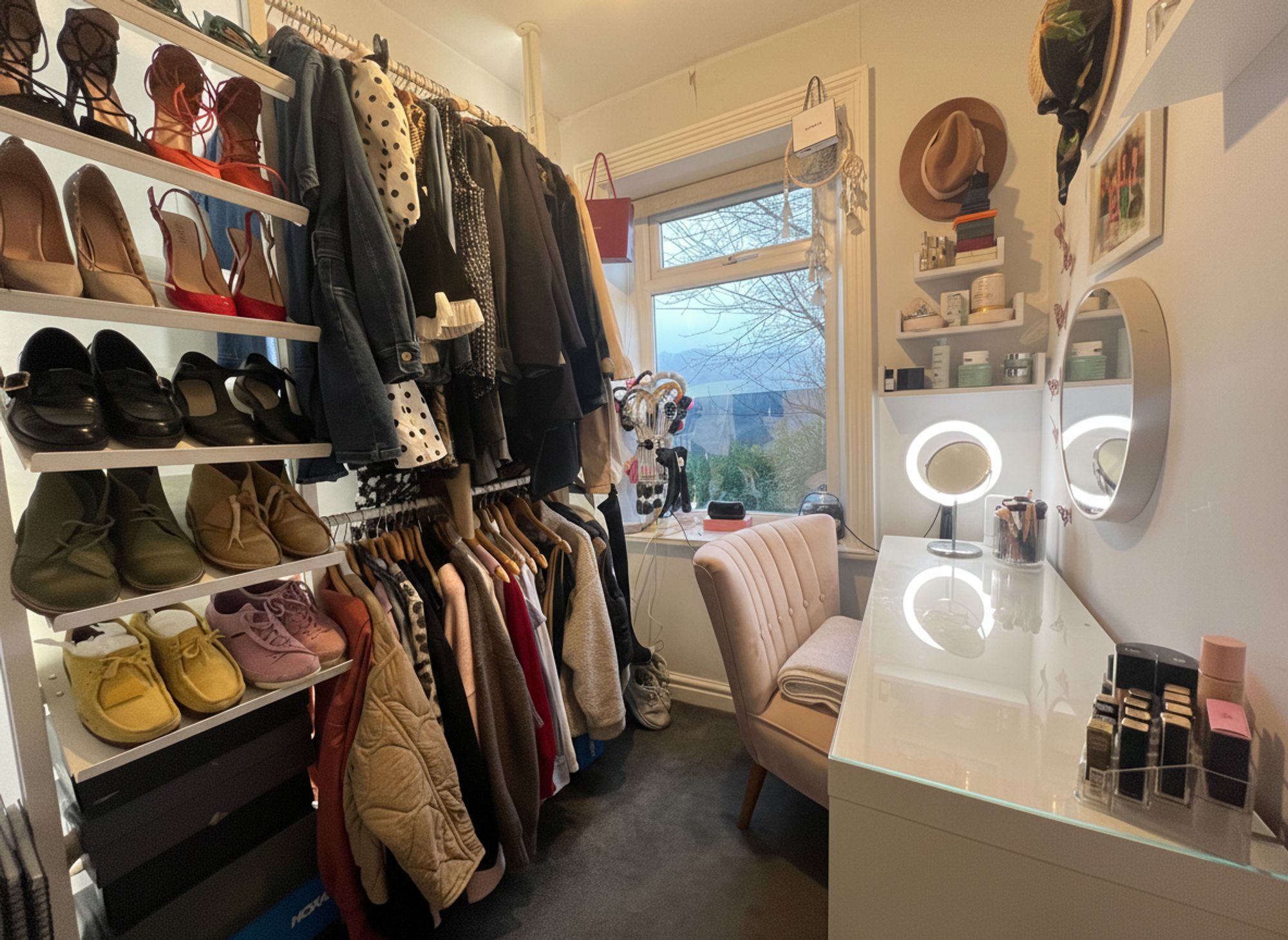 Bedroom three is currently utilised as a walk-in wardrobe / dressing room but can be utilised as a home office, single bedroom or nursery. There is a double-glazed window to the front elevation, again taking full advantage of panoramic views across the valley. There is a central ceiling light point.