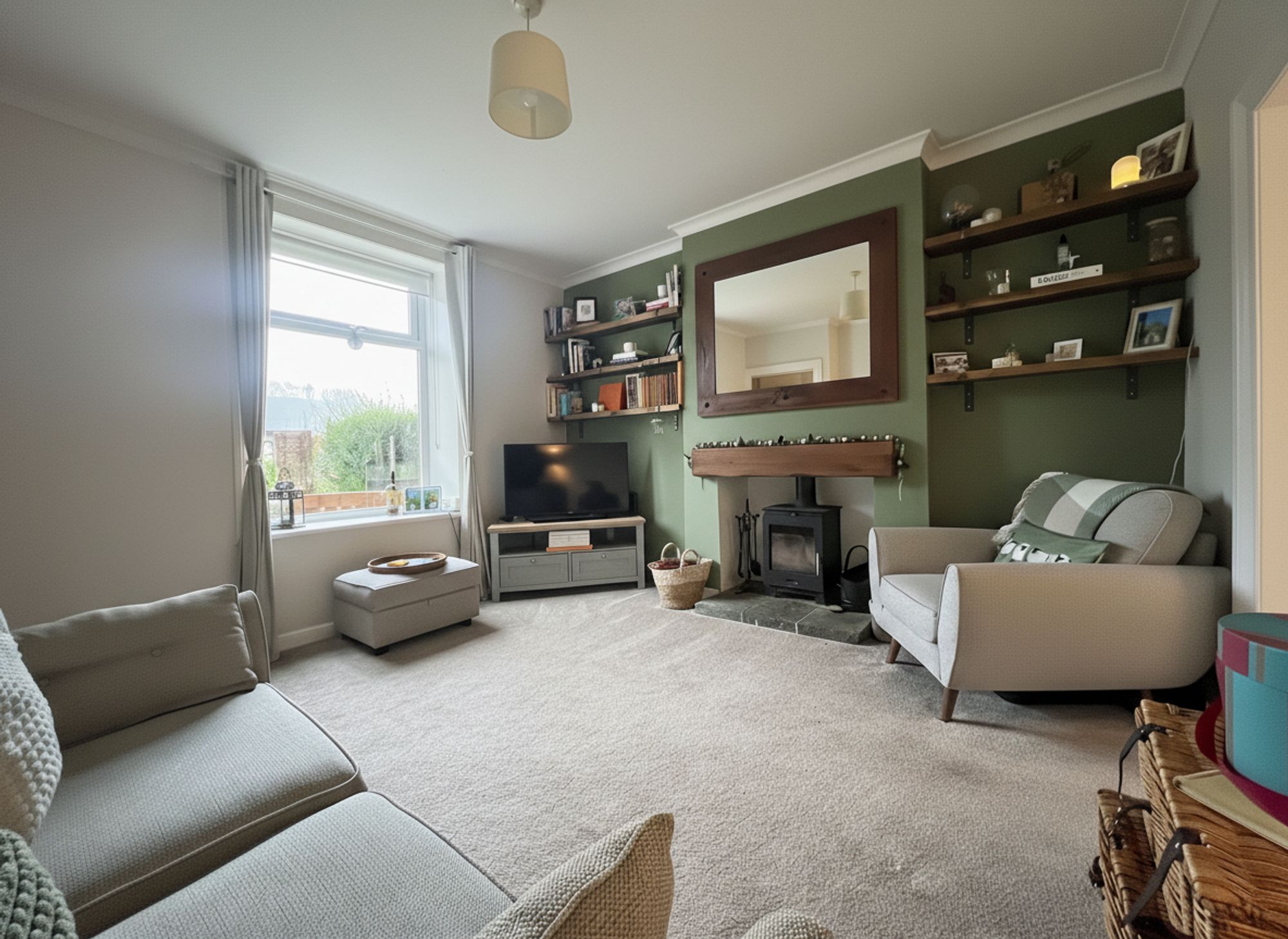 As the photography suggests, the lounge is a generously proportioned light and airy reception room, which features decorative coving to the ceilings, a central ceiling light point, radiator, and a double-glazed window to the front elevation, which has fabulous views across the property’s gardens and with open aspect views across the valley. An oak door provides access to the kitchen, and the focal point of the room is the inset fireplace with a Flavel, cast iron log burning stove, which is set upon a raised stone hearth.