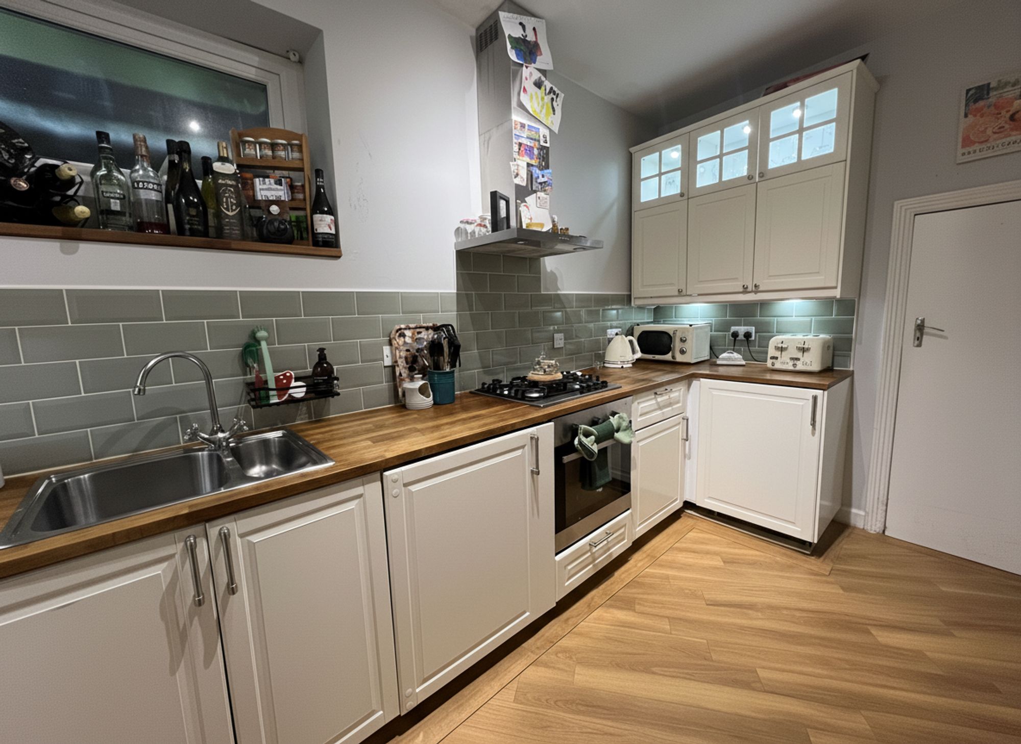 The kitchen features a wide range of fitted wall and base units with shaker style cupboard fronts and with complimentary oak work surfaces over, which incorporate a one-and-a-half-bowl inset stainless steel sink unit with chrome tap. The kitchen is equipped with built-in appliances, which includes a four-ring gas hob, with canopy style cooker hood over, a built-in electric fan assistant oven, an integrated dishwasher and there is space and provisions for an automatic washing machine. Additionally, the kitchen features glazed display cabinets with inset spotlighting, high gloss brick effect tiling to the splash areas, under unit lighting and LVT flooring. There is a double-glazed window with obscure glass to the rear elevation, a ceiling light point, radiator and a door provides access to a useful understairs pantry.