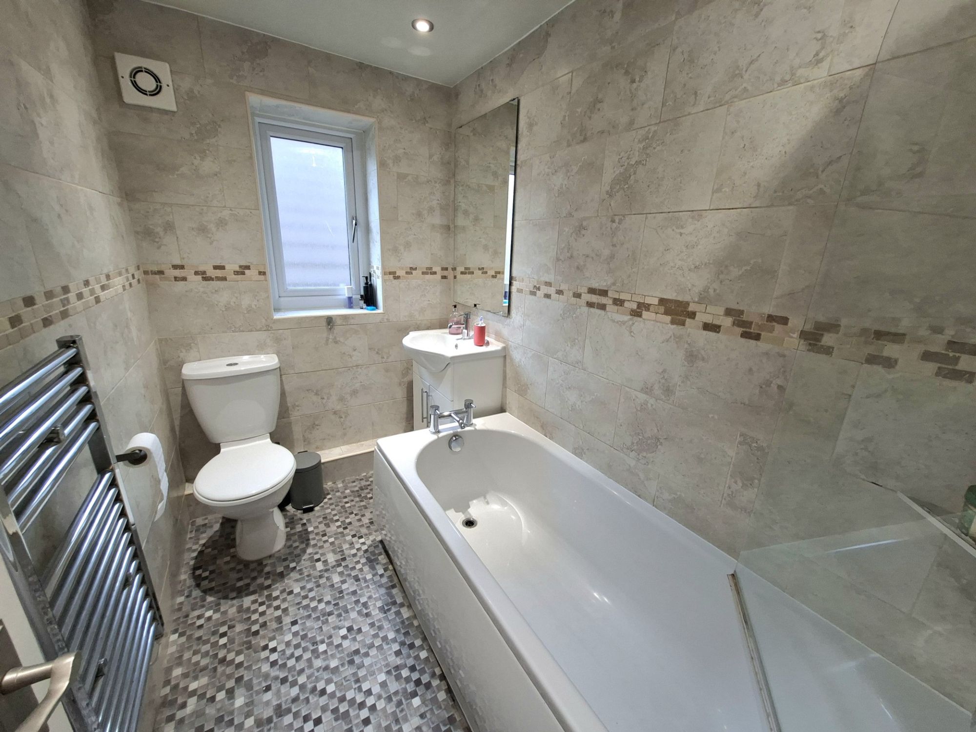 FAMILY BATHROOMThe modern, stylish family bathroom is very well presented with floor to ceiling tiling and shower over the bath with glass shower screen.