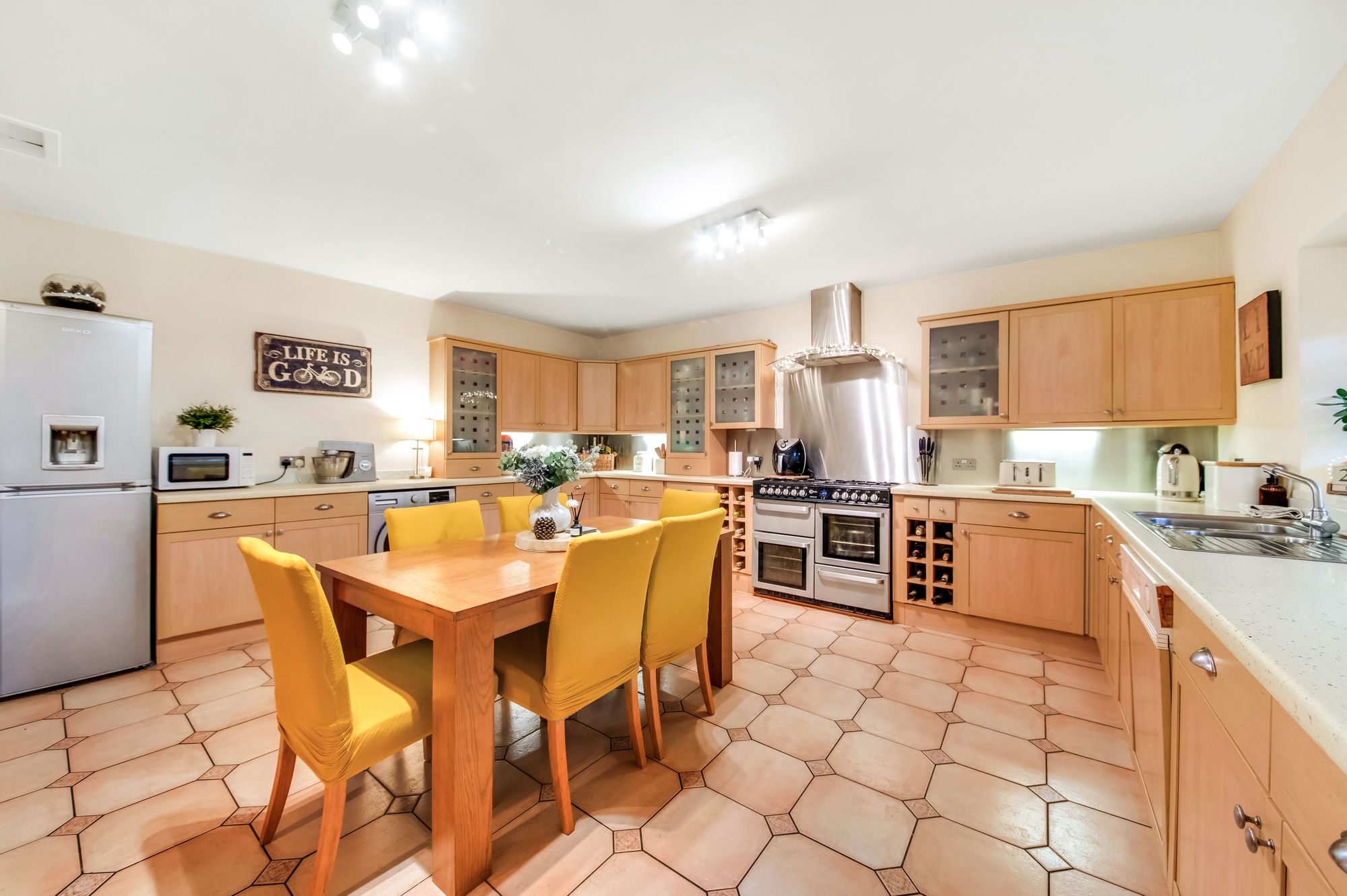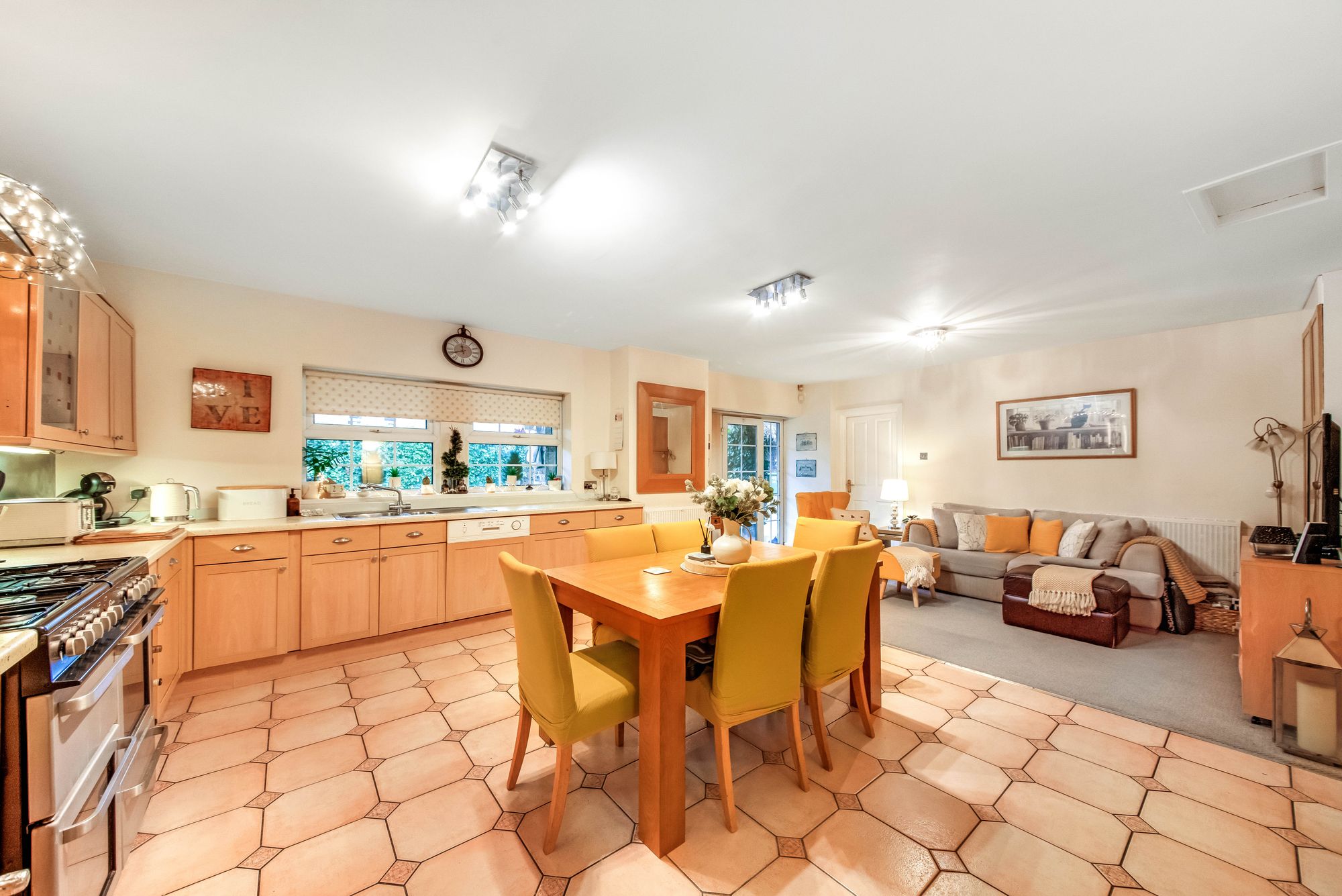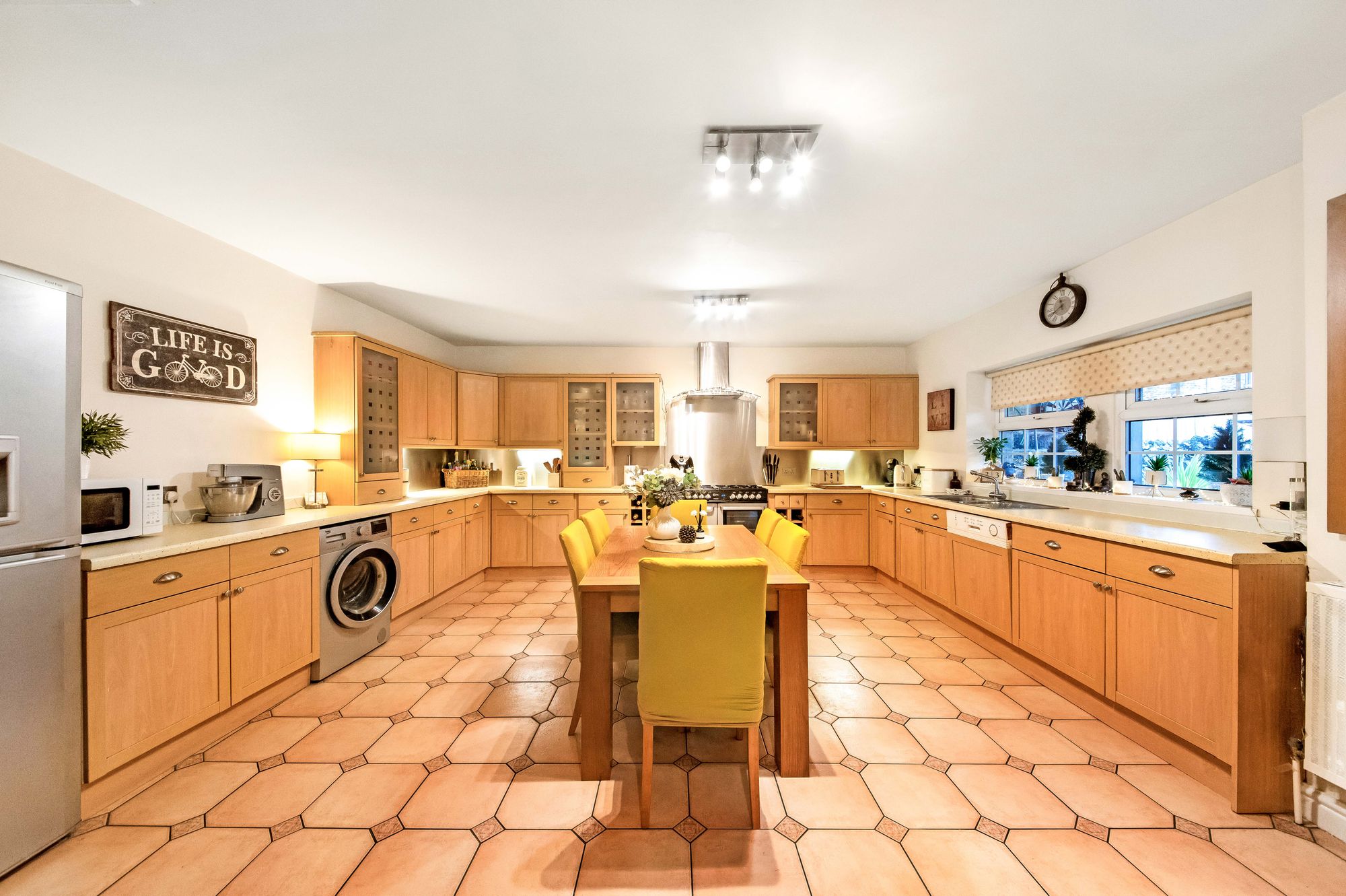 The open plan dining kitchen and family room is a most generously proportioned room which is an ideal space for entertaining. It features a double-glazed external door with an adjoining window at either side to the front elevation and a bank of double-glazed Mullioned windows to the front elevation with views on to the gardens. The family area is carpeted and features a ceiling light point, radiator and useful fitted cupboards. The family area then seamlessly leads into the dining kitchen which is particularly spacious with a wide range of fitted wall and base units with shaker style cupboard fronts and with complementary rolled edge work surfaces over. The work surfaces incorporate a one and a half bowl stainless steel sink with drainer unit and chrome mixer tap. The kitchen features a stainless-steel splash back, space and provisions for a range cooker with canopy cooker hood above, glazed display cabinets, under unit lighting and space and provisions for an automatic washing machine