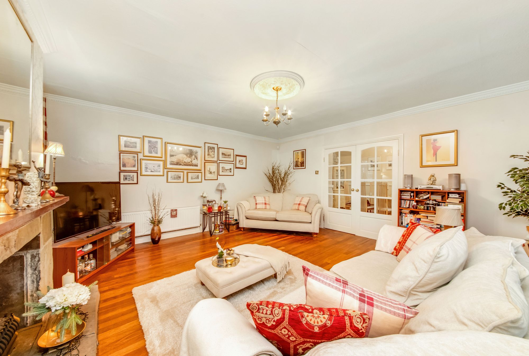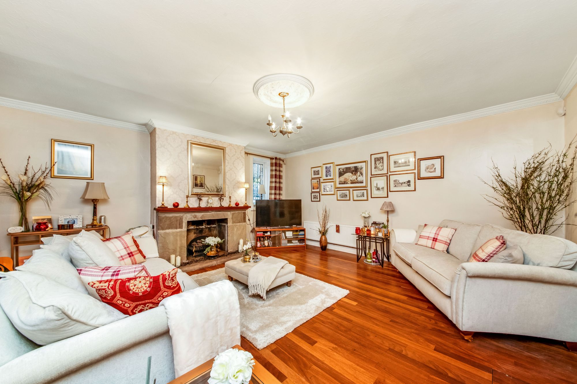 As the photography suggests, the living room is a generously proportioned, dual aspect reception room which features a double-glazed window to the side elevation and double-glazed French doors with adjoining windows at either side to the front elevation. There is attractive hard wood flooring, decorative coving to the ceilings, an ornate ceiling rose with a ceiling light point and two radiators. The focal point of the room is the beautiful stone fireplace with timber mantle above which is set upon a raised stone hearth.