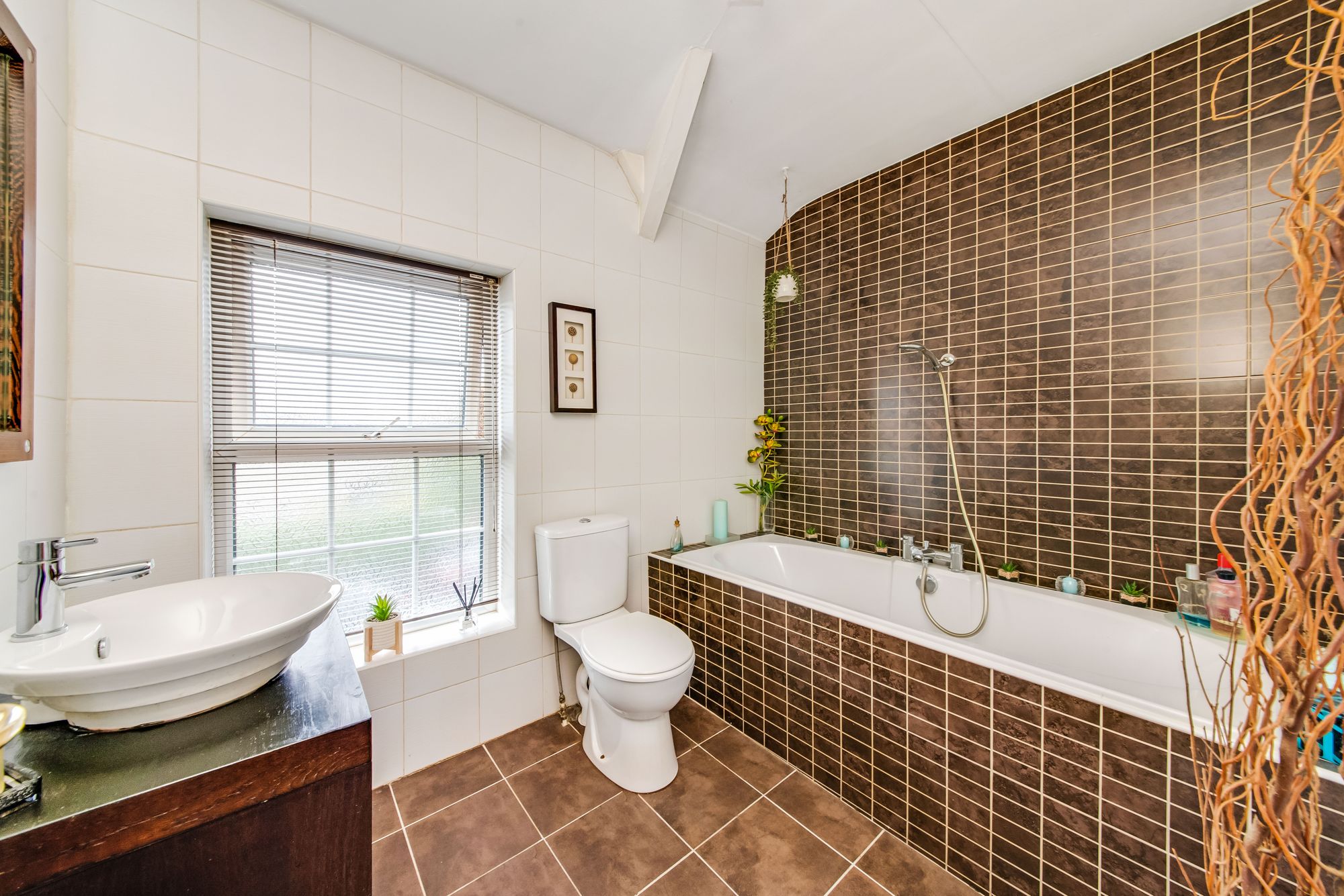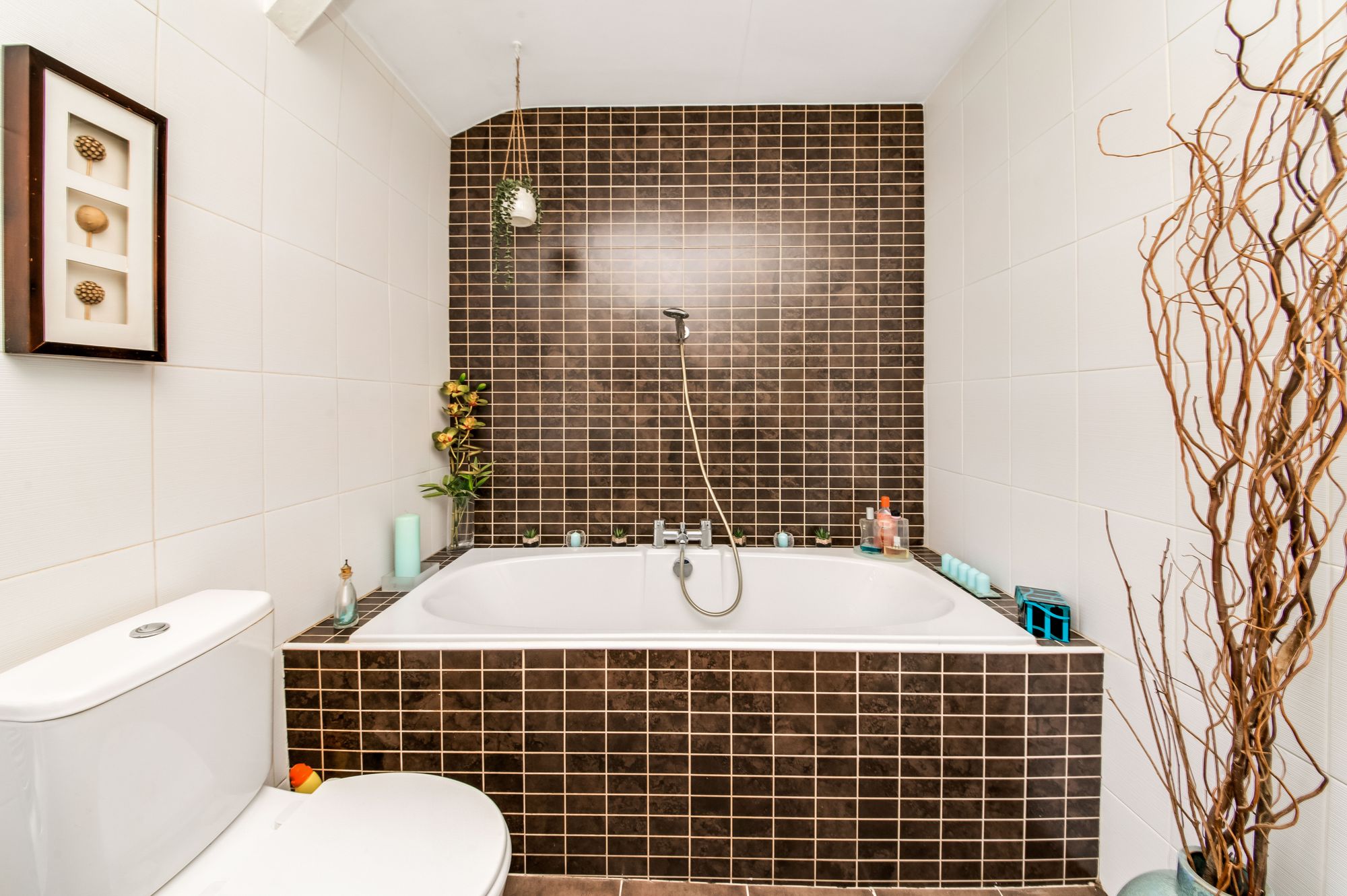 The house bathroom features a white three-piece suite which comprises of an inset double ended bath with shower head mixer tap and tiled surround, a low-level W.C. with push button flush and a broad circular wash hand basin set upon a vanity shelf with glazed display shelving beneath and chrome mixer tap. There is tiled flooring and contrasting tiling to the walls and splash areas, a chrome ladder style radiator and a ceiling light point. Additionally, there is a double-glazed window to the front elevation with obscure glass and tiled surround.