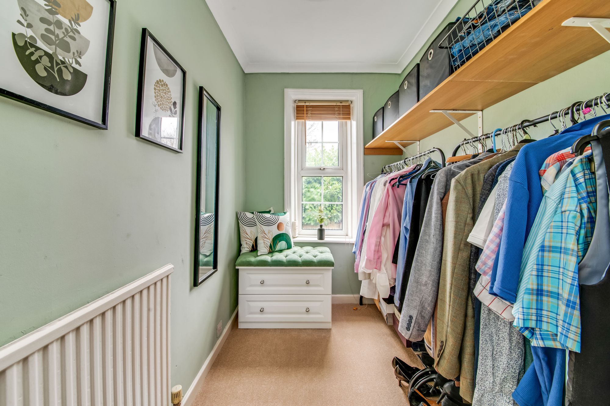 Bedroom four is currently utilised as a walk-in wardrobe/ dressing room. It could be used as a single bedroom, home office or nursery. It features decorative coving to the ceilings, a ceiling light point, a radiator, a double-glazed window to the side elevation and fitted shelving.