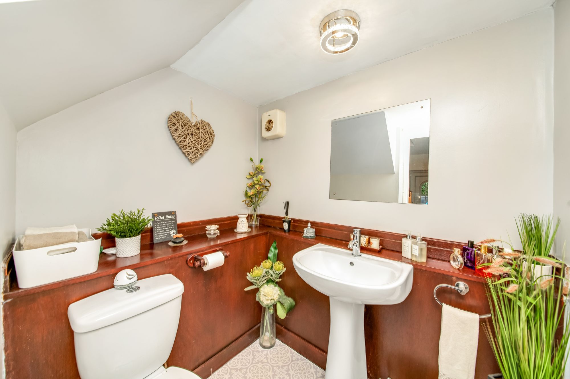 DOWNSTAIRS W.C.The downstairs W.C. features a modern white two-piece suite, which comprises of a low-level W.C. with push button flush and a broad pedestal wash hand basin with chrome monobloc mixer tap. There is a radiator, ceiling light point and an extractor fan.