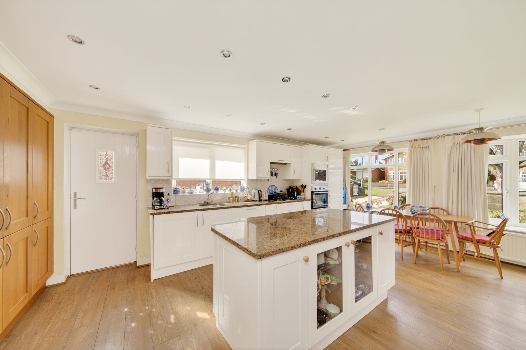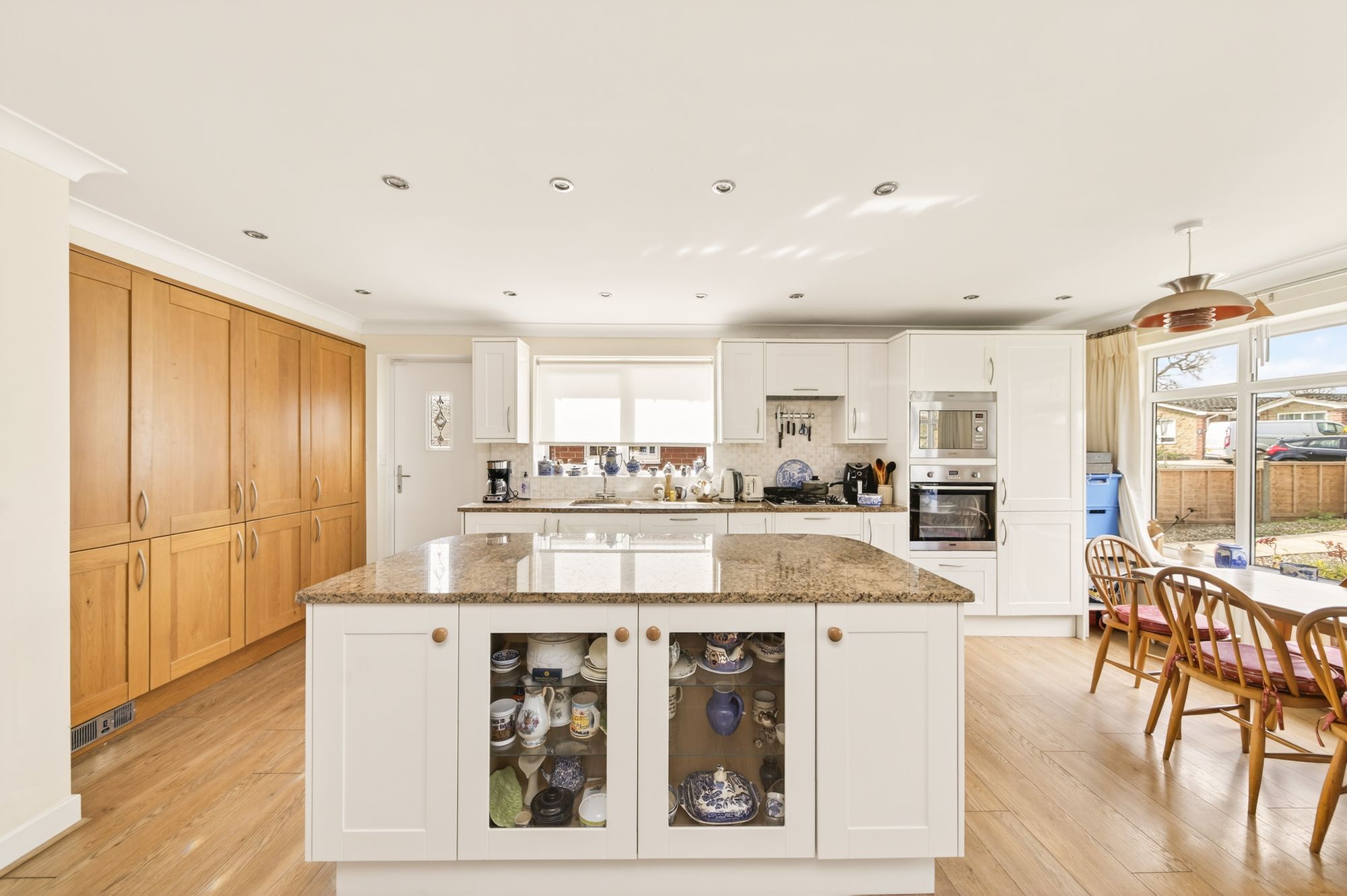 The kitchen features a wide range of fitted wall and base units with shaker style high gloss cupboard fronts and complimentary granite work surfaces above which incorporate a single bowl stainless steel inset sink unit with bevelled drainer and brushed chrome mixer tap. The kitchen is equipped with built-in appliances which includes a four ring gas hob with integrated cooker hood over, an in-built waist level fan assisted oven, an integrated shoulder level microwave combination oven, a built-in fridge and freezer unit, an integrated Lamona dishwasher and an in-built washing machine. There are soft closing doors and drawers, tiling to the splash areas, under unit lighting and the centre piece of the kitchen area is the breakfast island with space for informal dining with cupboards beneath. There is a bank of wall to wall larder cupboards for additional storage and the wall mounted boiler with a plinth heater and the kitchen area then seamlessly leads into the dining/family area.