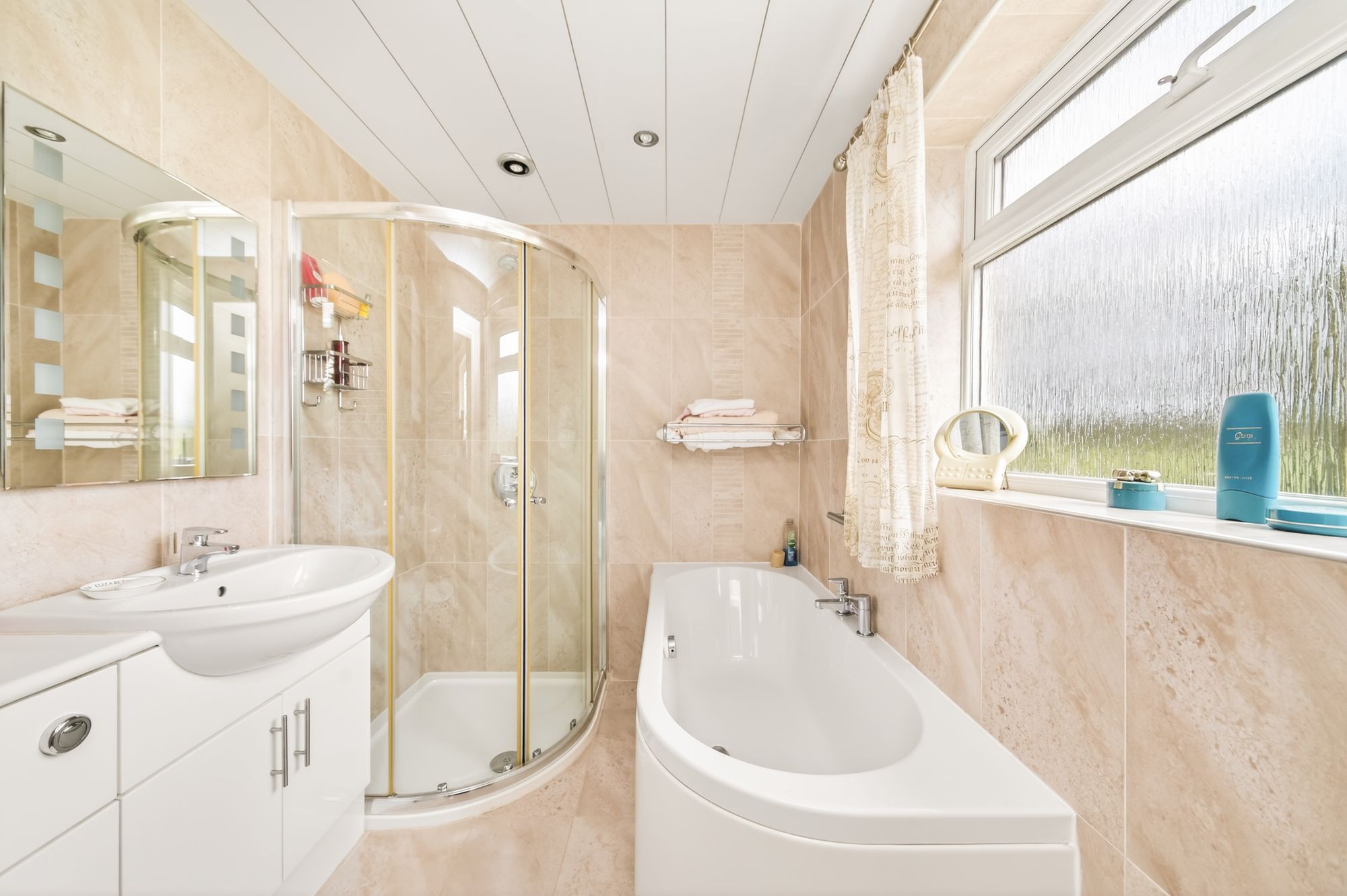 The en-suite bathroom features a modern contemporary four piece suite which comprises of a panelled double ended bath, a quadrant style shower cubicle with thermostatic shower and a low level W.C. with concealed cistern and push button flush which incorporates a broad wash hand basin with vanity cupboards beneath and chrome monobloc mixer tap above. There is attractive tiled flooring and tiled walls, a panelled ceiling with inset spotlighting, an extractor vent, a shaver point and a chrome ladder style radiator. Additionally, there is a double glazed window with obscure glass and tiled surround to the rear elevation and an LED backlit vanity mirror.